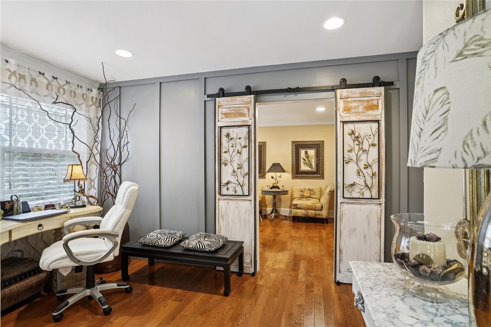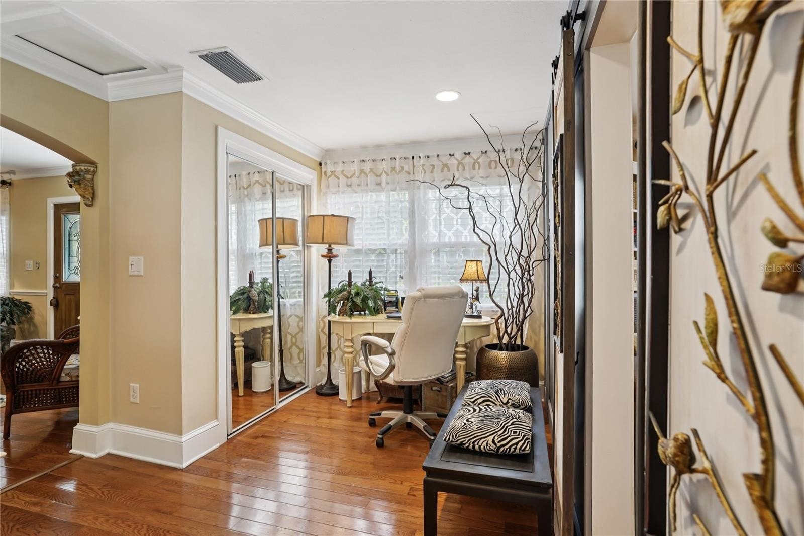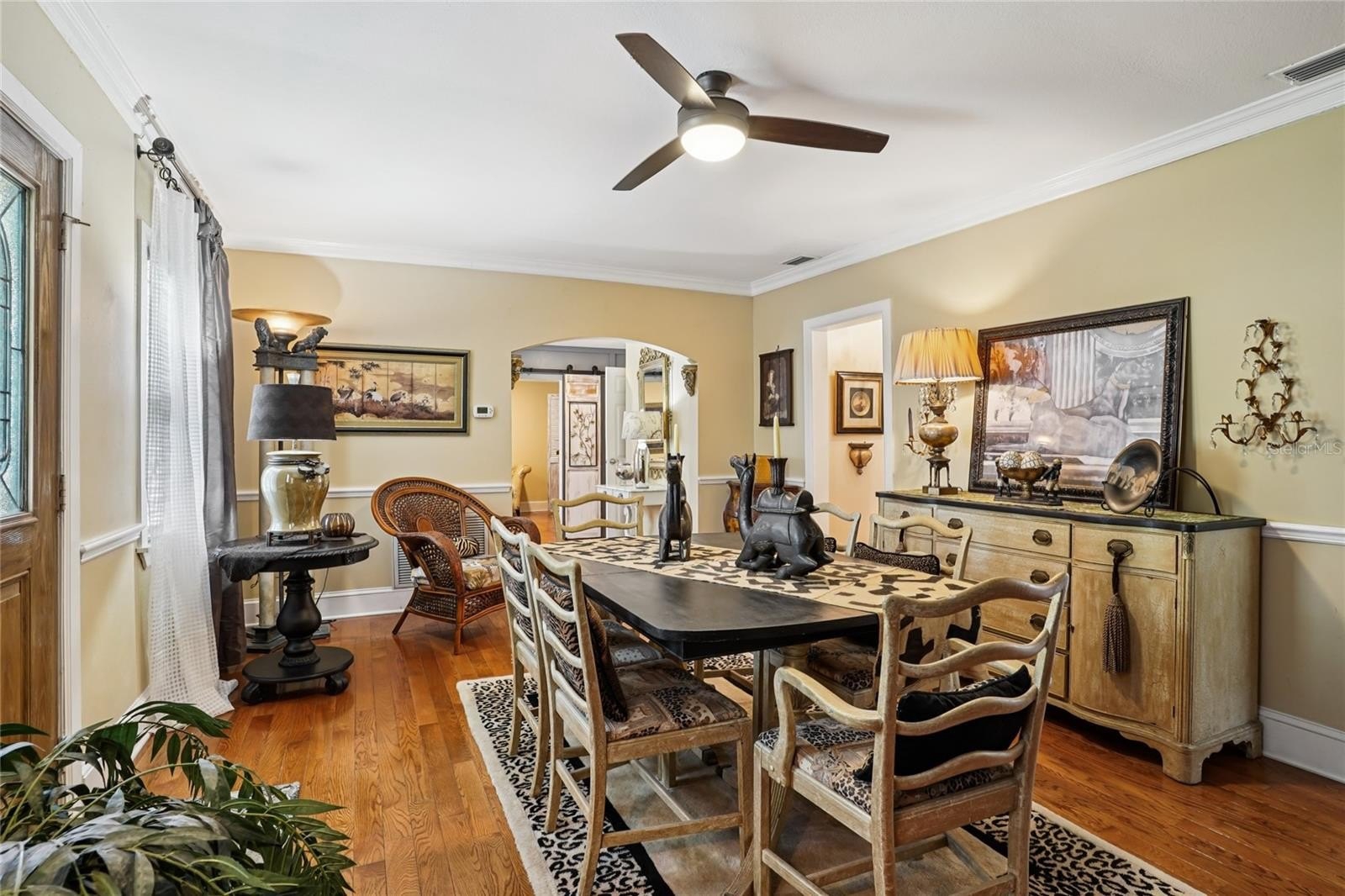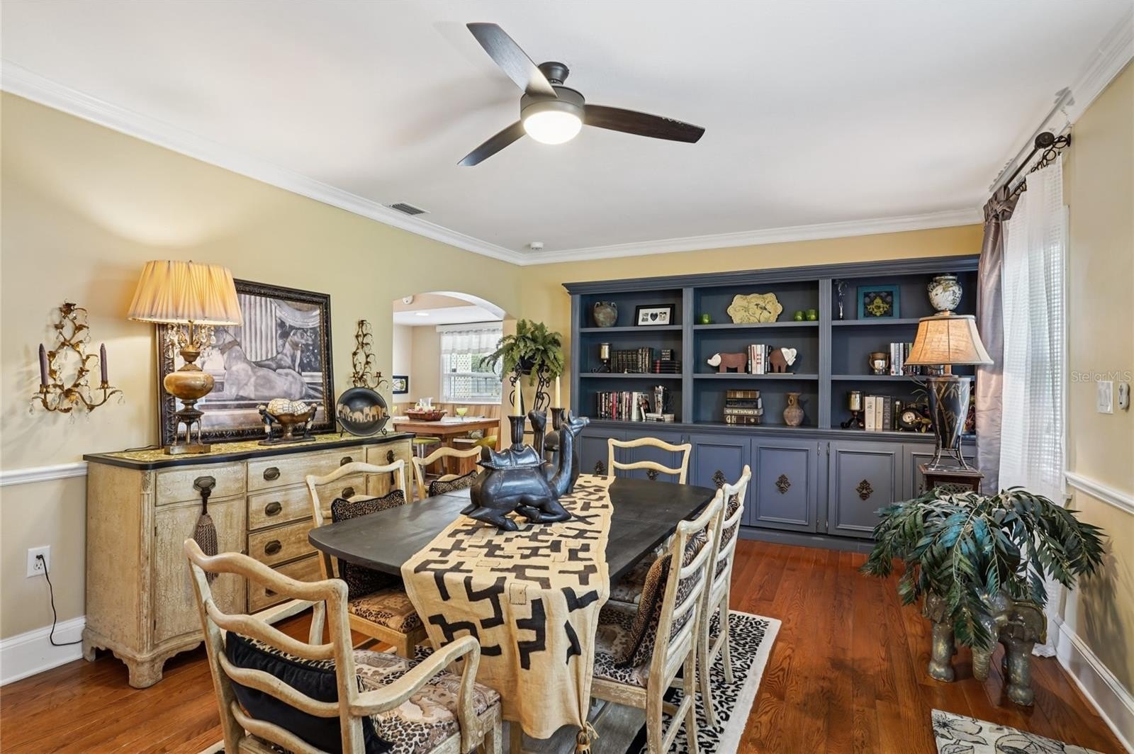 Step into a piece of Orange City history with this original 1910, dual-zoned (residential and/or commercial office) property. Beautifully updated with all of today's modern amenities without losing any of the old world charm in it's solid oak floors, chair railing, arched doorways and built-in 11' bookcase. The kitchen boasts sold wood oak cabinets with pantry (all pull-out drawers,) over and under counter lighting, quartz countertops and a beautiful built-in eating area. The bathroom has been completely remodeled while the primary bedroom has two closets including a walk-in. The large sunken third bedroom (11x18) has it's own private entrance, allowing flexibility for an office space separate from the living quarters. Energy conscious buyers will appreciate significant savings provided by the double-pane windows with wood blinds, long lasting metal roof and low average utility costs. The quiet, high and dry property has private fenced rear parking secured by an automated gate. There is a large workshop with electricity, plus private well for the sprinkler system (saving even more on utlity costs.)