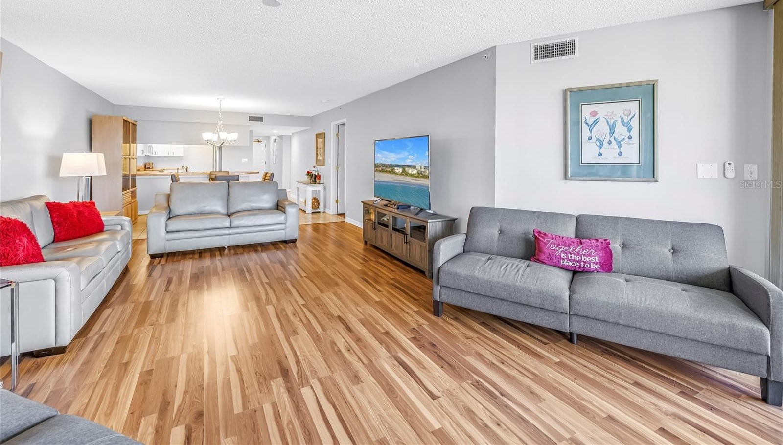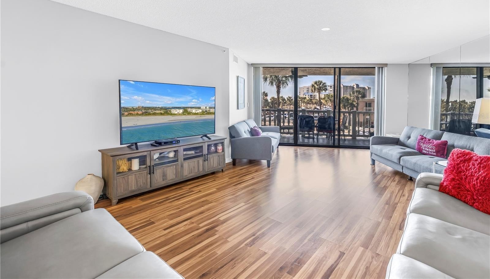 Experience relaxed coastal living in this spacious 2-bedroom, 2-bath with a 3rd sleeping quarters, residence in the waterfront community of Silver Sands. Offered fully furnished, this is a true turnkey opportunity to step right into the beachside lifestyle and start enjoying it immediately. Inside, wood-look plank and tile flooring create a cohesive, low-maintenance foundation throughout. The kitchen features stainless steel appliances and flows seamlessly into the open-concept living and dining areas, offering excellent flexibility for entertaining or simply unwinding in comfort. Step out onto the expansive private balcony and enjoy the Gulf breeze with a glimpse of the water — an inviting setting for morning coffee or evening cocktails. The primary suite provides a peaceful retreat with dual vanities and a walk-in shower. Two additional bedrooms offer generous accommodations for guests, with the third currently arranged for extra sleeping space but easily adaptable as a home office or den. Comfortable and perfectly livable as-is, the residence also presents an opportunity for a new owner to modernize and personalize at their own pace. As the lowest-priced unit currently available in the community, it represents one of the most attractive entry points into Silver Sands. Residents enjoy two heated pools and spas, tennis and pickleball courts, a clubhouse with a full kitchen, billiards room, private beach access, 24-hour gated security, and under-building garage parking — all designed to make everyday living feel effortless. Just minutes from local favorites like Sola, Rick’s Reef, and Buoy’s Waterfront Bar & Grill, along with the boutiques and weekend markets on Corey Avenue, this location places you in the heart of the St. Pete Beach lifestyle!