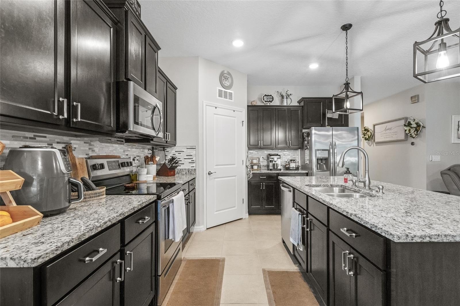 The layout is open and comfortable with a big kitchen island, granite countertops, stainless appliances, and a walk-in pantry. The living room has a custom media wall featuring an electric fireplace, wood mantel, and built-ins that make the space feel warm and finished. Throughout the home the fans and light fixtures have already been updated so nothing feels basic.