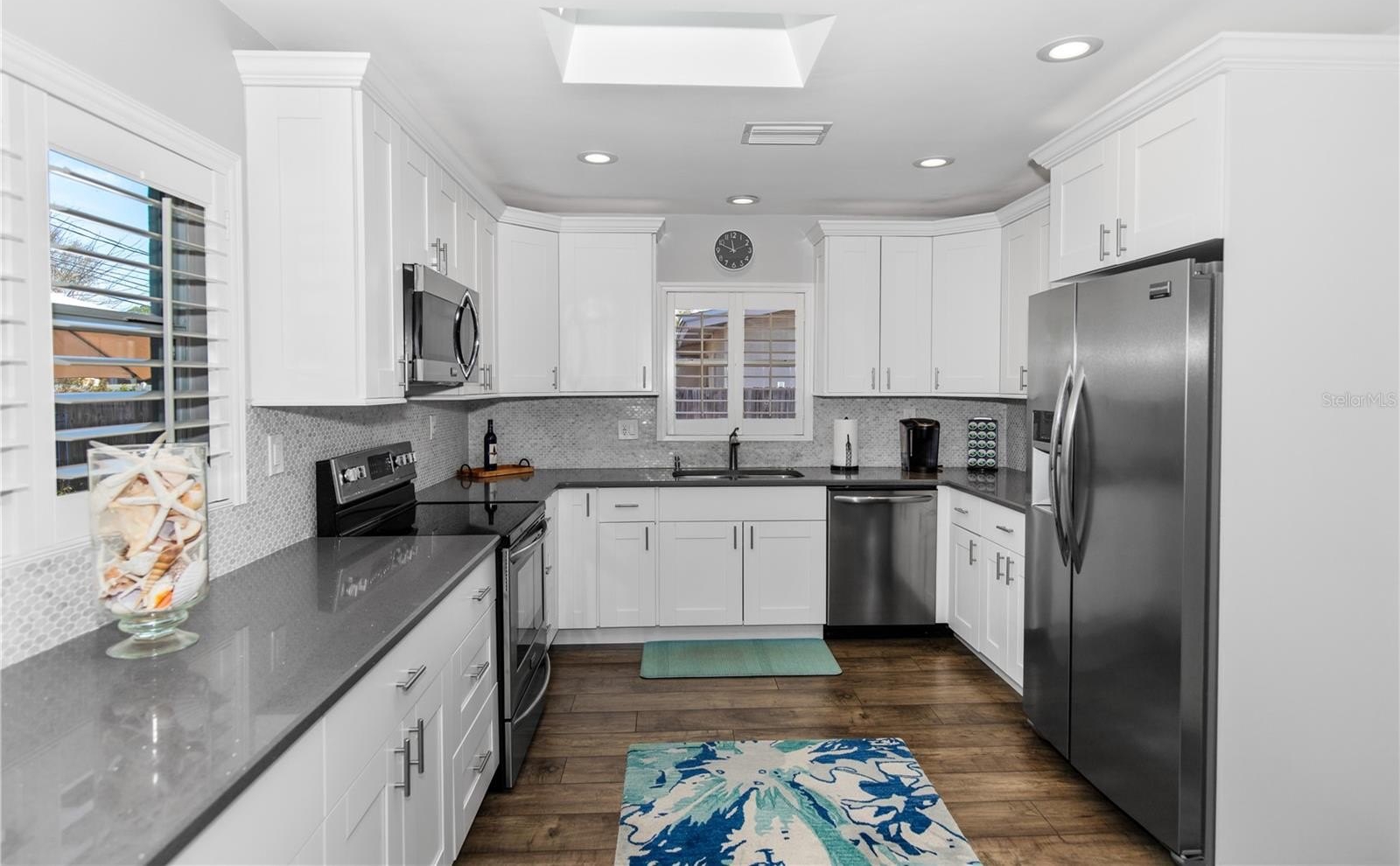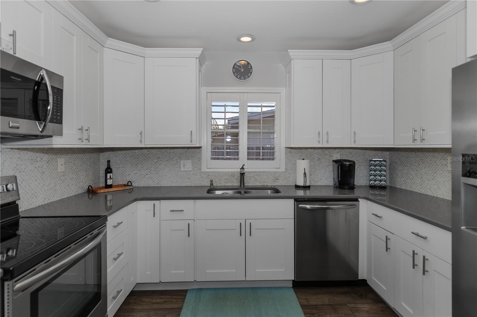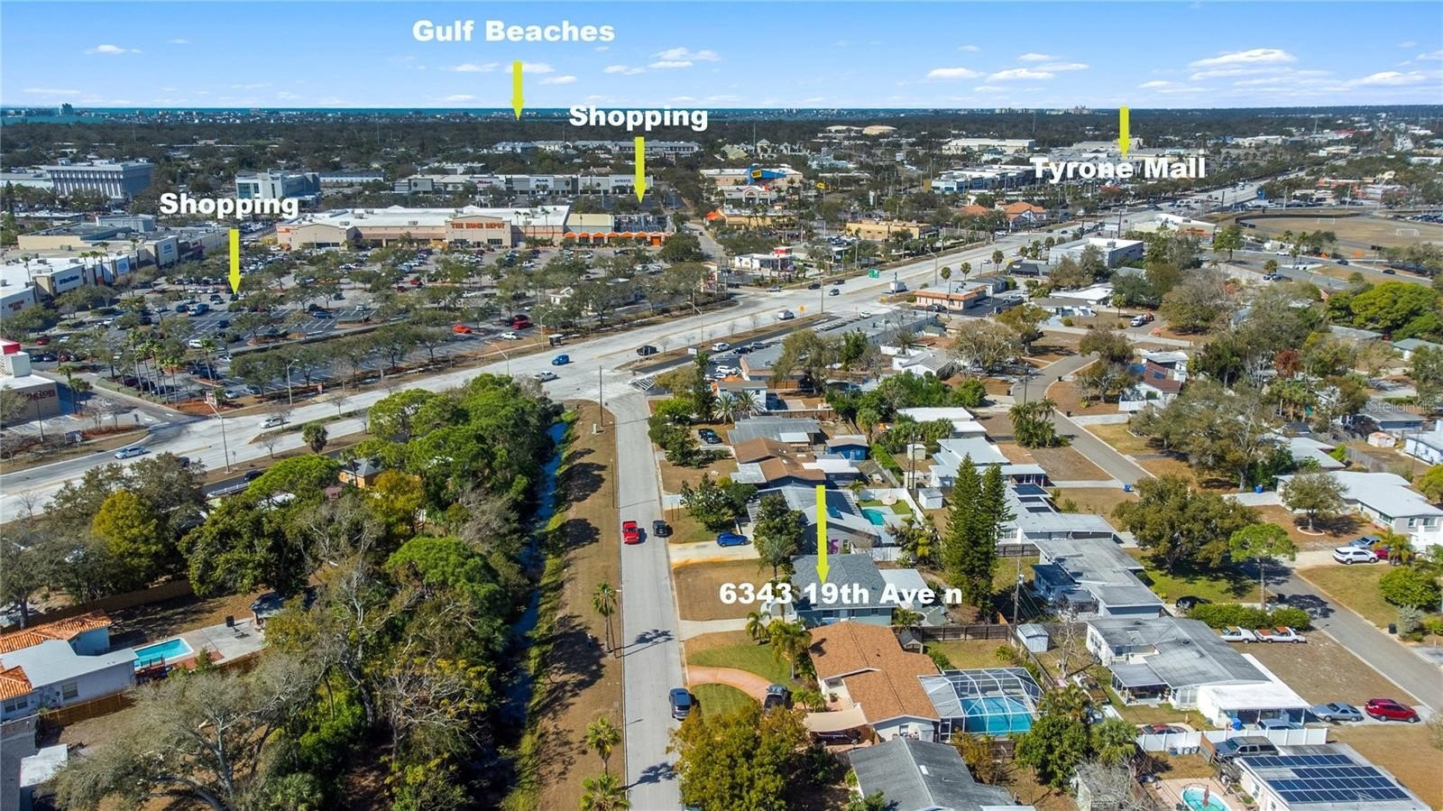 Welcome to 6343 19th Ave N in beautiful St. Petersburg! This centrally located, immaculate 2-bedroom, 2-bath, 1-car garage block home is truly move-in ready and exceptionally well maintained. Featuring a brand-new roof, fresh exterior paint, located outside of a flood zone, this home offers both peace of mind and modern comfort. From the welcoming front porch step inside to a spacious living room that flows seamlessly into the dining area and inviting Florida room. The open-concept floor plan showcases a stunning, fully renovated kitchen complete with skylight, quartz countertops, Carrera marble backsplash, wood cabinets, soft close drawers double stainless-steel sink, plantation shutters, recessed lighting and Frigidaire Gallery appliances. Perfect for cooking and entertaining. Laminate flooring runs throughout the home, and both the kitchen and main bathroom have been thoughtfully updated, allowing you to move right in without lifting a finger. The fenced backyard is designed for low-maintenance enjoyment, featuring a large patio ideal for relaxing, gardening, or hosting BBQs. With just the right blend of trees and landscaping, you'll enjoy a private outdoor retreat. Ideally situated just minutes to award-winning beaches, shopping at Tyrone Square, the vibrant downtown waterfront and the iconic St. Pete Pier, this location truly has it all.