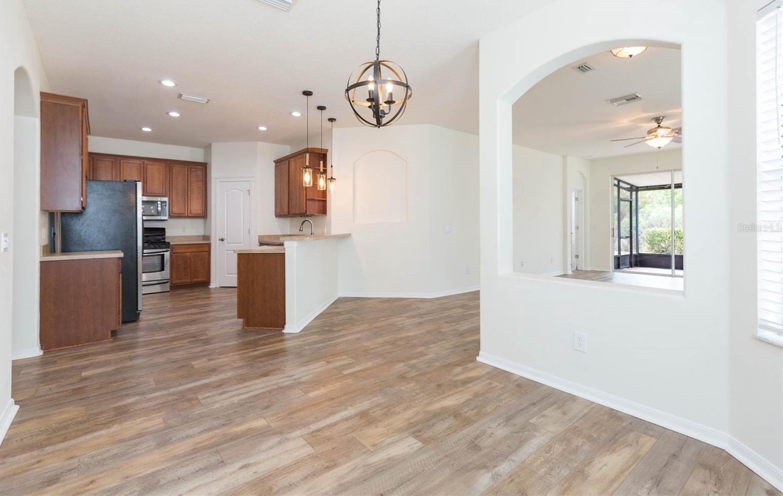 Inside, the open-concept split floor plan lives beautifully. Generously sized bedrooms provide privacy and flexibility, while the kitchen is both functional and inviting — featuring 42” cabinets with decorative molding, abundant counter space, and a walk-in pantry. The kitchen flows seamlessly into the dining area and spacious family room, where triple sliders open to a screened lanai and paver patio — perfect for morning coffee, evening wine, or simply relaxing and watching nature unfold.