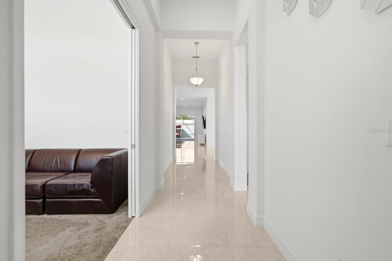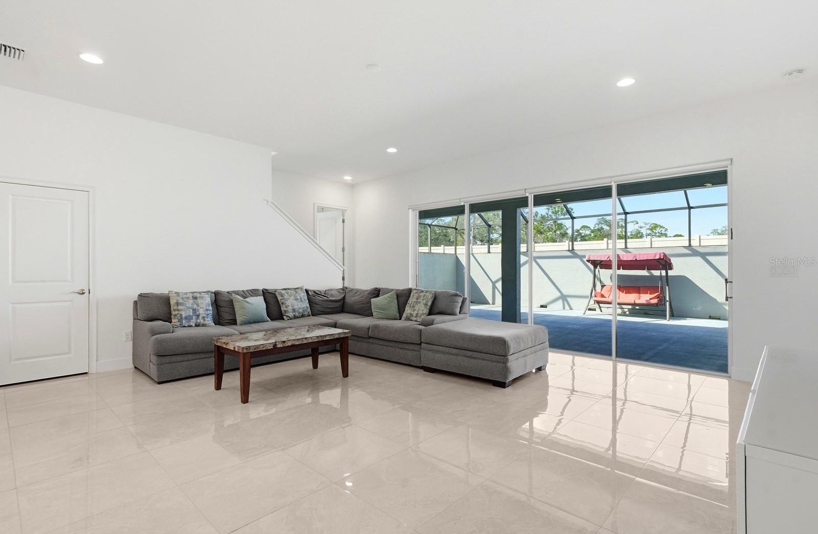 Located in the gated Woodhaven community by ICI Homes, this Costa Mesa model offers over 3,600 sq ft with 6 bedrooms plus a dedicated office and multiple living areas. The primary suite is on the main level and includes a double vanity, walk-in shower, and walk-in closet. The kitchen features upgraded cabinetry with pull-out shelving, granite countertops, an oversized island, 24-inch tile flooring throughout main living areas, and a hidden walk-in pantry, opening to a spacious living room with large sliders. Upstairs includes an expansive flex room, a bedroom with en-suite bath, and additional guest bedrooms, including two connected by a Jack-and-Jill bath. Interior upgrades include custom window treatments, plantation shutters, and remote-controlled blinds throughout. Outdoor living includes a large screened-in paver patio with summer kitchen, designed for outdoor dining and entertainingAdditional features include a brick paver driveway, 2-car garage with roll-down screen, and dual water heaters including a solar water heater and electric backup. Woodhaven offers a community pool, gated entry, zoned Port Orange schools, and nearby access to shopping, dining, parks, and major roadways.
