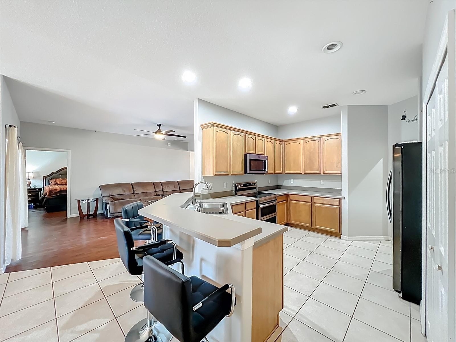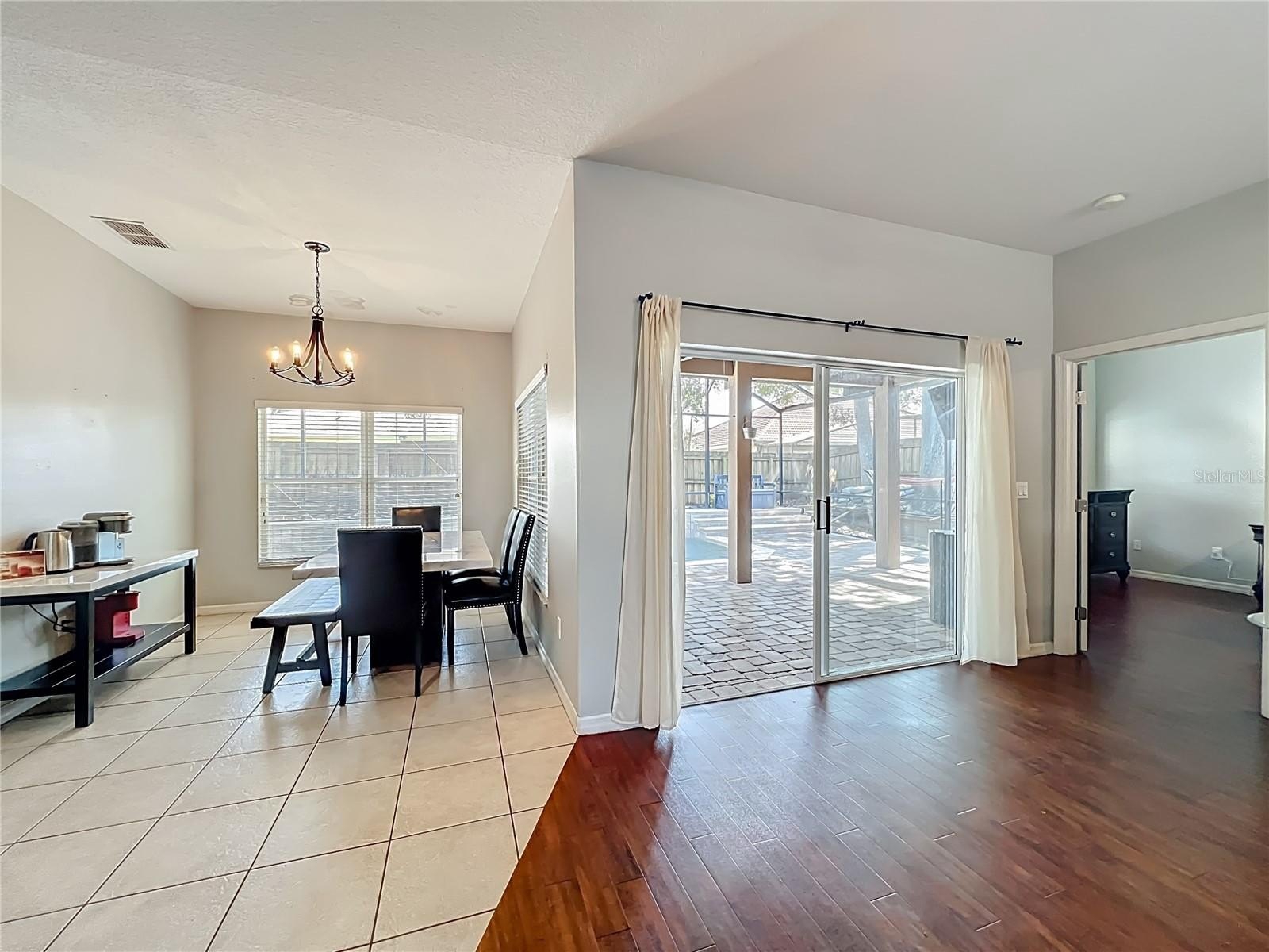 Inside, flooring throughout, showcasing top-of-the-line wood-look luxury vinyl and engineered wood. The open living and dining areas flow seamlessly into a beautiful kitchen with a cozy dinette, all overlooking the sparkling pool with a tranquil fountain. The desirable 3-way split floor plan provides exceptional privacy and ideal for working from home or hosting guests.