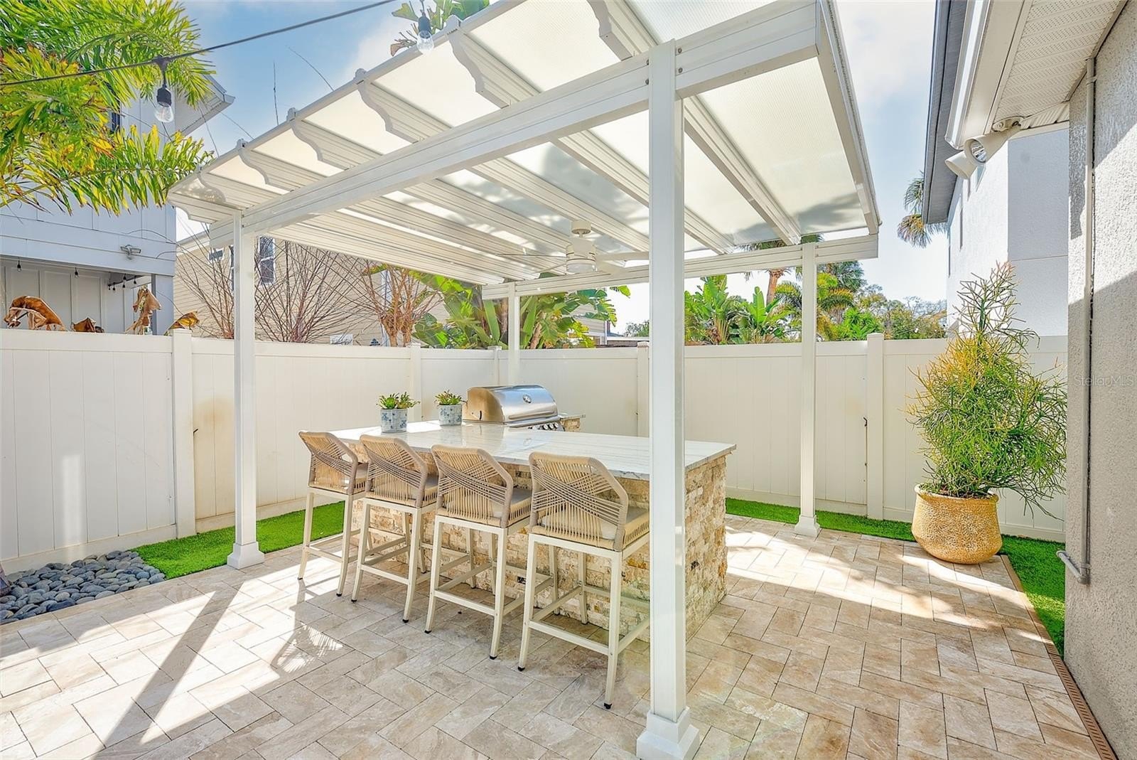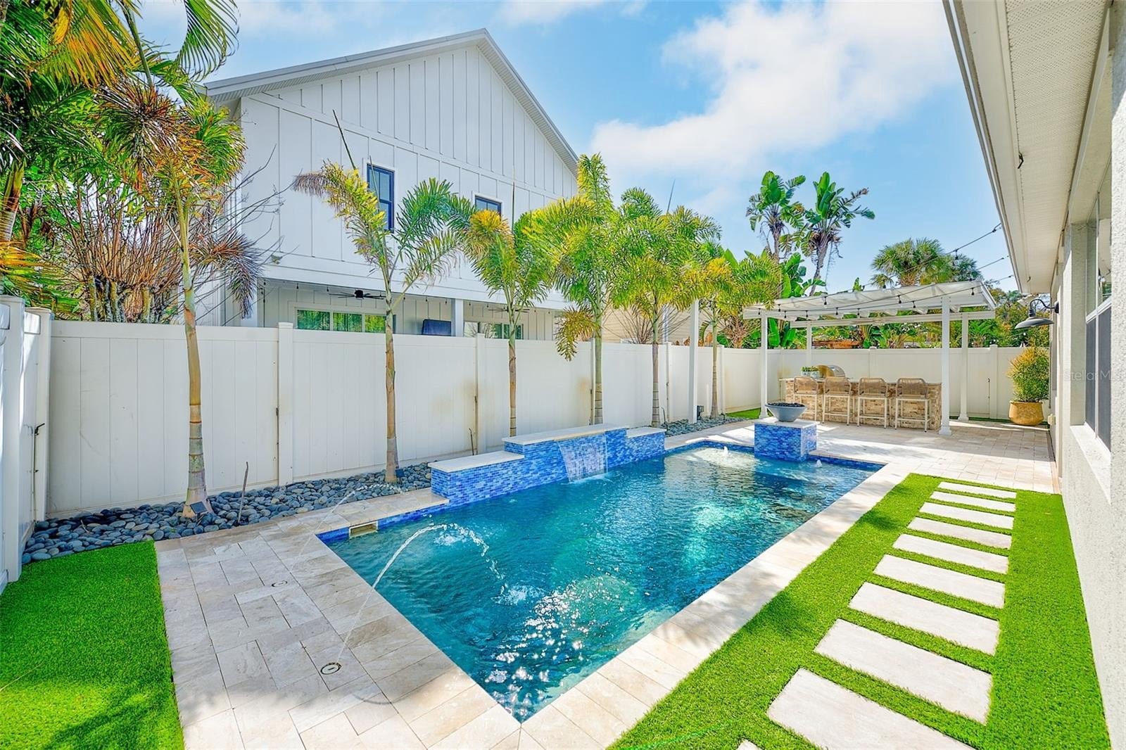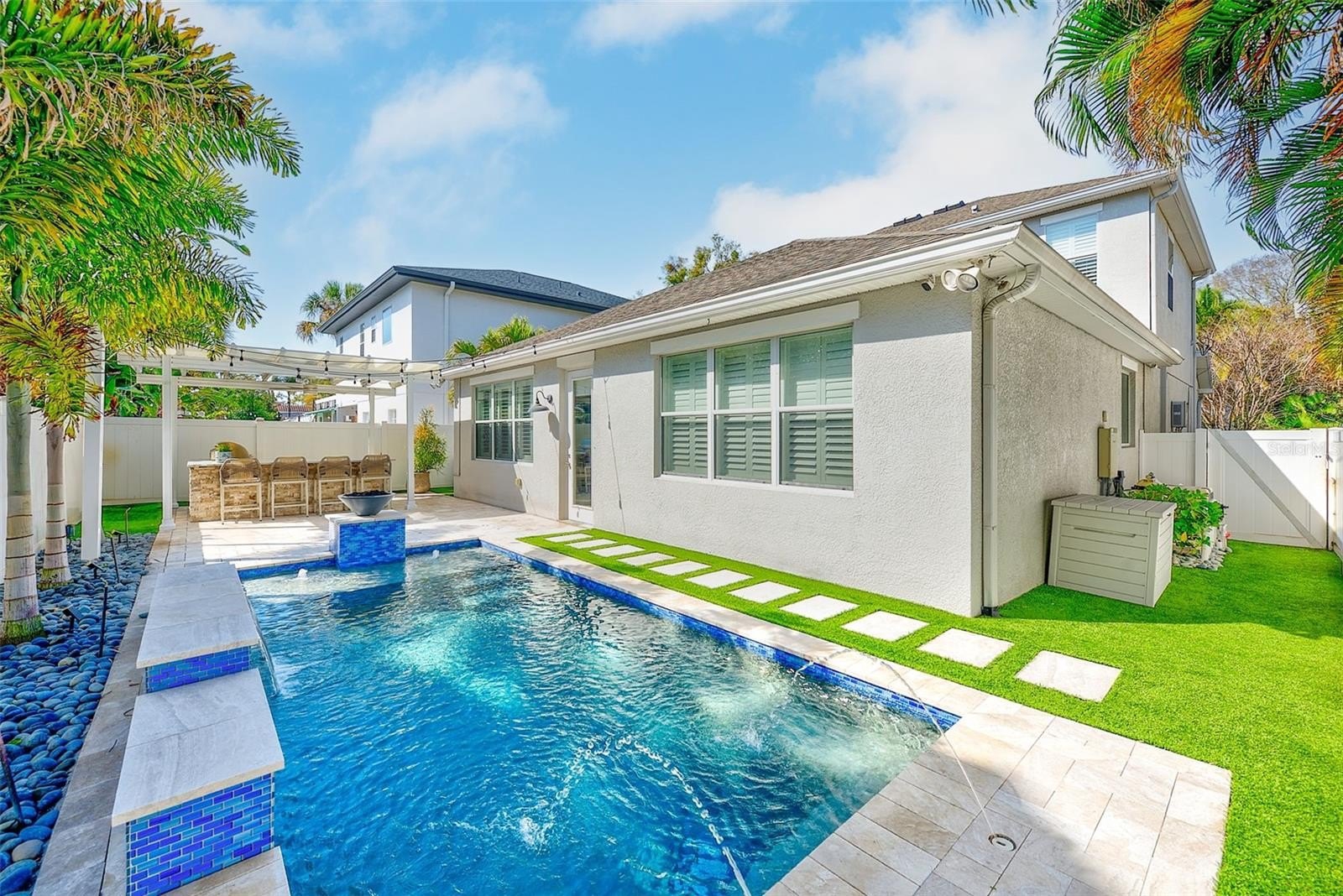 Welcome to this stunning, move-in ready Contemporary masterpiece in the heart of Palma Ceia Park — one of South Tampa’s most sought-after neighborhoods. Perfectly positioned just blocks from top-rated schools, the vibrant Palma Ceia Business and Design District, and iconic Bayshore Boulevard, this home offers the ultimate blend of luxury, comfort, and lifestyle. Step inside to soaring 10-foot ceilings, rich wood flooring, and a bright open-concept layout designed for effortless living and entertaining. The spacious first-floor owner’s suite is a private retreat featuring dual vanities, a walk-in shower, private water closet, and a generous walk-in closet. The chef’s kitchen is truly the heart of the home — showcasing a large island with wine refrigerator, abundant wood cabinetry, and premium GE stainless steel appliances, including a side-by-side refrigerator, gas cooktop, and dual built-in ovens. Whether hosting intimate dinners or lively gatherings, this gourmet space delivers both style and function. This floor plan flows seamlessly into the expansive dining and family rooms that open to your own private backyard oasis. Enjoy a heated saltwater pool with gas fire feature and a fully equipped outdoor kitchen cabana complete with a large island, gas grill, refrigerator, and ice maker. Low-maintenance turf and a mosquito misting system ensure year-round enjoyment. Upstairs, you’ll find two bedrooms connected by a Jack-and-Jill en-suite bathroom, plus a spacious guest suite with its own private bathroom, and attic access for additional storage. Additional highlights include: First-floor powder bath, laundry room, tankless gas water heater, Taexx in-wall pest control system, two-car garage with built-in storage, workbench, and Tesla wall charger. Additionally the home is equipped with a security system including cameras inside and outside. This exceptional home combines modern luxury with an unbeatable location — offering walkability, convenience, and the very best of South Tampa living. Experience elevated Florida living at its finest.