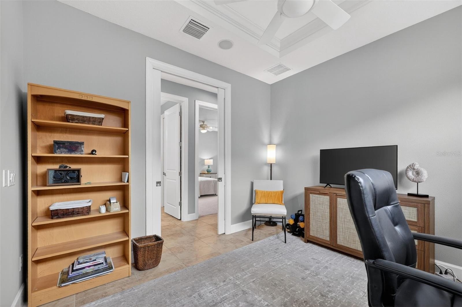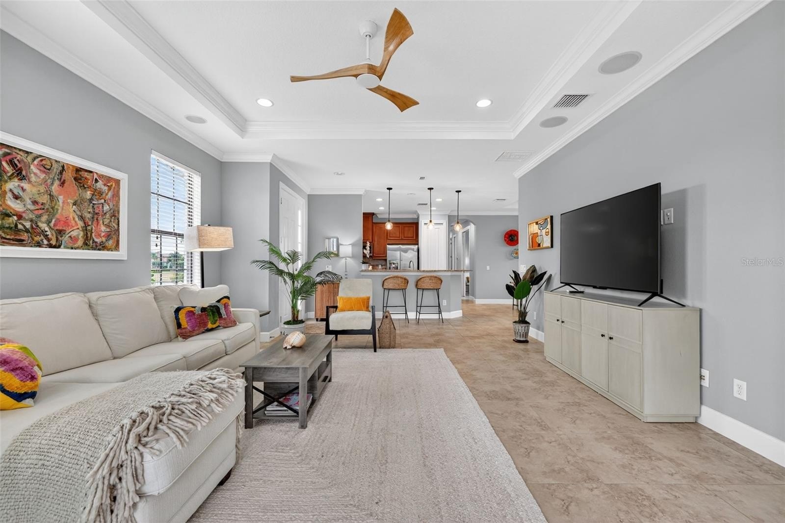 MAINTENANCE-FREE ELEGANCE WITH POND VIEWS! Welcome to your peaceful retreat in the prestigious gated community of Esplanade Golf and Country Club at Lakewood Ranch. This 2-bedroom, 2-bath home with a den is a shining example of timeless style and modern convenience, perfectly situated on a premium oversized corner lot offering tranquil lake views. As you step inside, you’re welcomed by soaring 8-foot doors, elegant tray ceilings, crown molding, and arched doorways that add architectural charm throughout. The main living areas feature tile flooring for effortless maintenance, while the bedrooms are carpeted for added comfort. The chef’s kitchen is both functional and stylish, showcasing stainless steel appliances, pull-out drawers, a spacious layout, and beautiful pendant lighting above the bar—ideal for entertaining. Impact-filmed window treatments and ceiling fans throughout provide year-round efficiency and comfort. Recent updates enhance the home's value and include attic insulation replaced in 2024 by Hughes Pest Control, a new garbage disposal installed in 2025, and a freshly painted exterior in 2025. The home is also plumbed for a future summer kitchen, and the lanai has expansion potential. Functional upgrades like gutters and recessed lighting complete the package. The spacious primary suite offers dual sinks, a walk-in closet, and a luxurious ensuite bath. The second bedroom also includes a walk-in closet, making it perfect for guests or extended stays. Residents of Esplanade enjoy access to world-class amenities including pools, fitness center, tennis, pickleball, clubhouse, and more—all within one of Lakewood Ranch’s most desirable lifestyle communities and is located in the heart of Lakewood Ranch, close to I-75, Lakewood Ranch Main St., University Town Center, Sarasota Polo Club, shopping, dining, entertainment, hospitals, cultural attractions, boating, parks and Florida's famous sandy beaches. This is a Club Home where you can pay to play golf. Glass décor in dining room and grill DO NOT CONVEY.
