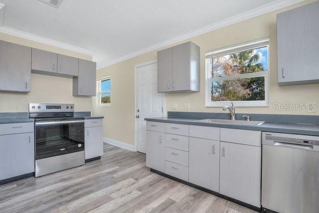 Charming Sanford Remodeled Bungalow! This 2 bedroom/1 bath has been well maintained and remodeled. Some of the many updates you will find in this home include: New Crown Molding, Base Boards, Paint Job interior & exterior, New Flooring throughout the entire house, Toilet & Tub & Vanity & Shower Head, New Windows throughout, Ceiling Fans with lights, lighting on the exterior of the house, New Kitchen Cabinets, New Refrigerator, New Dishwasher & New Stove/Oven, New Doors throughout the entire house including the front and back door, New front porch & Deck, New Electrical Panel, New Hot Water Heater, Sinks and the Kitchen Sink has a new Garbage Disposal, Insulation installed in the attic and all brand new ductwork installed in the Attic. This home is move in ready! Located minutes to downtown Sanford great shopping and restaurants.....and don't miss the massive lot which provides endless options. At this price the home will not last don't miss out.
