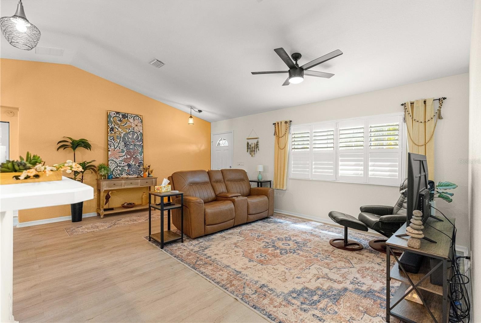 Welcome to this beautifully maintained and thoughtfully updated 2 bedroom, 2 bath Chesapeake floor plan. Located in the highly desirable 55+ Del Webb Spruce Creek Golf & Country Club. This stucco home offers 1,555 sq. ft. of living space, including the light filled Florida room, perfect for relaxing or entertaining. From the moment you arrive, you’ll notice the outstanding curb appeal, complete with a painted driveway and walkway, updated landscaping with concrete curbing, and a corner lot setting. Inside, the open floor plan is enhanced by a vaulted ceiling, recessed lighting, fresh interior paint, and a split floor plan. Interior highlights include Luxury vinyl plank flooring throughout (guest bedroom carpeted for comfort), newly purchased stainless steel appliances, plus washer and dryer (2025). White cabinetry with pull-outs, tiled back splash, and large farm style sink in the kitchen. Updated bathrooms, including an en-suite with a beautiful walk-in shower and new fixtures. Plantation shutters, updated lighting, and ceiling fans throughout, The primary suite features a bow window for added space, plus a large walk-in closet with custom organizers. Enjoy seamless entertaining with the open Florida room, kitchen pass-through, and a private outdoor patio-perfect for morning coffee, grilling out, or evening gatherings. Major updates for peace of mind are roofing re-shingled (2022) HVAC (2013), and new gutters with leaf guards (2025) for low-maintenance living. This home combines modern updates with a highly functional layout, all within a vibrant community offering golf, recreation, and endless amenities.