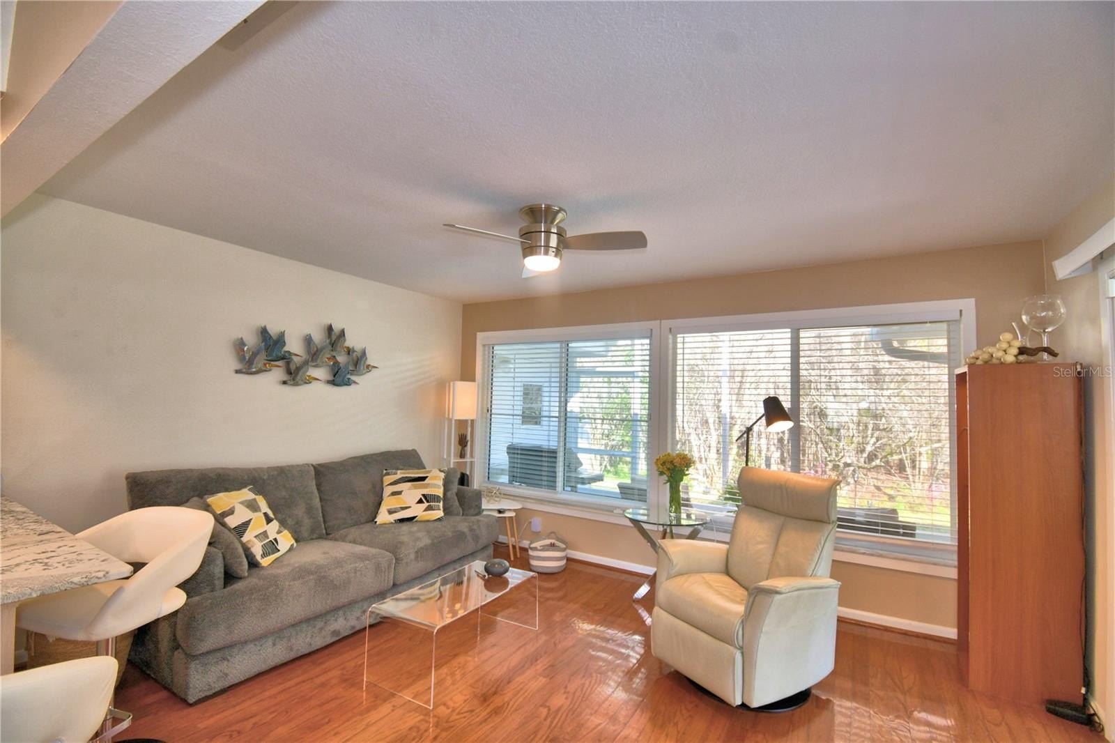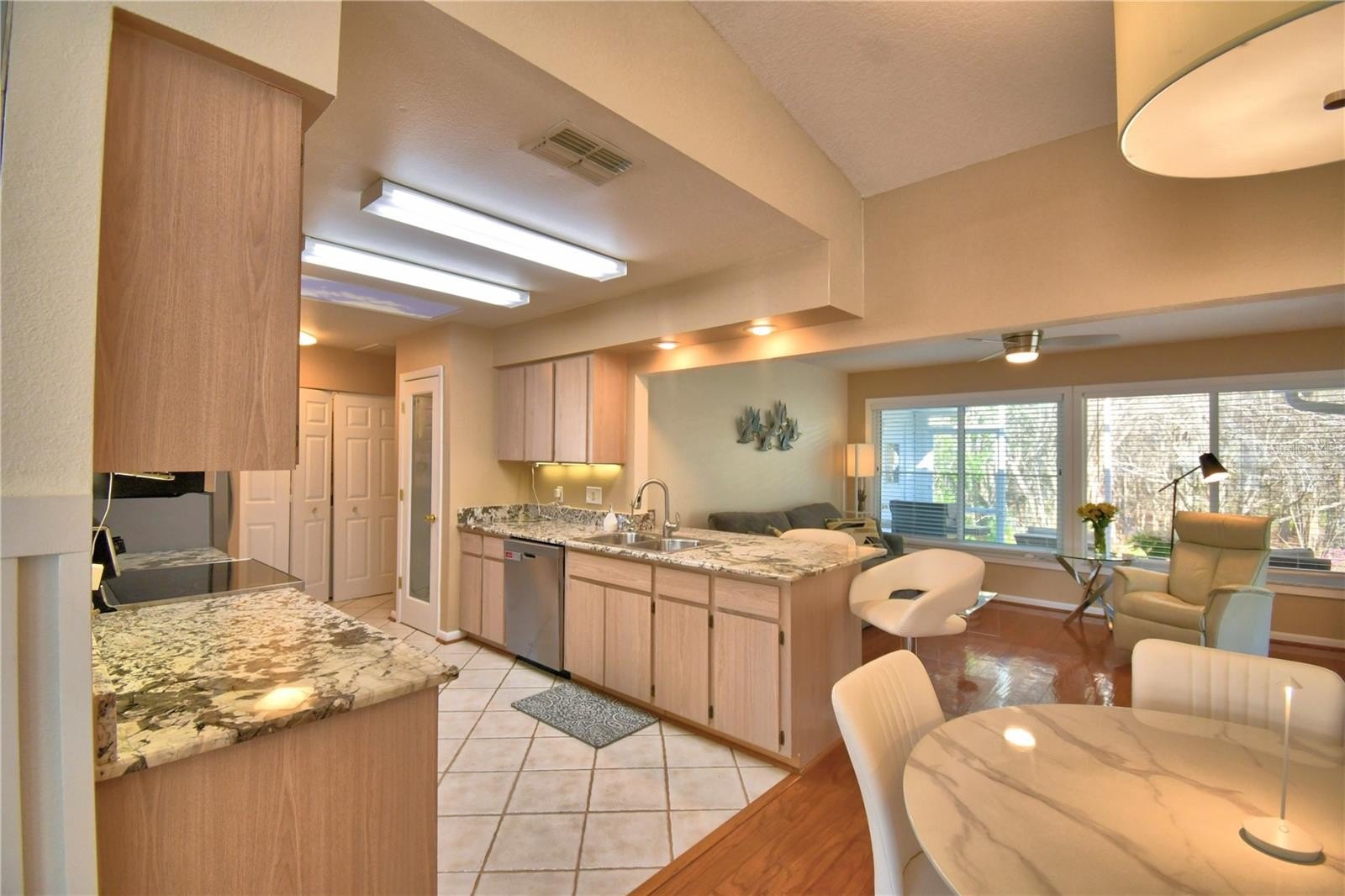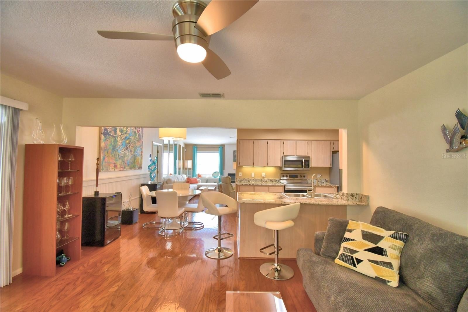 As you enter, the home opens effortlessly, drawing you through the living space where a built-in electric fireplace anchors the room, beautiful hardwood floors, and a room flowing seamlessly into the dining area and kitchen. Granite countertops catch the light, while the pantry and laundry closet keep everything close at hand.