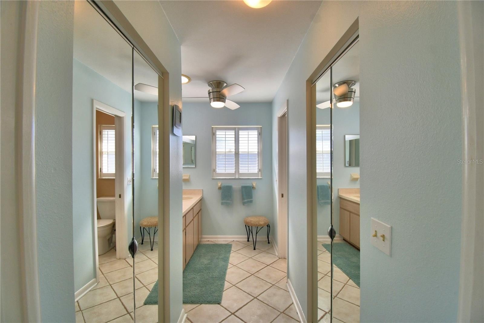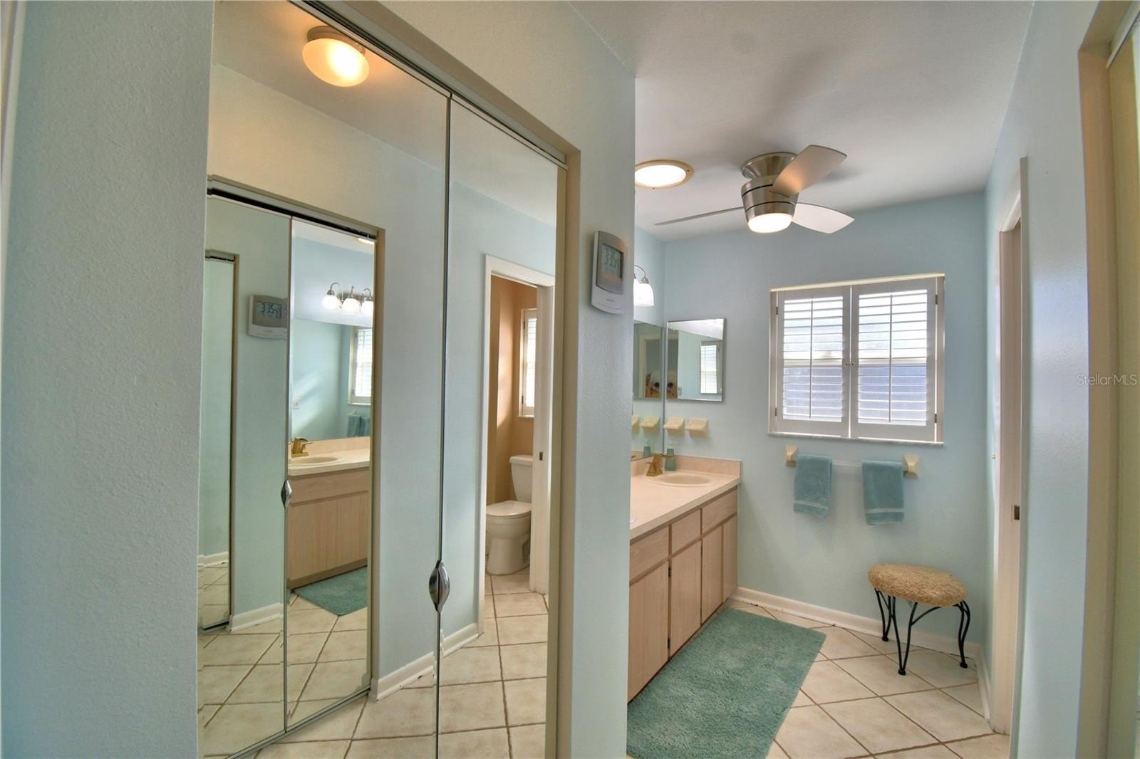 The primary suite invites you forward, where sliders lead directly to the expansive, fully enclosed lanai—perfect for morning coffee or evening relaxation. Inside the suite, you’ll pass a walk-in closet and linen storage, arriving at an en-suite bath featuring dual vanities and an updated walk-in shower. Situated on the opposite side of the home from the primary suite, the second bedroom offers privacy and comfort and is accented with classic plantation shutters and Jack and Jill bathroom.