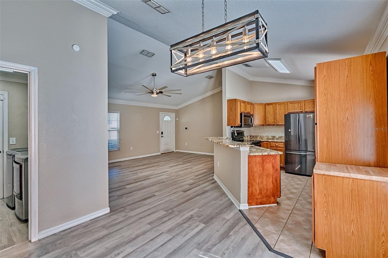 This well-maintained 3-bedroom, 2-bath home features a desirable split floor plan, 2-car garage, and a spacious great room with cathedral ceilings open to the kitchen and dining area. Luxury vinyl plank flooring runs throughout, with tile in the kitchen and bathrooms, which offer upgraded wood cabinetry and granite countertops. Designer light fixtures and extensive crown molding highlight the quality craftsmanship throughout the home. The owner’s suite includes a walk-in closet and walk-in shower. Enjoy the oversized, private backyard with plenty of room for outdoor living. Washer and dryer are included. Major updates include a new roof and HVAC in 2023, new appliances in 2020, fence replacement in 2024, and septic pumped in 2025.