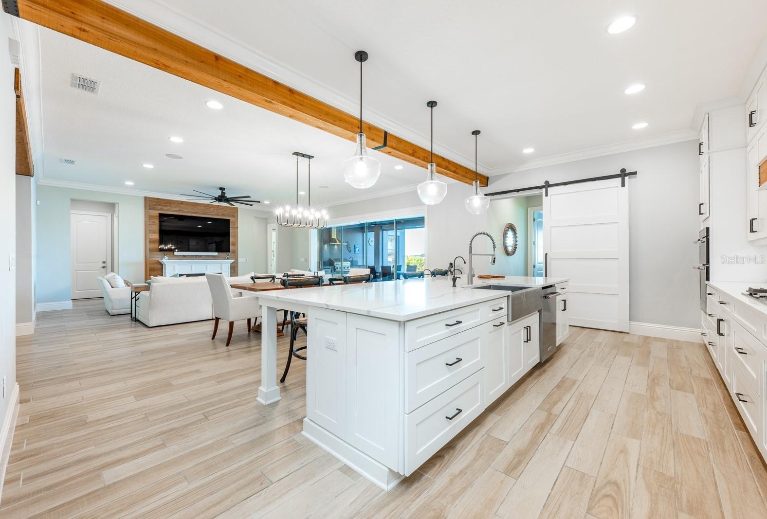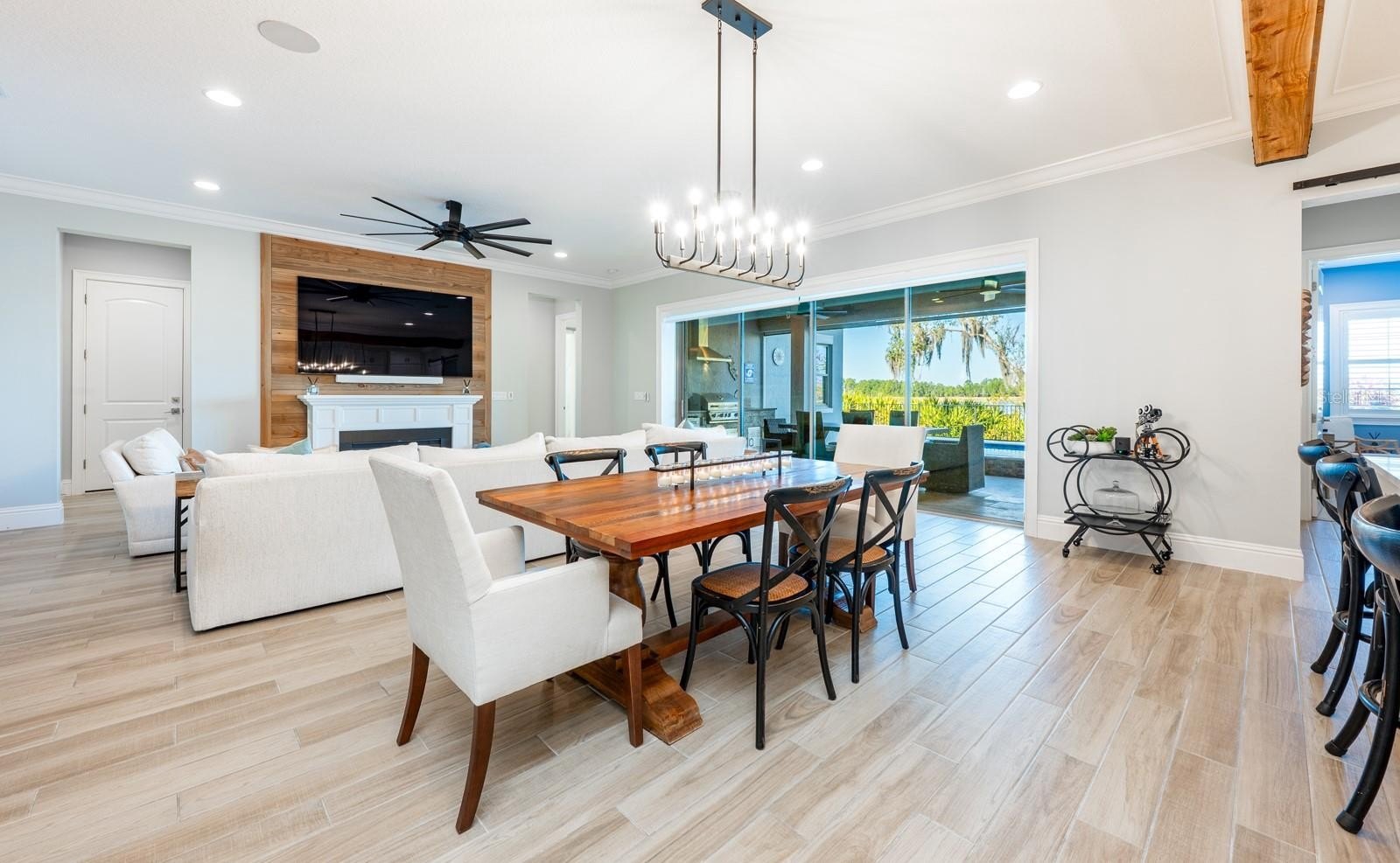This is more than a house ~ it is a fully furnished, turnkey lakefront retreat designed to stop you in your tracks the moment you walk through the door! Perfectly positioned on Hickorynut Lake within the exclusive Avalon Cove, this custom Jones Homes residence was built in 2022 and is one of only 49 homes in this intimate luxury enclave. From the instant you enter, you are met with a rare “water-on-water” moment – breathtaking panoramic lake views that frame the entire living space and set the tone for everything that follows. Designed for effortless living and unforgettable entertaining, the home is being sold fully furnished with high-end Pottery Barn collections, allowing you to unpack your bags and immediately dive into the lake life. Expansive sliding glass doors dissolve the line between indoors and out, opening to a resort-style backyard featuring a saltwater pool, heated spa, pool ledge loungers, integrated lighting, and a pool crawler cleaning system. Motorized lanai screens, a built-in outdoor kitchen with gas grill, and a gas firepit create the ultimate sunset and entertainment zone – complete with water views and space to gather - there or on your private dock! Inside, the chef’s kitchen anchors the home with an oversized island seating up to eight, custom wood vent hood, gas cooktop, designer finishes, barn door accents, and thoughtful upgrades throughout. Custom wood beams add warmth and architectural interest, while the open layout flows seamlessly to living, dining, and outdoor spaces – ideal for hosting or relaxing in style. Luxury meets intelligence with over $30,000 in smart home upgrades, including full Alarm.com automation, indoor and outdoor security cameras, remote access controls, Sonos audio, and Bluetooth sound zones throughout the kitchen, living room, loft, lanai, and balcony. Motorized shades on both floors provide privacy and convenience at the touch of a button. A reverse osmosis water system enhances everyday living, and the first-floor laundry adds to the home’s thoughtful functionality. Both primary suites are beautifully appointed with brand-new luxury furnishings, a spa-inspired primary bath, and a custom walk-in closet. A dedicated air hockey gaming room offers a turnkey entertainment space – perfect for guests, family fun, or rental appeal. Step onto the front-facing balcony in the evenings and enjoy nightly Disney fireworks, a magical reminder of how close you are to it all. The epoxy-finished three-car garage includes an additional storage bay, offering space for vehicles, toys, and lake-life essentials. Outside, low-maintenance AstroTurf landscaping keeps the focus on enjoyment, not upkeep. Just minutes from Disney theme parks, shopping, dining, and with easy access to SR-429, this home is approximately 30–40 minutes from Orlando International Airport, making it ideal as a primary residence, second home, or luxury retreat. Comfortable, elevated, and completely move-in ready – this is lakefront living done right! Call today to schedule your tour and let us welcome you home!