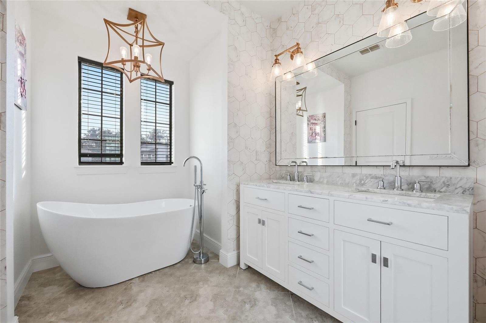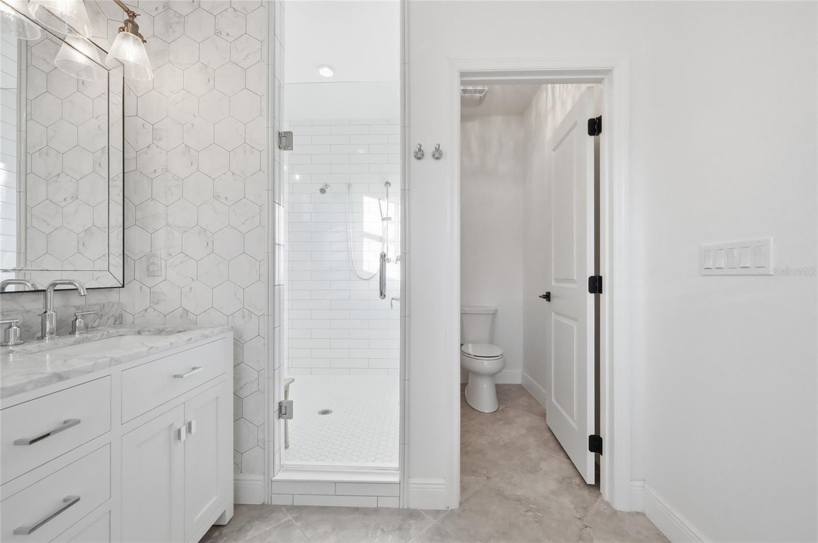 The second story features a split floor plan with the primary suite just next to the stairway separated by a full laundry room, secondary bathroom, and two spacious secondary bedrooms. Your luxurious primary suite is filled with natural light by 3 large windows overlooking the neighborhood, with a primary bathroom that includes a large separate tub, walk-in shower, dual vanity, and stunning quartz countertops. Ample closet space and storage is included in the second story corridor, as well as a dedicated laundry room and folding table. Your full secondary bathroom includes dual vanities as well, and each secondary bedroom enjoys stunning nature and neighborhood views.