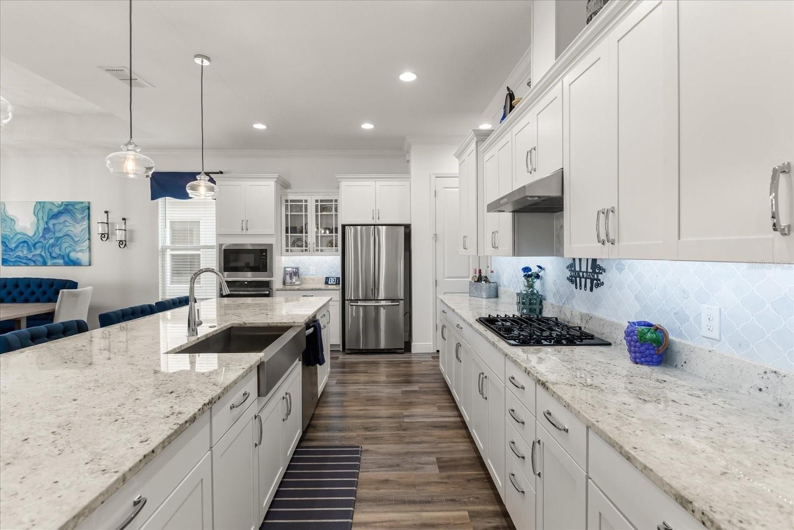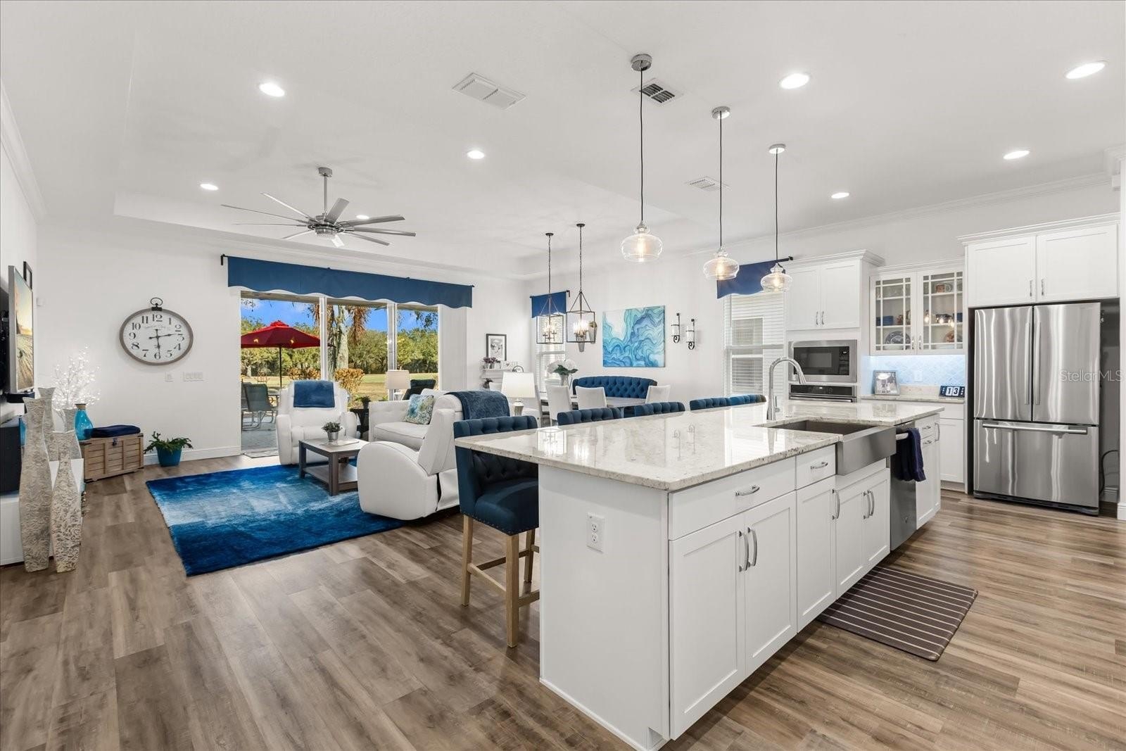 Welcome to the Four Seasons at Orlando – Where Resort Living Meets Everyday Luxury! Nestled within Orlando’s premier 55+ guard-gated community, this stunning home is situated on the famed Mystic Dunes Golf Club. Built in 2019 and offering just over 2,000 square feet, this exceptional 3-bedroom, 2-bath residence is perfectly positioned on a quiet cul-de-sac with sweeping golf course views. From the moment you arrive, the paved driveway and manicured setting set the tone. Inside, luxury vinyl plank flooring flows through the main living areas, complemented by plush carpeting in the bedrooms. Crown molding, tray ceilings, and designer finishes elevate every space. The wide-open floor plan centers around a stunning bright white kitchen featuring Shaker-style cabinetry, stone countertops, a built-in oven and cooktop, walk-in pantry, and an enormous island designed for gathering. A built-in office/workspace greets you at the entry — ideal for remote work or organization. An extra-wide sliding glass door frames the golf course beyond, filling the home with natural light and seamlessly connecting to the covered, paved back porch. The primary suite is a true retreat, overlooking the course and offering a spa-inspired bath with glass-enclosed shower, double vanity, private water closet, and an oversized walk-in closet. Secondary bedrooms are generously sized, and both bathrooms showcase beautiful tile detail and stone countertops. The laundry/utility room includes, shelving, and a utility tub for added functionality. The backyard features a covered lanai and extended paver patios overlooking serene mature landscaping and a breathtaking golf course view and is also pre-wired for a custom pool. The home is equipped with a whole home water filtration system. Located minutes from Walt Disney World, major highways, shopping, and dining — and just a couple hours from Florida’s pristine east and west coast beaches — this home delivers luxury, convenience, and lifestyle in one extraordinary package. This is not just move-in ready. This is a showpiece.