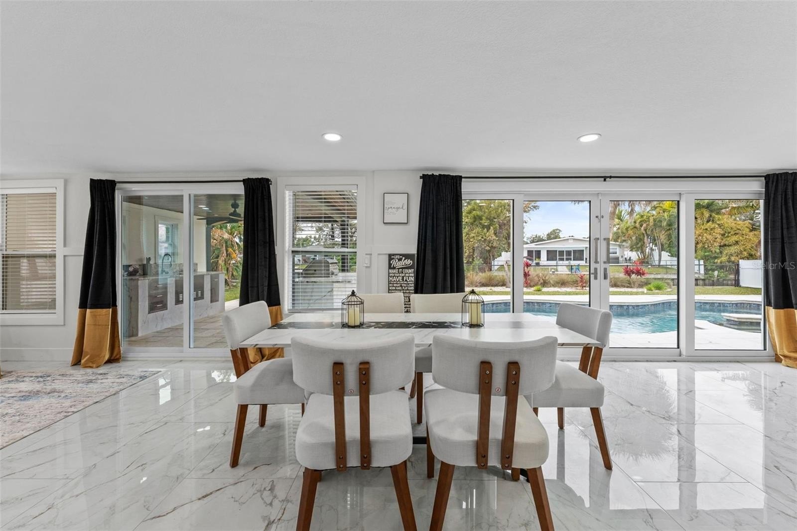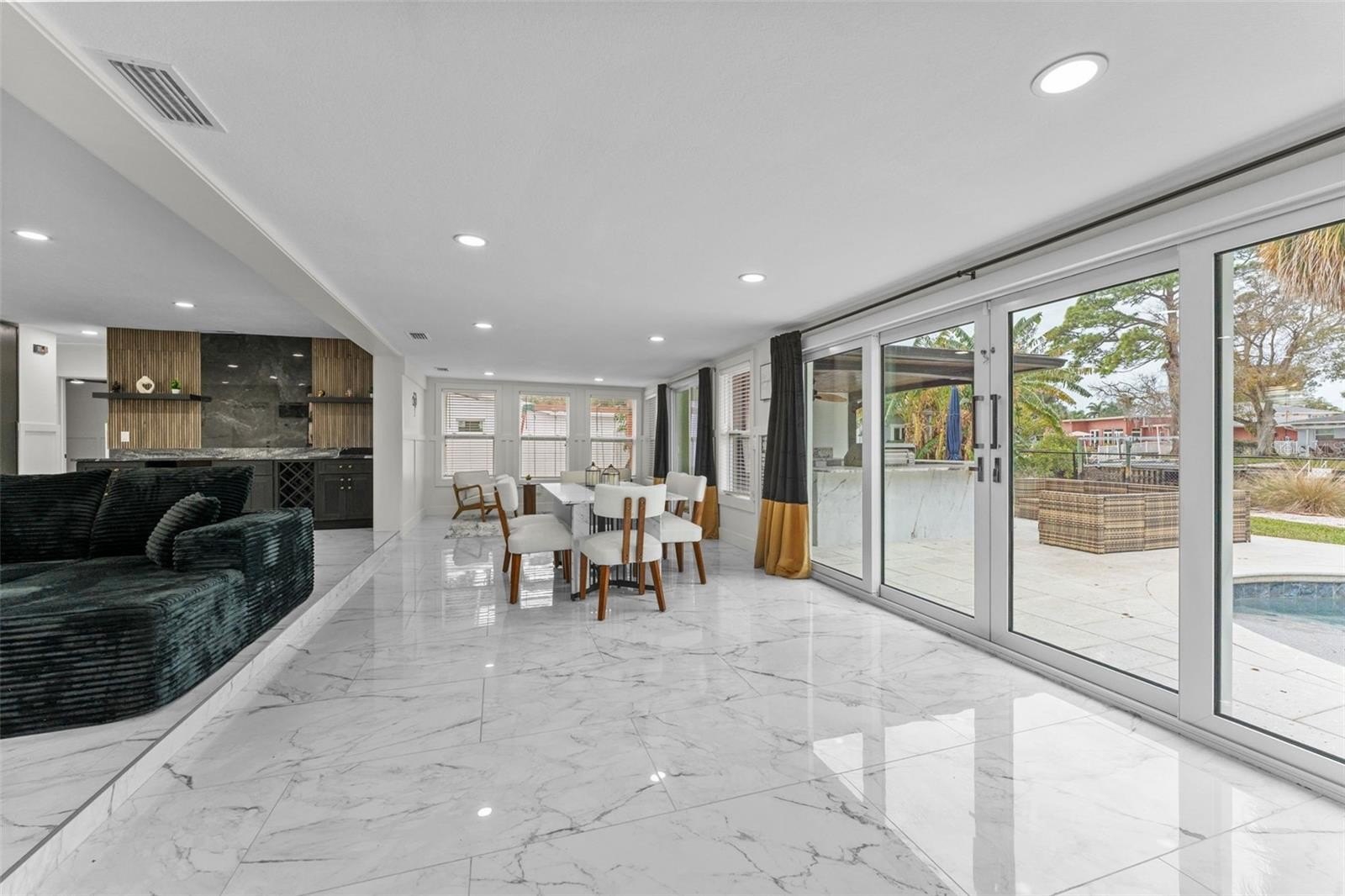 The main living area is anchored by a custom-designed entertainment feature wall with recessed shelving and a sleek electric fireplace, creating a refined yet inviting gathering space. An enclosed Florida room extends toward the water, offering a versatile setting to dine, unwind, or enjoy tranquil pool views year-round.