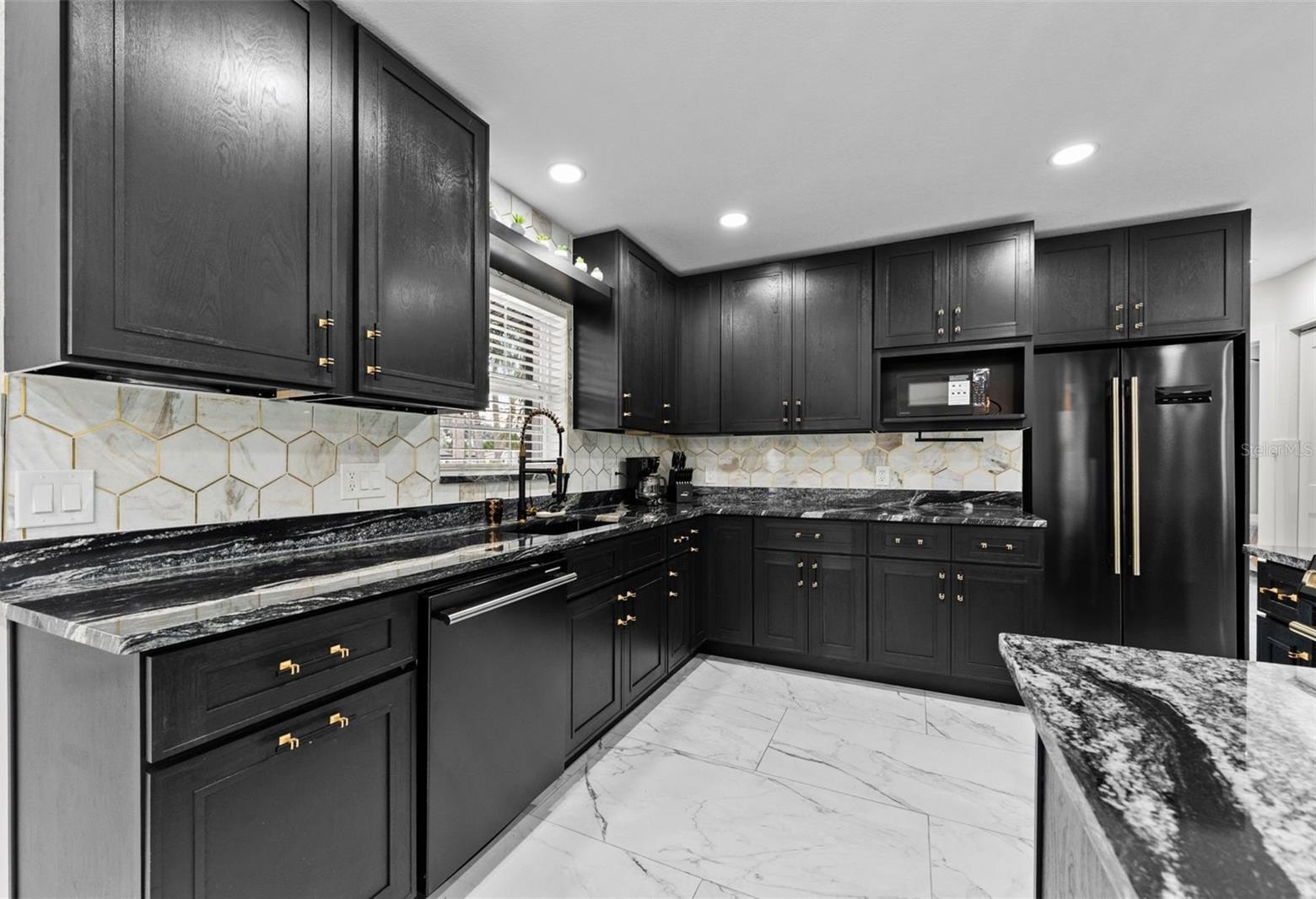 Natural light fills the open-concept interior, highlighting elevated finishes and carefully curated design details throughout. The chef’s kitchen serves as the centerpiece of the home, featuring custom cabinetry, granite countertops, premium appliances, and a statement tile backsplash with warm metallic accents. A custom wet bar with wine storage, beverage cooler, and additional cabinetry enhances the home’s effortless flow for entertaining.