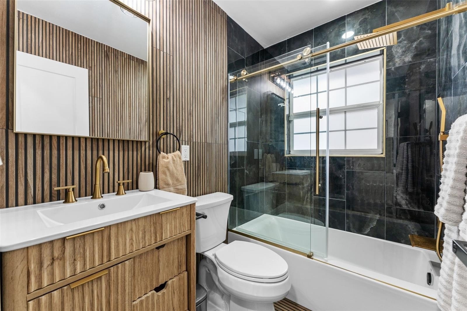 The primary suite serves as a private retreat, complete with a spacious walk-in closet and spa-inspired bath showcasing dual vanities, frameless glass shower doors, and a dual rainfall shower with custom LED niche detailing. Two additional bedrooms provide generous storage and share a beautifully updated secondary bath with modern tilework and refined finishes.