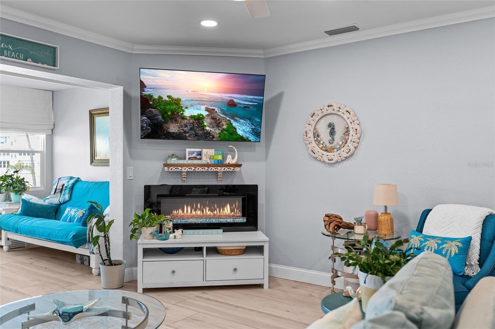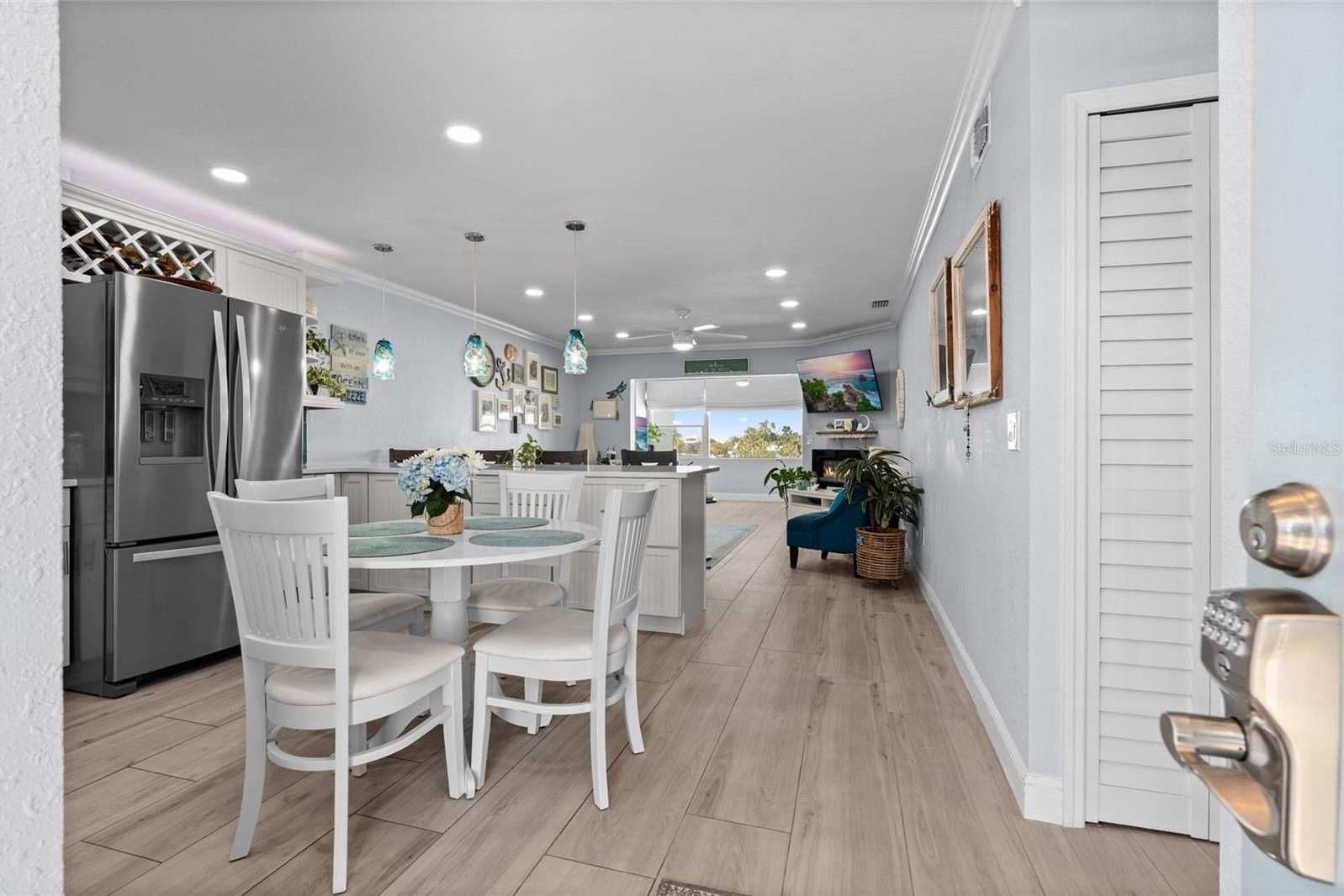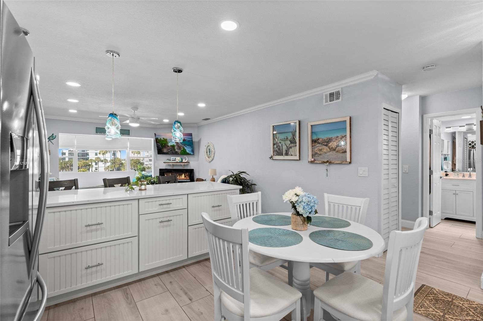 Top-floor waterfront living in this beautifully renovated 55+ residence featuring breathtaking water views from all sides. This light-filled condo offers an open, airy layout with newer impact rated hurricane windows and complete renovation. Major updates include plumbing, electrical, and roof, providing peace of mind. The interior showcases coastal inspired finishes, updated tile flooring, designer lighting, and a thoughtfully redesigned kitchen with gas cooking and modern upgrades. Enjoy elevator access and resort-style community amenities including a waterfront pool, shuffelboard courts, a pier to take in the sunsets, fishing, paddleboarding or kayaking along the intracoastal waters. The community also affers a clubhouse and small gym.