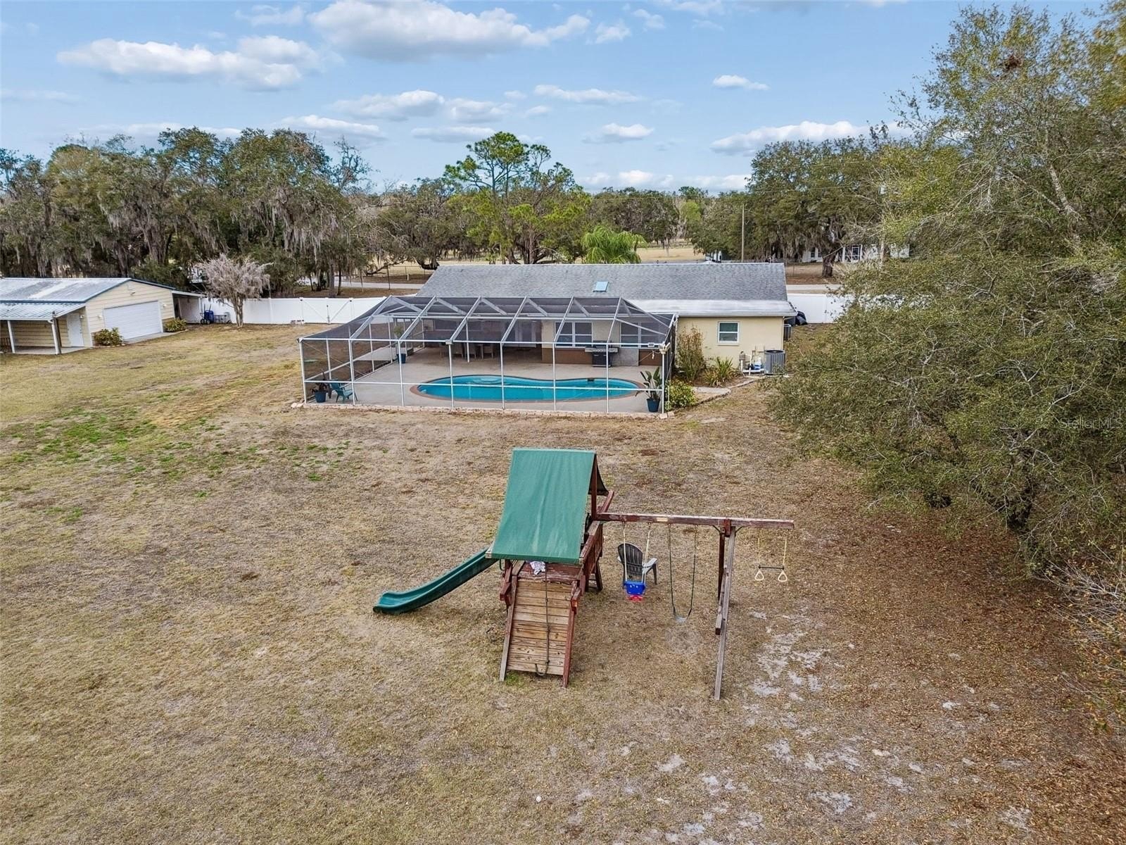 Golden Acres Lakefront Pool Home on 1.76 Acres with Detached Workshop!!! Discover the perfect blend of space, privacy, and waterfront living in highly desirable Golden Acres. This 3 bedroom, 3.5 bath home sits on 1.76 fully fenced acres with a private dock, offering peaceful lake views and room for animals, outdoor hobbies, or simply wide-open space. The screened-in pool creates a relaxing backyard retreat, while the 2-car attached garage and separate detached garage/workshop provide exceptional flexibility for RV storage, boats, equipment, or creative projects. Whether you’re looking for room to roam, space to garden, or a property that supports a more self-sufficient lifestyle, this one delivers. A rare opportunity to own lakefront acreage in one of the area’s most established communities. (ROOF-2014)(A/C-2008)(W/H-2015)