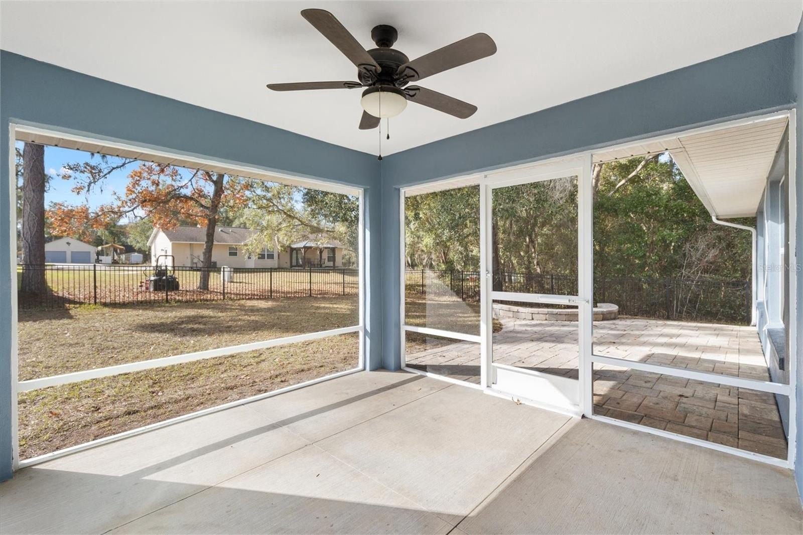 Beautiful charming courtyard house situated on a quiet dead end street. Large fully fenced in backyard with custom paver fire pit and screened in lanai. Open floor plan with split bedrooms. Travertine tile throughout living room, kitchen and dining area. Master bedroom features large walk-in closet, tray ceiling, outstanding Master bath with large walk-in shower. Kitchen boasts 42” cherry cabinets, center island, lighted pot rack, stainless steel appliances, granite counters and marble backsplash. Large closets in bedrooms. Low E double pane windows. No HOA or CDD, located close to The Villages, schools and shopping makes this house a MUST SEE!
