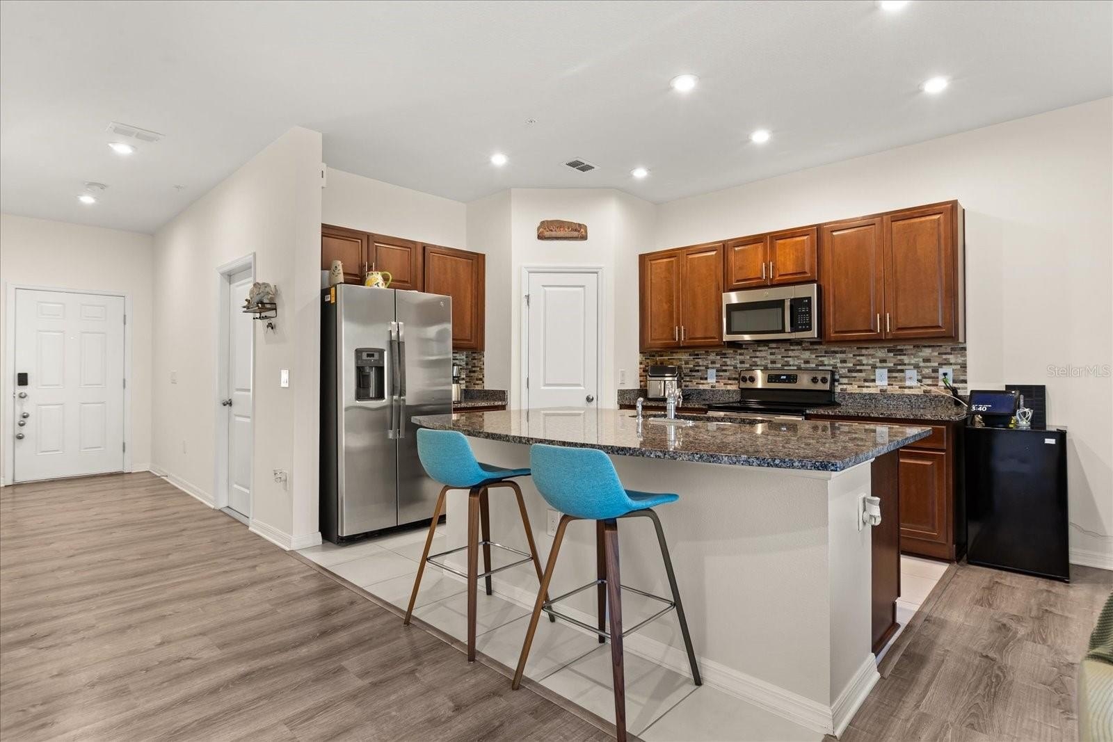 The kitchen showcases granite countertops, rich wood cabinetry, and comes fully equipped with all appliances — including the washer and dryer — making your move seamless and stress-free.