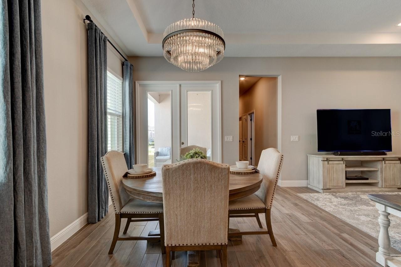 Step inside through the upgraded 8-foot entrance door into a bright, open layout featuring elegant tray ceilings in both the dining and living areas. Wood-look tile flows seamlessly through the main living spaces, complemented by upgraded baseboards for a refined finish. All bedrooms feature upgraded carpet with premium padding for added comfort.