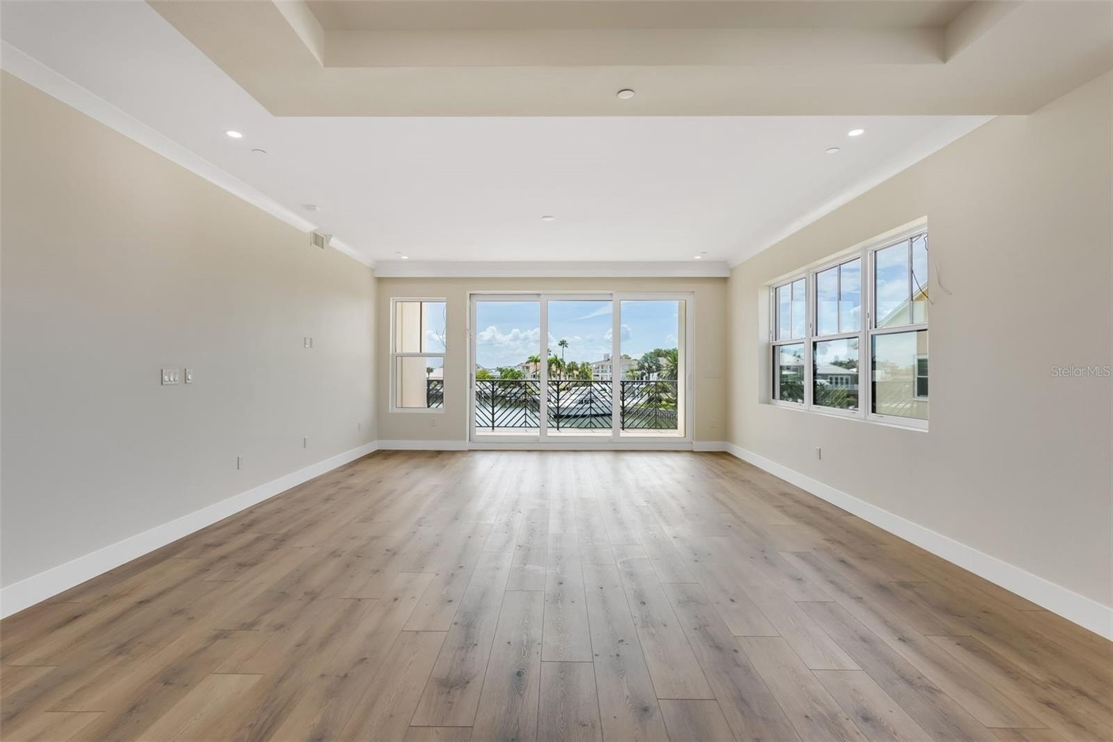 At the heart of the home is an open-concept chef’s kitchen featuring exquisite quartz countertops, custom cabinetry, a herringbone backsplash, oversized island with prep sink, hidden walk-in pantry, and premium stainless steel appliances. Ideal for entertaining, the kitchen flows effortlessly into the dining area and great room, where motorized window treatments and sliding glass doors lead to a deep, covered balcony overlooking the water and resort-style pool.