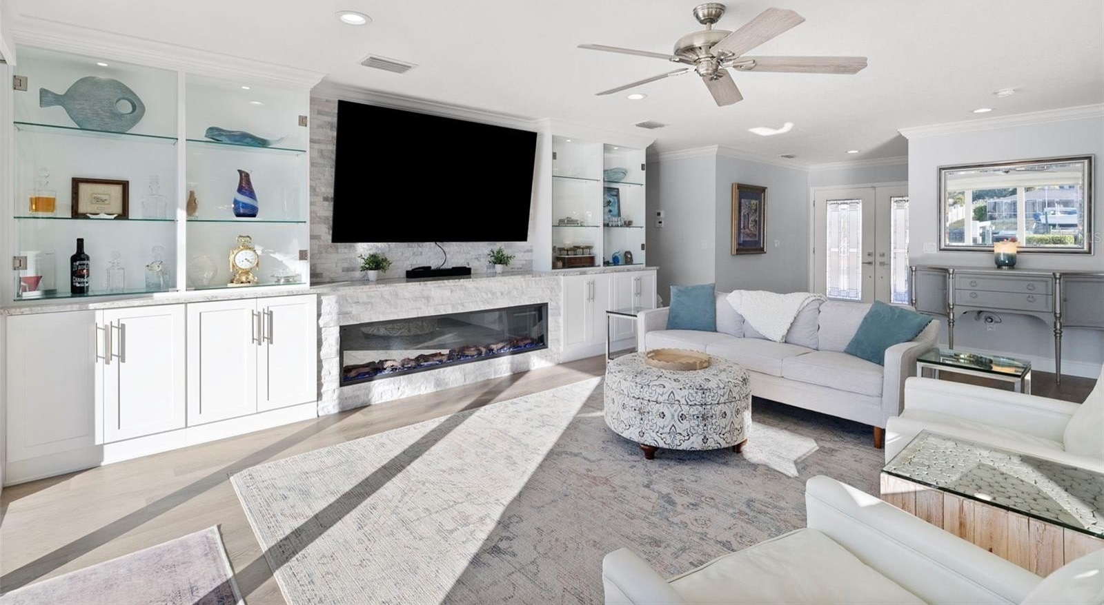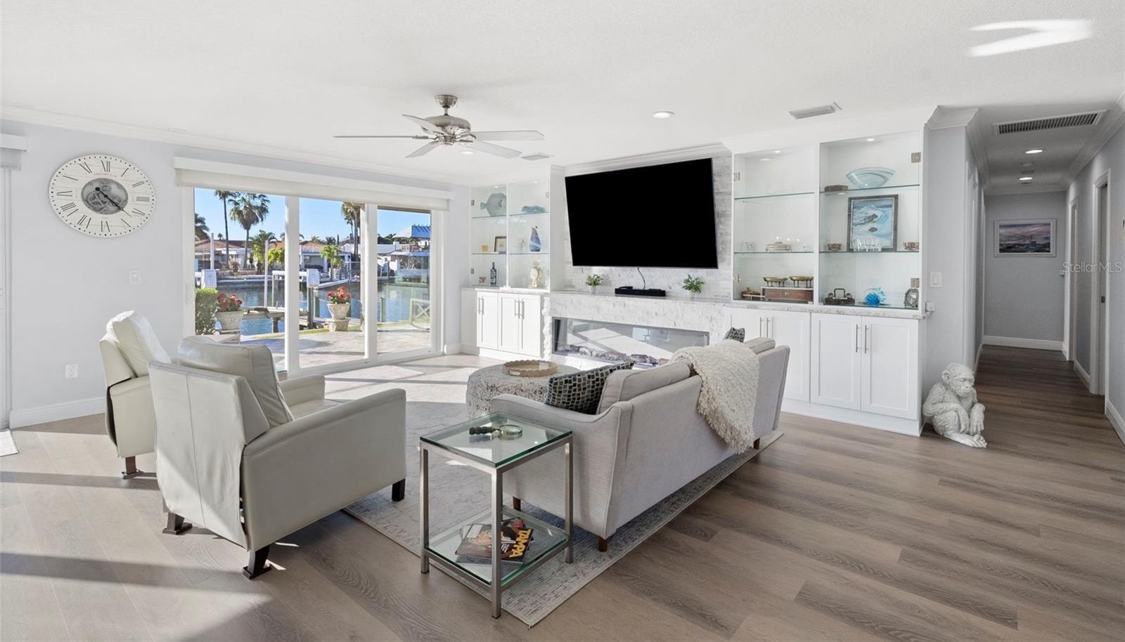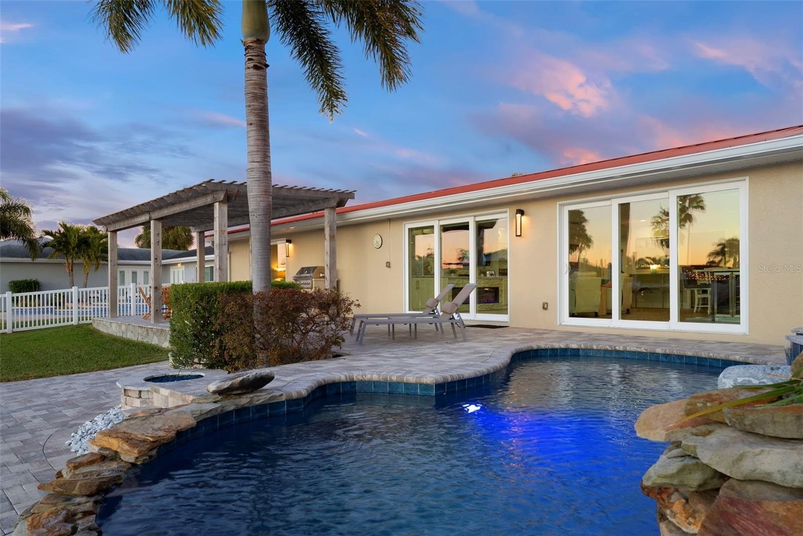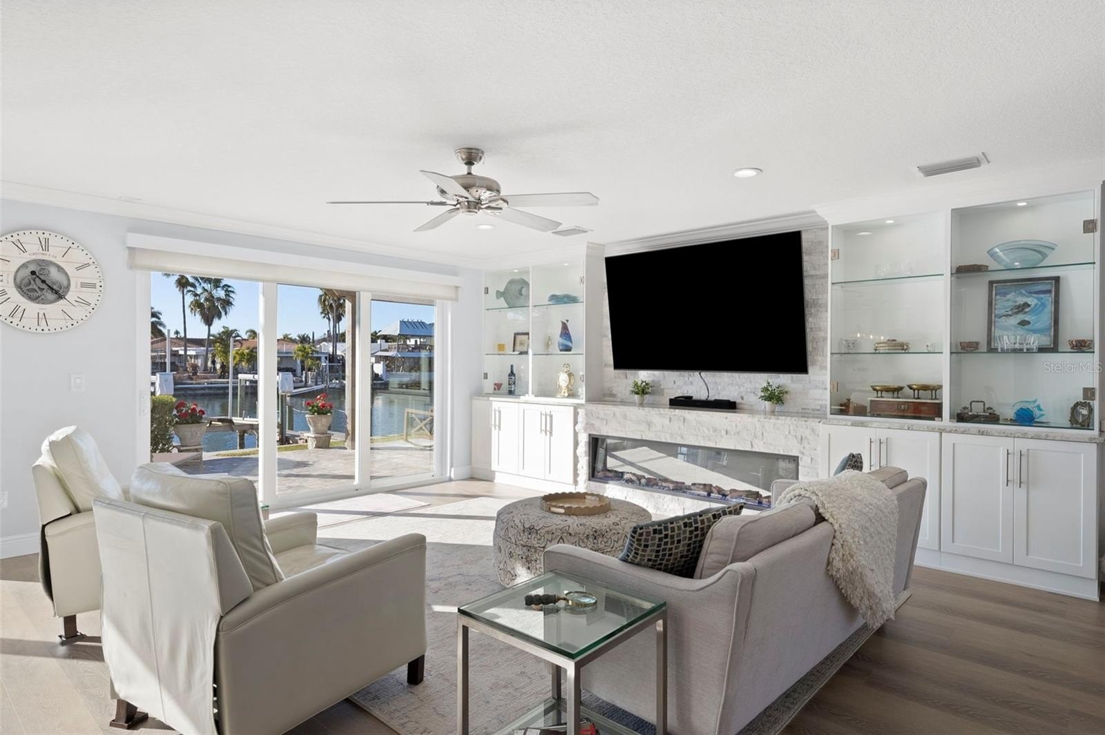 Set on one of the widest saltwater canals in Dana Shores with direct boating access to Old Tampa Bay, this exceptional waterfront residence offers approximately 80 FT of water frontage on a 121 FT deep lot, west-facing for breathtaking sunset views. Thoughtfully renovated down to the studs in 2020 by long-term owners (not a flip), with additional improvements completed in 2025, this home blends luxury, function, and peace of mind. The open floor plan showcases a custom kitchen with abundant cabinetry, granite countertops, all new stainless steel appliances, propane gas range, dry bar, and oversized center island with built-in microwave and wine refrigerator. The kitchen flows seamlessly into the spacious family room featuring an electric built-in fireplace and custom LED-lit entertainment cabinetry. Dual oversized 3-panel impact sliders with smart shades create an indoor-outdoor feel, opening to a private waterfront oasis including pergola entertaining space and expansive fenced yard ideal for pets and recreation.