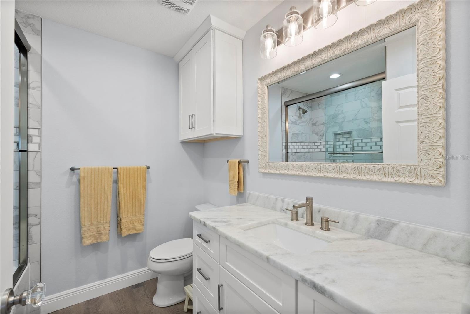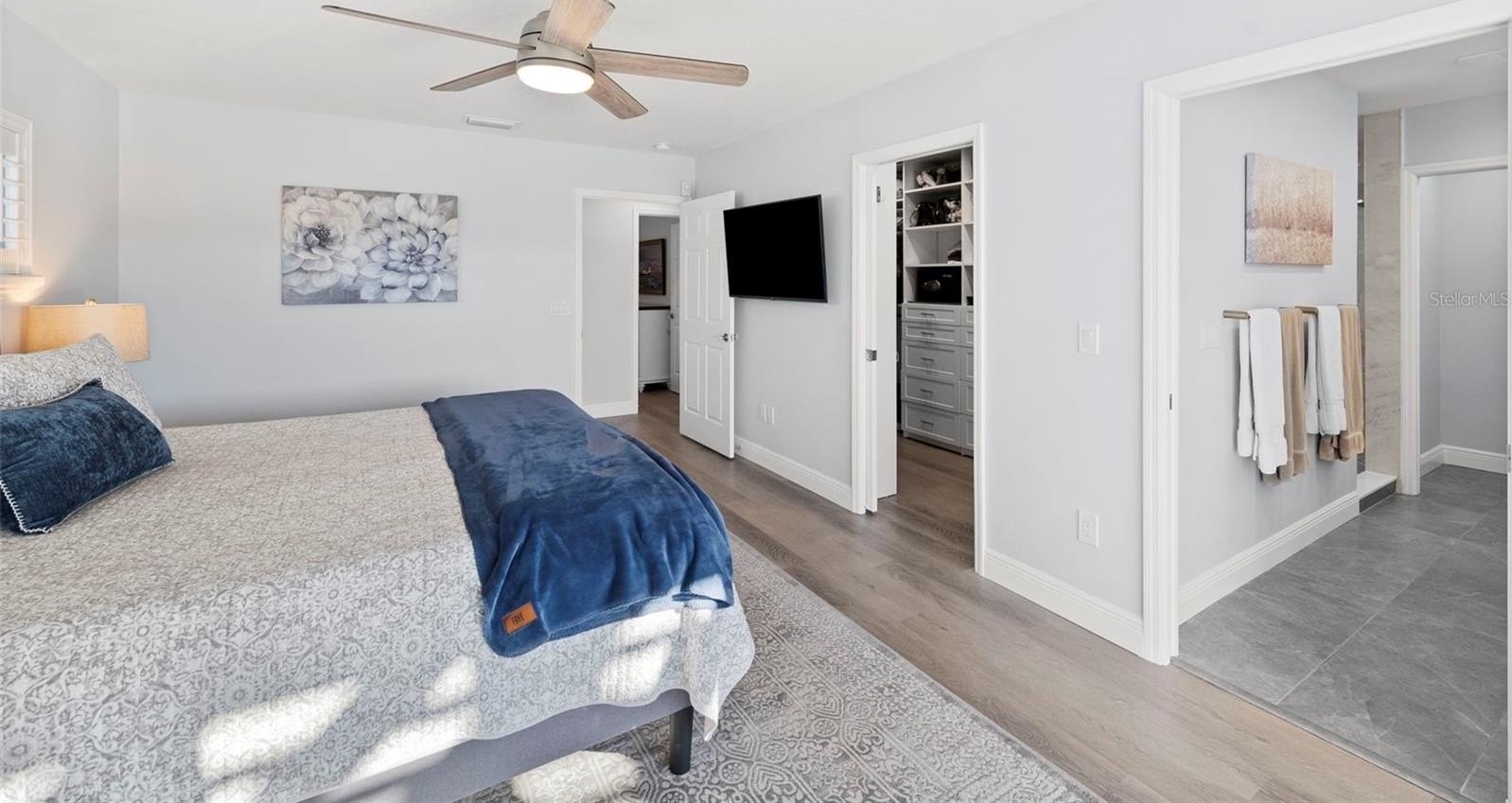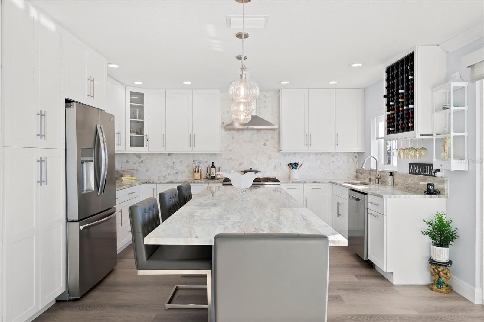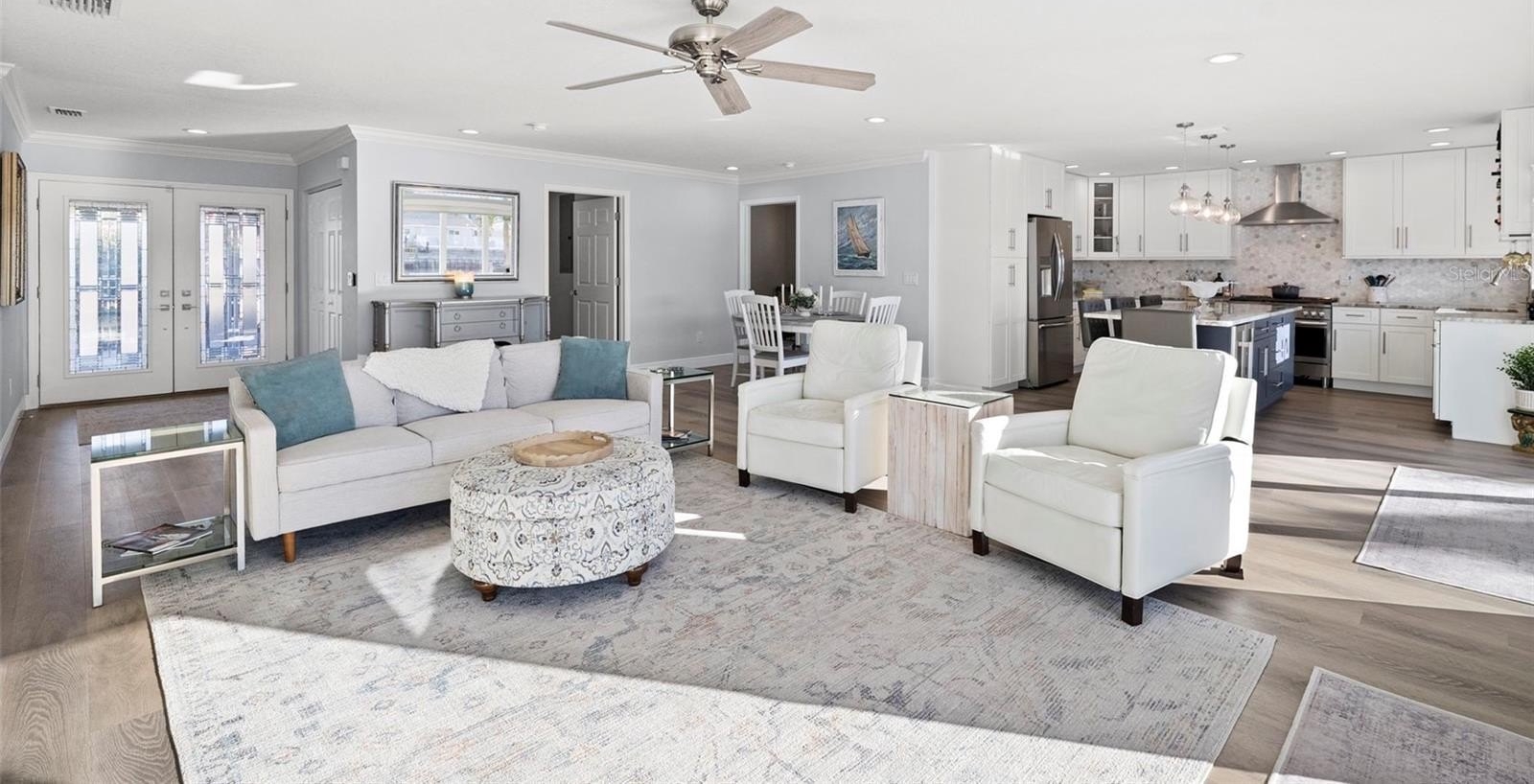 Set on one of the widest saltwater canals in Dana Shores with direct boating access to Old Tampa Bay, this exceptional waterfront residence offers approximately 80 FT of water frontage on a 121 FT deep lot, west-facing for breathtaking sunset views. Thoughtfully renovated down to the studs in 2020 by long-term owners (not a flip), with additional improvements completed in 2025, this home blends luxury, function, and peace of mind. The open floor plan showcases a custom kitchen with abundant cabinetry, granite countertops, all new stainless steel appliances, propane gas range, dry bar, and oversized center island with built-in microwave and wine refrigerator. The kitchen flows seamlessly into the spacious family room featuring an electric built-in fireplace and custom LED-lit entertainment cabinetry. Dual oversized 3-panel impact sliders with smart shades create an indoor-outdoor feel, opening to a private waterfront oasis including pergola entertaining space and expansive fenced yard ideal for pets and recreation.