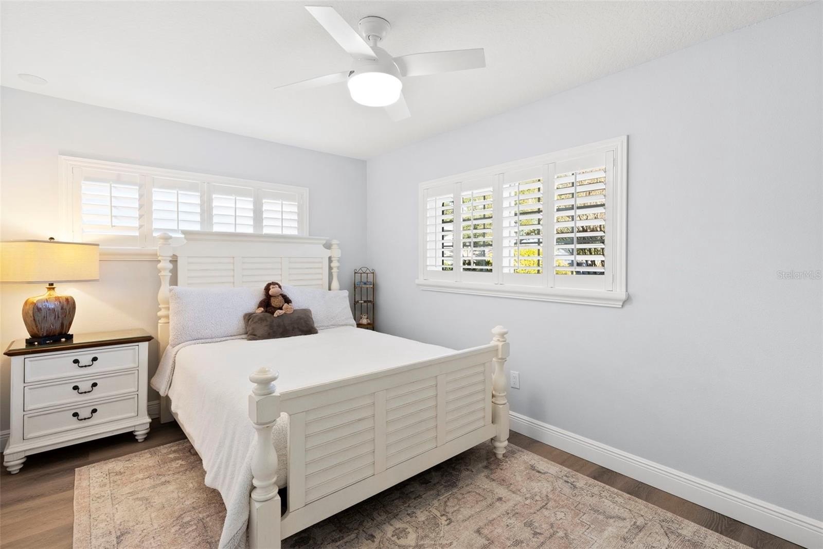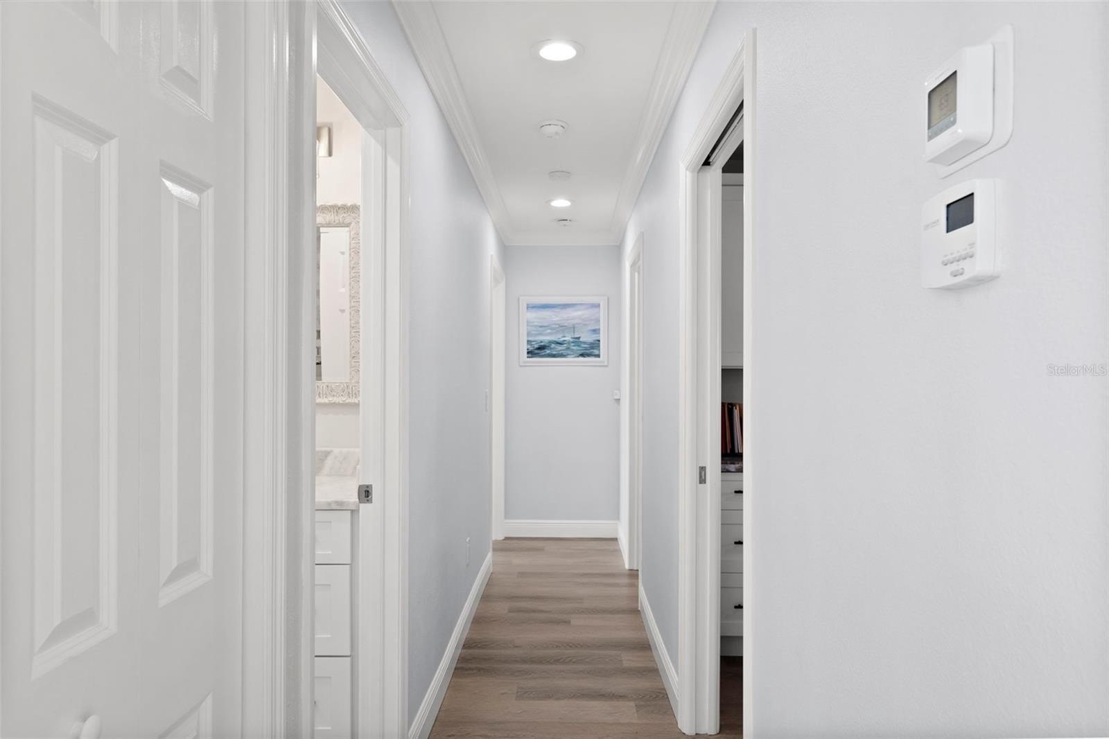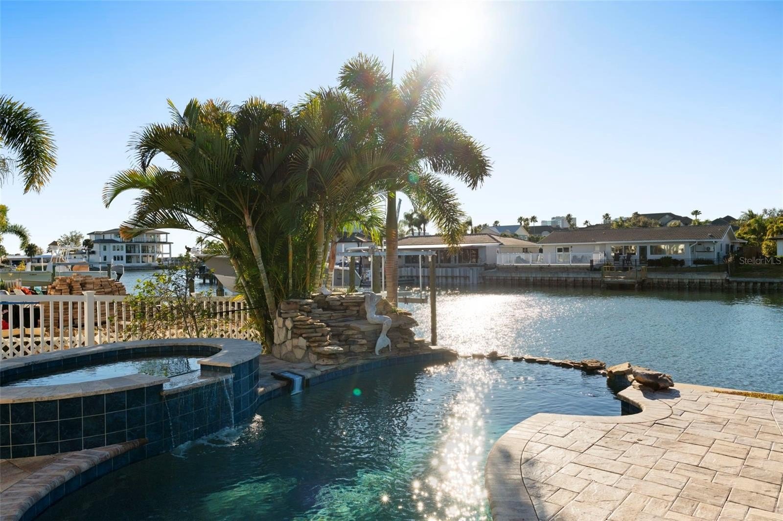 Outdoor living includes a heated saltwater PebbleTec infinity pool, in-ground spa with spillover feature, rock waterfall accents, custom lighting, expansive paver patio, and private dock with boat lift featuring updated motors, electrical, lighting, water service, new bunks, and approximately 10,000-lb lift capacity. Major upgrades include all-new interior wiring; cast-iron plumbing fully trenched and replaced with PVC; luxury vinyl flooring throughout (porcelain tile in both ensuite baths); impact windows and sliders; plantation shutters; custom built-ins; new interior laundry room with cabinetry and sink; attic insulation; doors; baseboards; crown molding; and upgraded LED lighting. The home offers two primary-style ensuite bedrooms, plus a guest bedroom and a versatile 4th bedroom with custom built-in Murphy bed and office setup. The oversized third bedroom functions as a secondary primary suite with private bath and generous closet space.