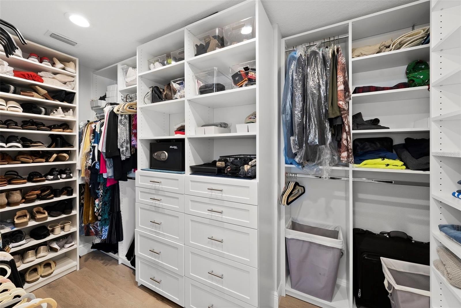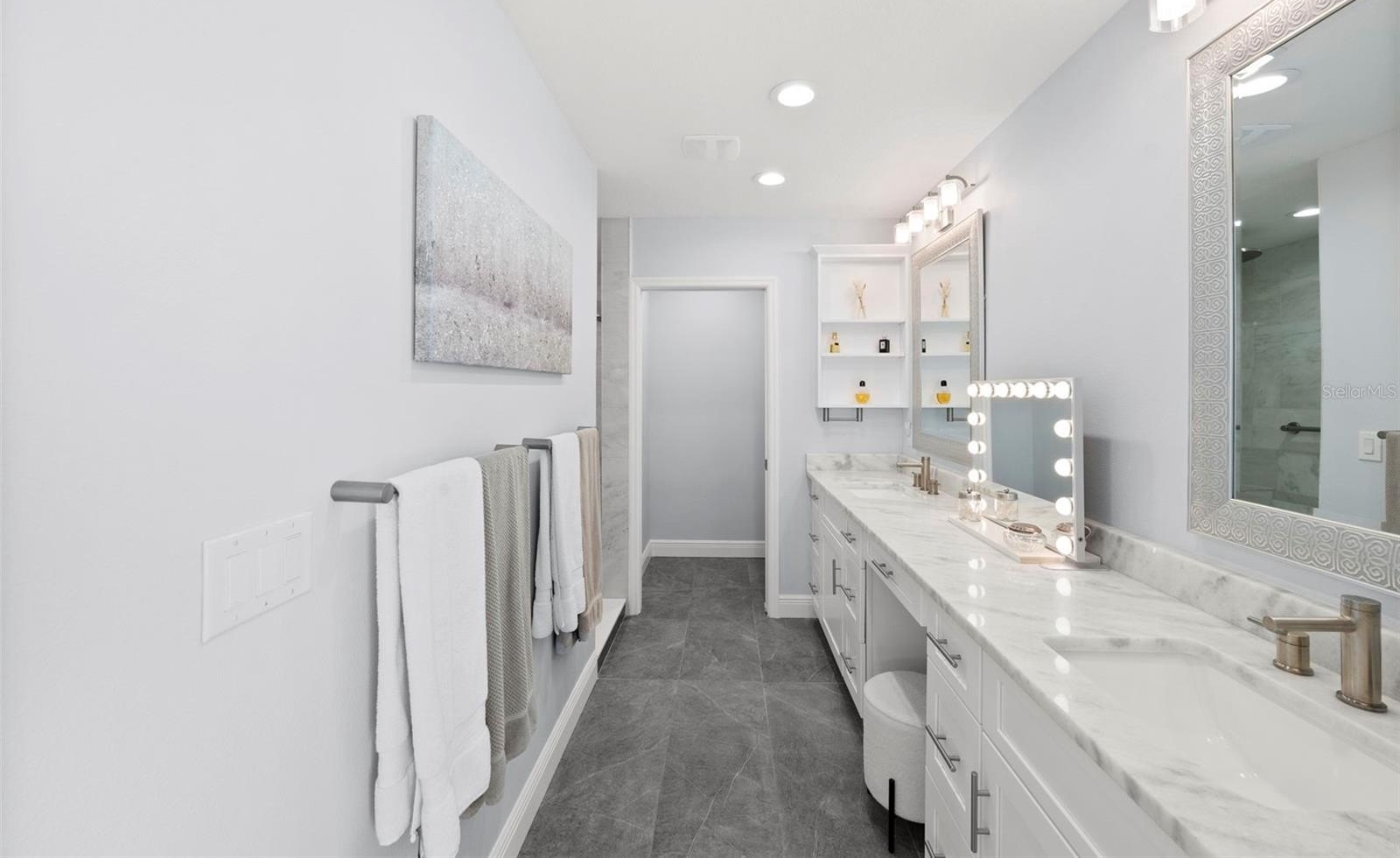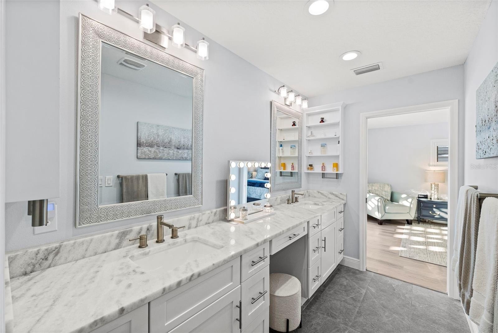 Outdoor living includes a heated saltwater PebbleTec infinity pool, in-ground spa with spillover feature, rock waterfall accents, custom lighting, expansive paver patio, and private dock with boat lift featuring updated motors, electrical, lighting, water service, new bunks, and approximately 10,000-lb lift capacity. Major upgrades include all-new interior wiring; cast-iron plumbing fully trenched and replaced with PVC; luxury vinyl flooring throughout (porcelain tile in both ensuite baths); impact windows and sliders; plantation shutters; custom built-ins; new interior laundry room with cabinetry and sink; attic insulation; doors; baseboards; crown molding; and upgraded LED lighting. The home offers two primary-style ensuite bedrooms, plus a guest bedroom and a versatile 4th bedroom with custom built-in Murphy bed and office setup. The oversized third bedroom functions as a secondary primary suite with private bath and generous closet space.