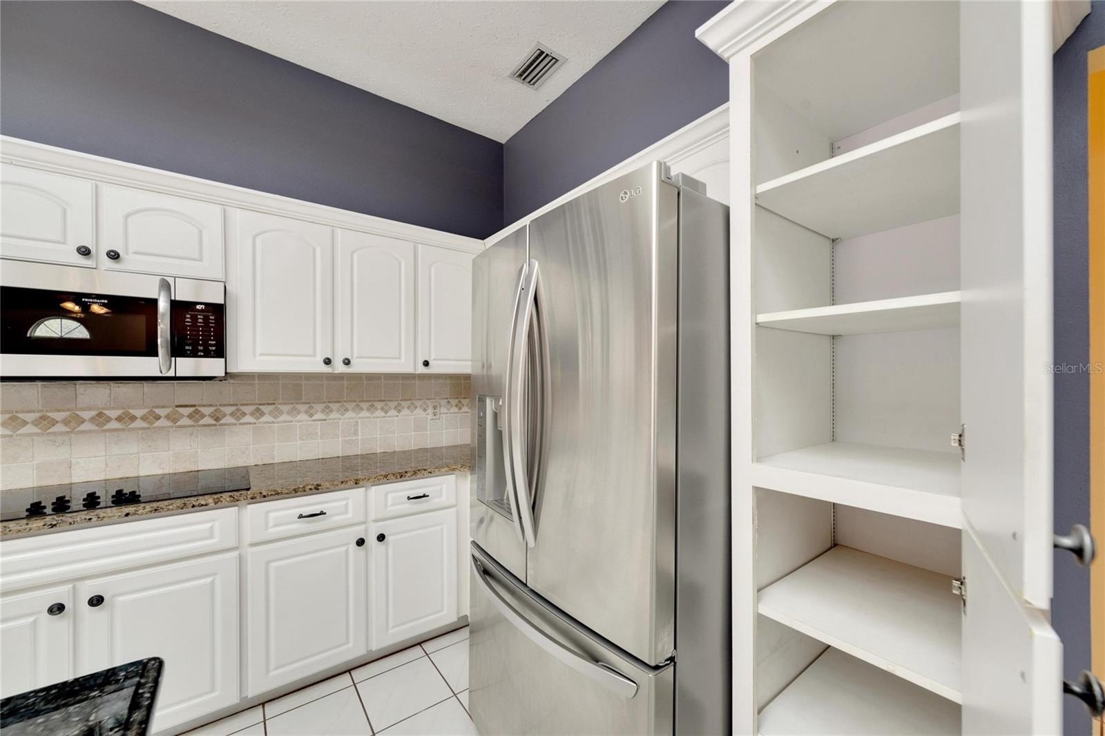 The updated kitchen features stainless steel appliances, double oven, wine fridge, island, and granite counters. A butler’s pantry with sink, granite tops, and second refrigerator adds extra prep and storage space. The spacious living room centers around a cozy wood-burning fireplace.