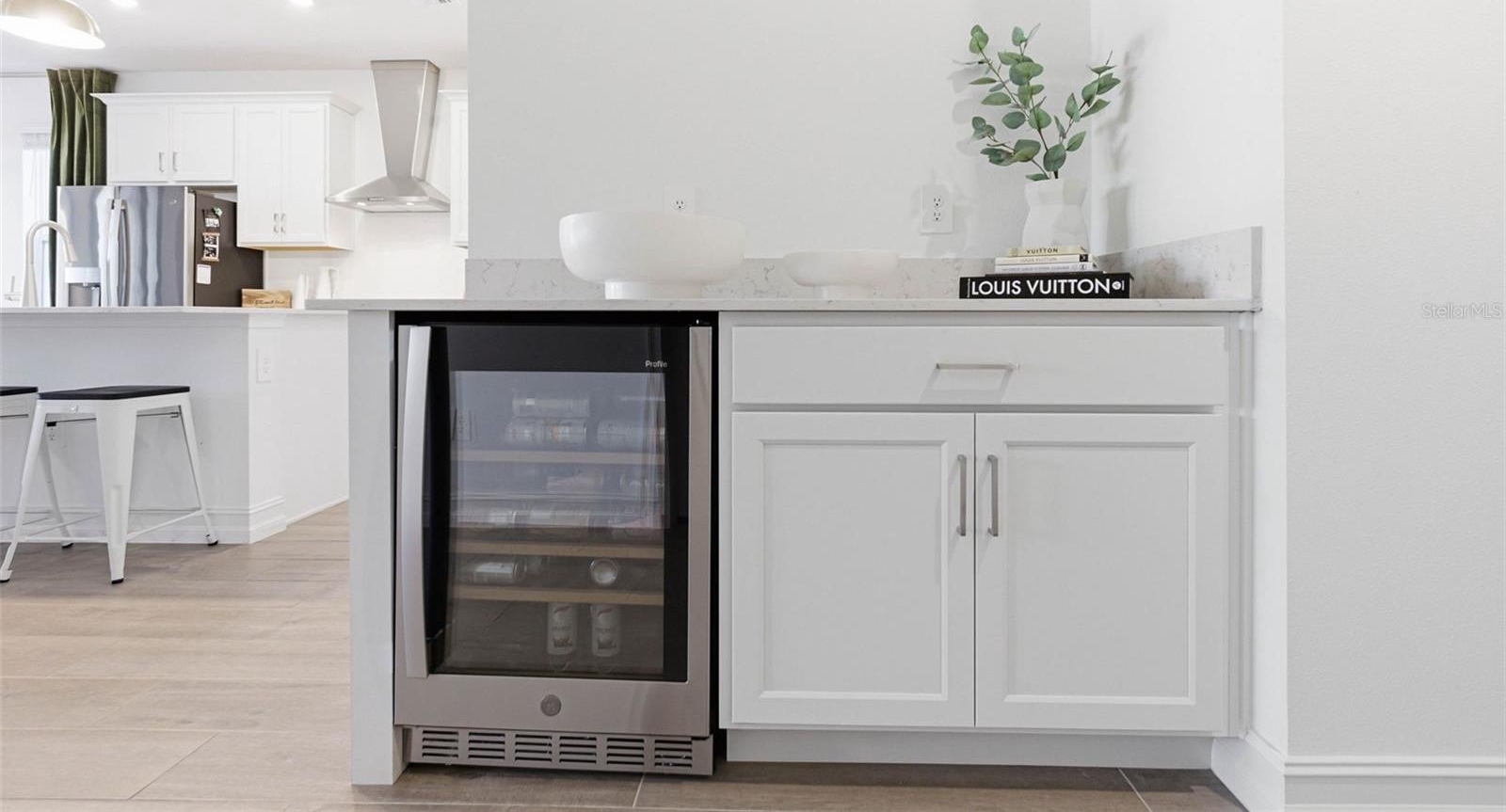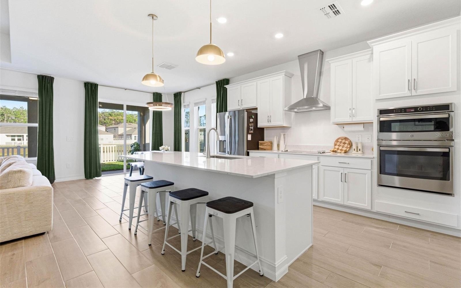 At the center of the home, the kitchen anchors the space with a striking oversized island, walk-in Butler’s pantry, dry bar with a beverage fridge, stainless steel appliances, and statement pendant lighting. It opens effortlessly to the dining and family rooms, where custom woodwork and designer fixtures add warmth and architectural character. Walls of glass frame the pond, while sliding doors extend the living area to a covered pavered lanai and fully fenced backyard, an ideal setting for entertaining or quiet evenings overlooking the water.