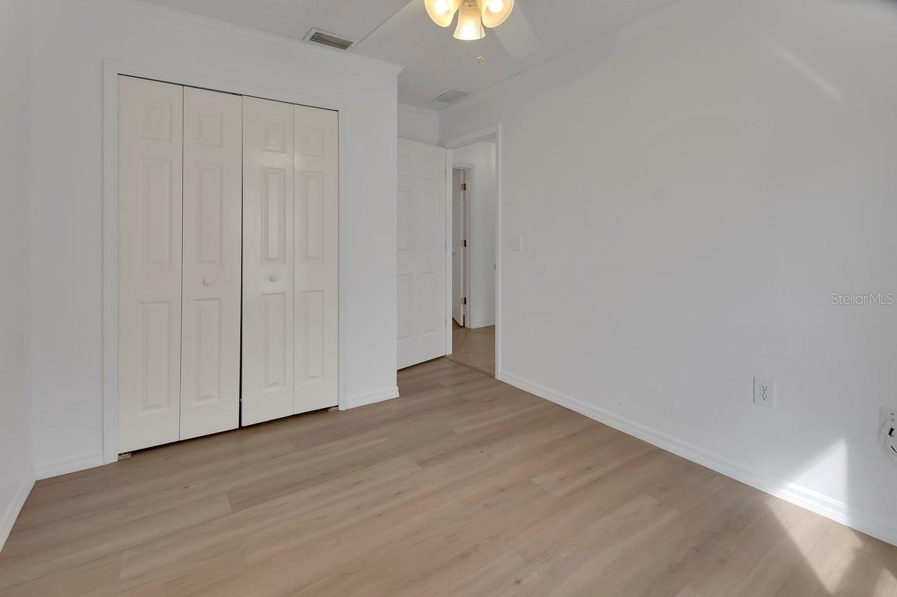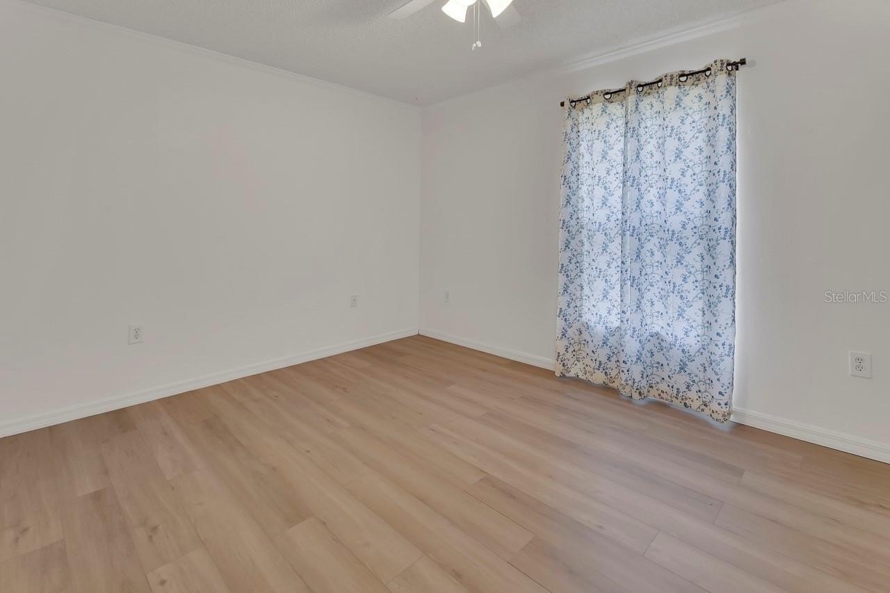 Down the hall, you will find a guest bath with an updated vanity and three bedrooms with newer vinyl laminate flooring and ceiling fans. The spacious primary bedroom offers a large closet, crown molding, and an updated bathroom. You will love this indoor laundry room, which provides ample storage with an organized closet system.