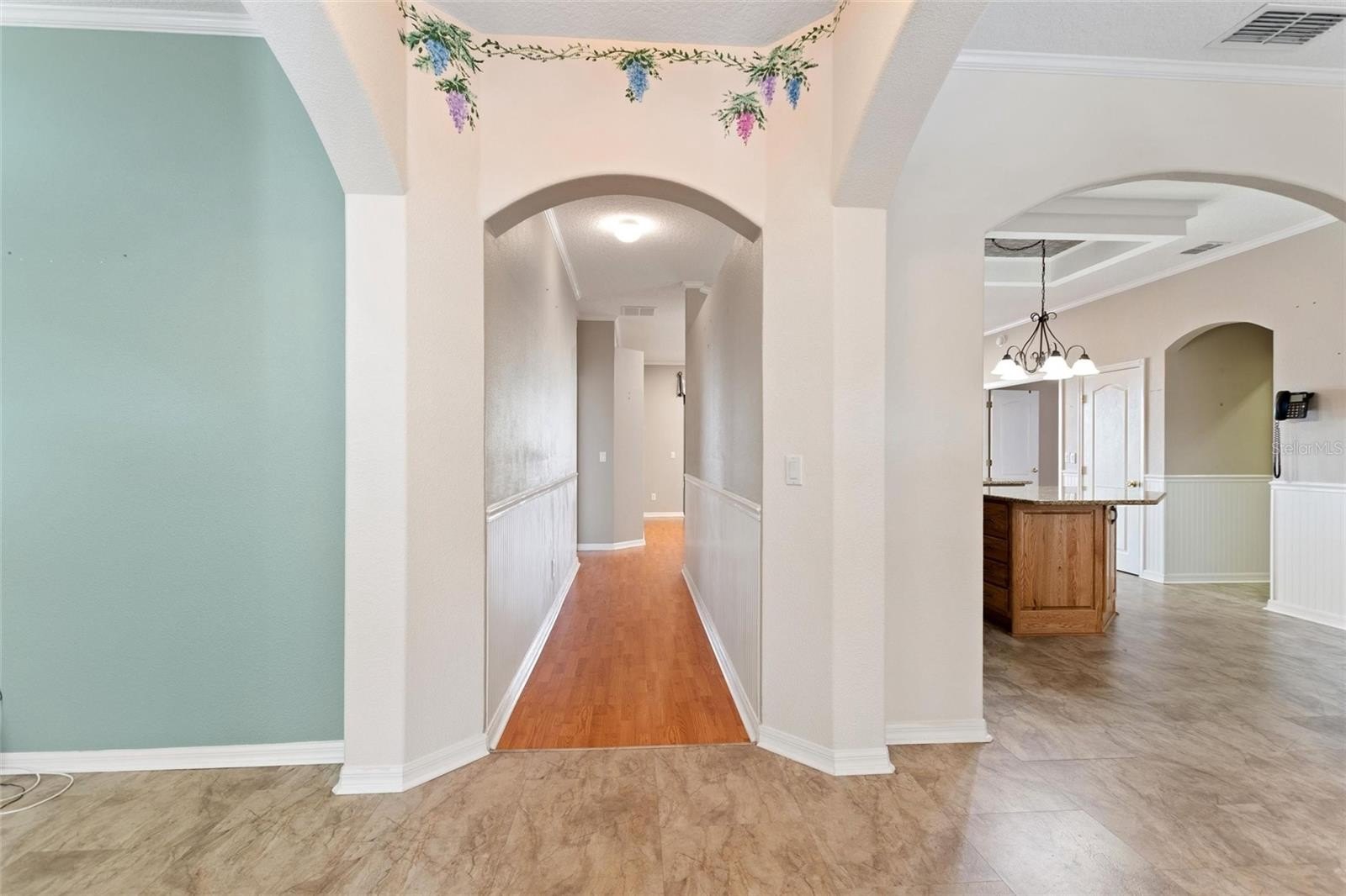 Welcome to Kings Ridge Golfing Community! This home, located in the Highgate subdivision of Kings Ridge, is the St. Clair Model from the King Arthur Series and offers 3 bedrooms, 2 bathrooms, a formal living and dining room, and a spacious kitchen with a large island. Relax on the extended screened-in lanai overlooking the 11th fairway of the golf course and a serene pond. The family room features gorgeous engineered flooring, while the bedrooms have luxury vinyl flooring. The kitchen boasts 42-inch cabinets, a beautiful center island, granite countertops, and stainless steel appliances. Both bathrooms have been recently remodeled. Take in the elevated view from the large screened covered lanai. Kings Ridge is a 24-hour guard-gated, highly sought-after 55+ active adult community nestled in the rolling hills of Clermont. HOA fees include access to a multi-million-dollar clubhouse, 3 pools, 2 spas, pickleball and tennis courts, classes, clubs, bingo, movies, and more, plus lawn maintenance, basic cable, and internet. Cruise to nearby shops, grocery stores, banks, restaurants, doctors’ offices, salons, Starbucks, and more by golf cart. Spend your days lounging by the pool or visiting attractions like Disney, SeaWorld, Universal Studios, NASA’s Kennedy Space Center, world-class shopping, or Florida’s beautiful beaches on either coast. Clermont’s central location puts Orlando International Airport just 45 minutes away. Experience the good life at Kings Ridge!