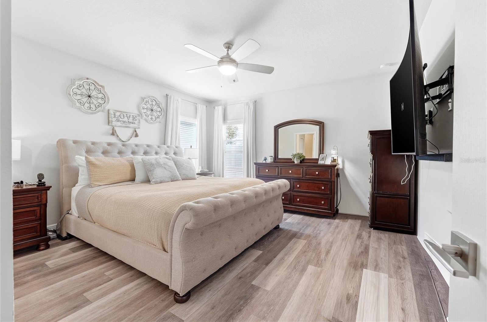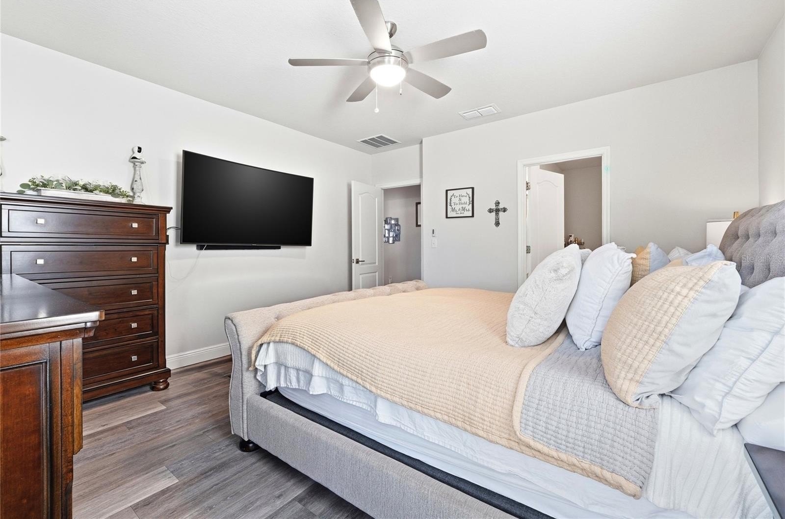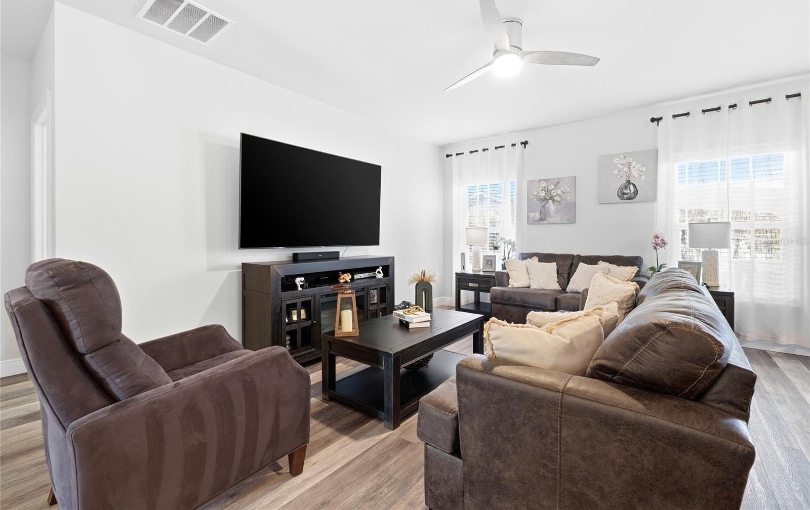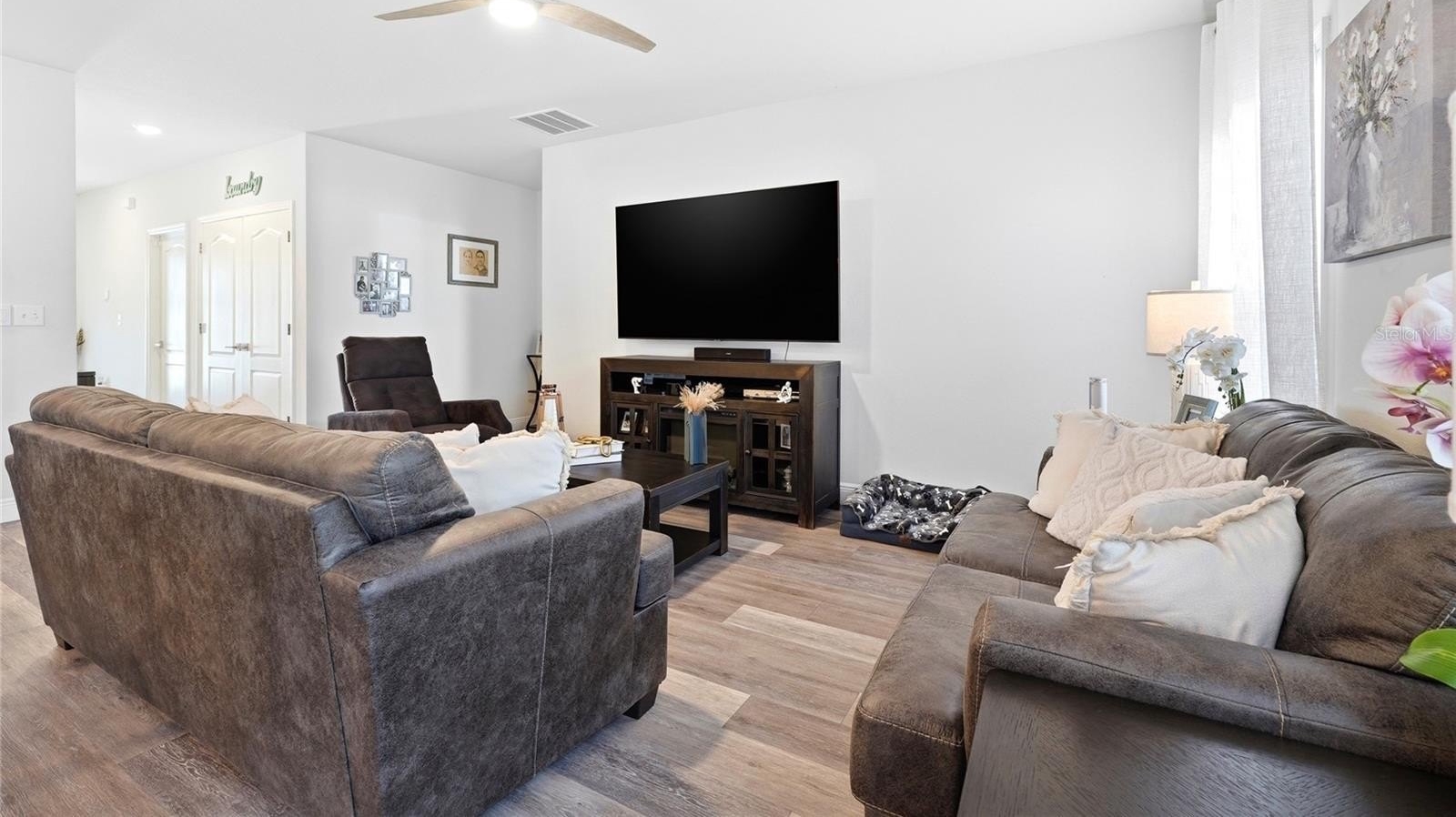 Welcome to this absolutely amazing 3 bedroom, 2 bathroom home that shows like a model home. Built in 2017 by Ryan Homes, it offers a spacious and open floor plan with countless upgrades that make it extremely attractive. The interior has beautiful luxury vinyl plank flooring that flows throughout the entire house - NO CARPET. The bright, open floor plan is enhanced by upgraded lighting and modern ceiling fans, adding a touch of sophistication and comfort. The large kitchen features an island kitchen, stainless-steel appliances and a spacious pantry.. This home is perfect for entertaining guests and undoubtably this floor plan is sure to impress visitors. The owners suite is a luxury retreat, offering a spacious walk-in closet and a luxurious bathroom with a walk-in shower, dual sinks, and a separate water closet for added privacy. The secondary bedrooms are generously sized and share second bathroom with upgraded fixtures. The covered, oversized screened lanai provides ample space for outdoor living and entertaining. The beautifully landscaped lawn and fenced yard add great curb appeal and add to the beauty of this property. This exceptional home is move-in ready and offers comfort, style, and modern features in one package. Don't miss this opportunity!
