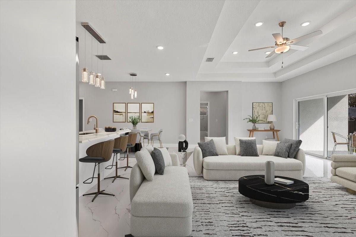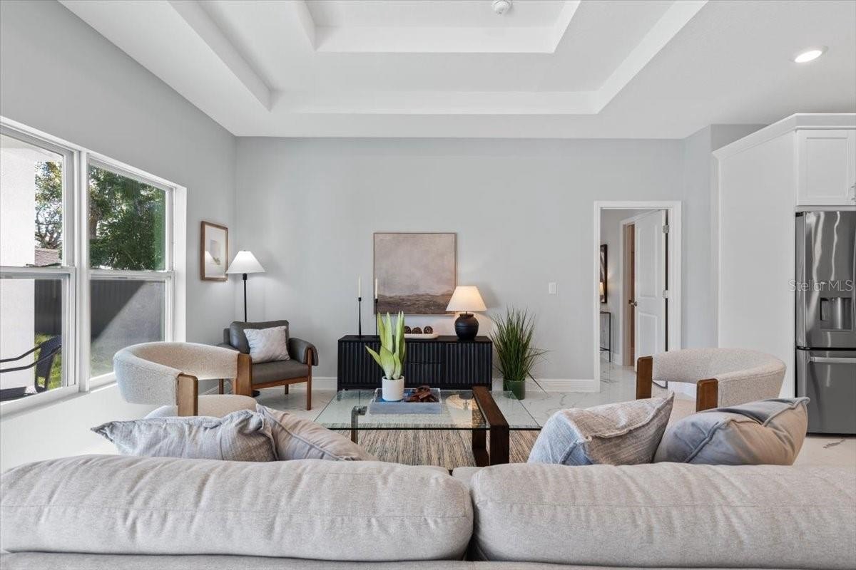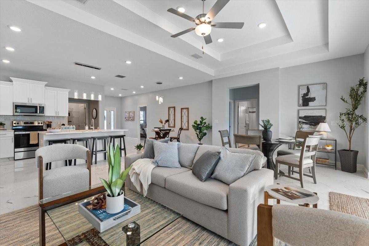 One or more photo(s) has been virtually staged. Welcome home to this beautifully crafted new construction 4-bedroom, 2-bath residence less than 6 miles to Downtown Tampa—with no HOA or CDD. A striking decorative glass front door sets the tone for the quality and design inside. The bright, open layout features tray ceilings in the living room and primary suite, elegant porcelain tile flooring throughout, designer lighting, and abundant recessed lighting.