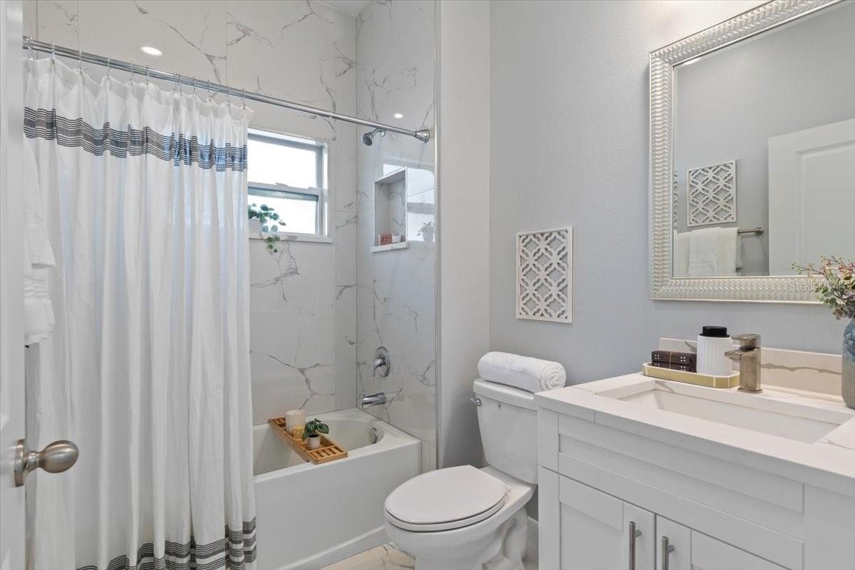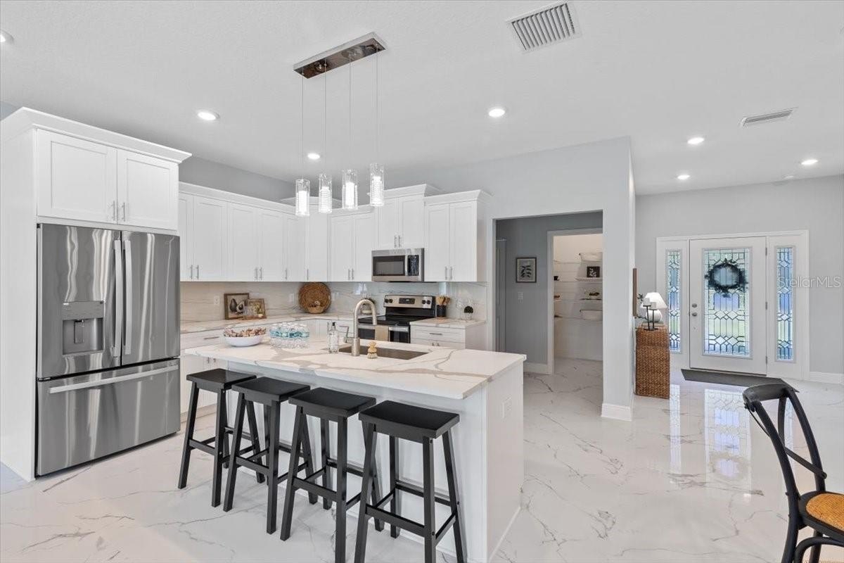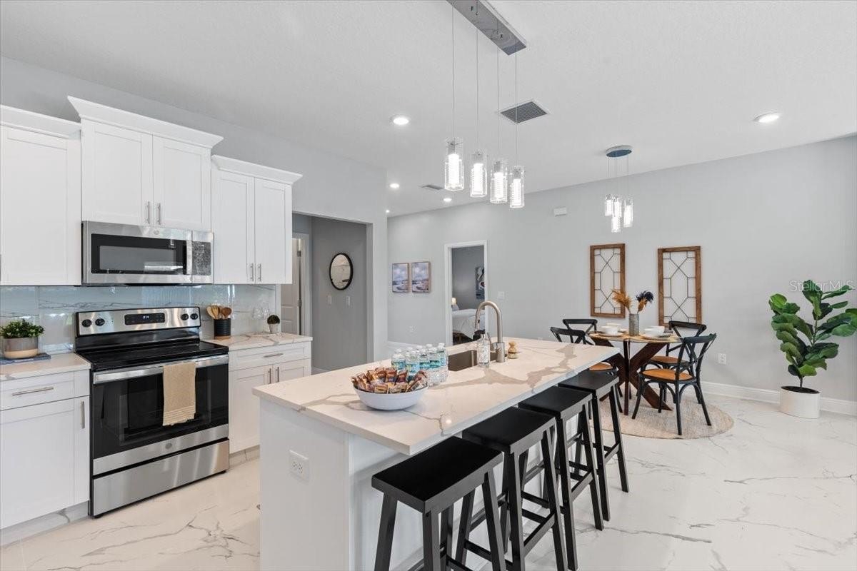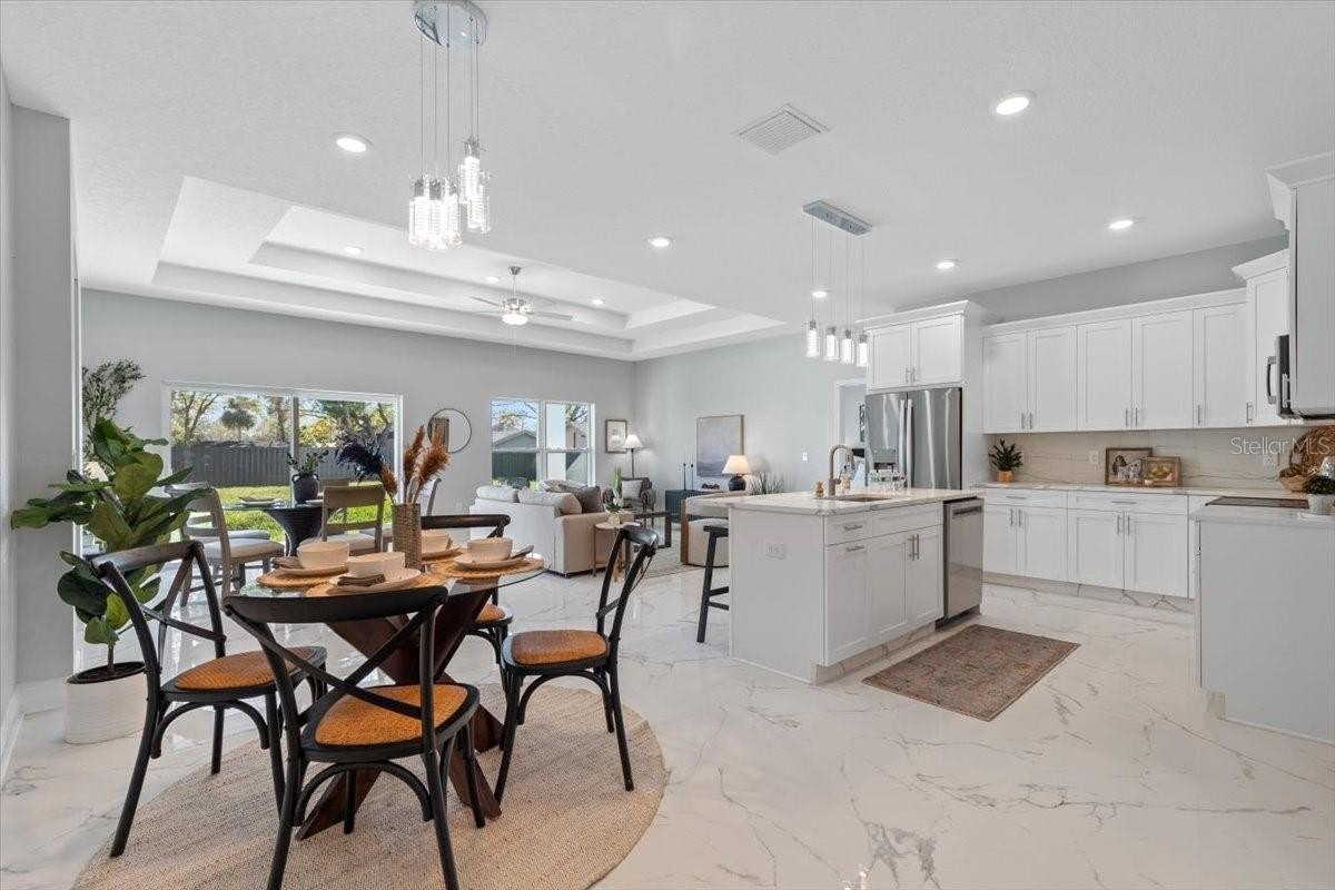 One or more photo(s) has been virtually staged. Welcome home to this beautifully crafted new construction 4-bedroom, 2-bath residence less than 6 miles to Downtown Tampa—with no HOA or CDD. A striking decorative glass front door sets the tone for the quality and design inside. The bright, open layout features tray ceilings in the living room and primary suite, elegant porcelain tile flooring throughout, designer lighting, and abundant recessed lighting.
