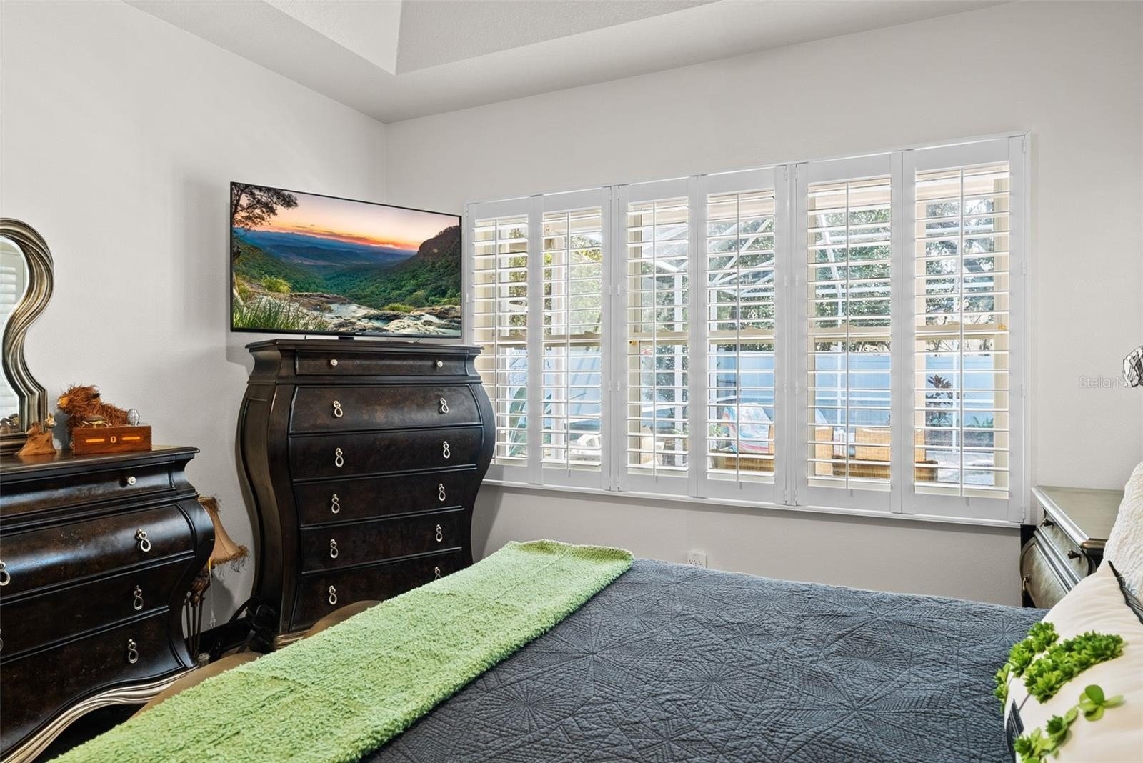 At the heart of the home, the updated kitchen features solid wood cabinetry, stone counters, and fresh finishes that blend warmth with functionality. Just beyond, the spacious family room opens toward the lanai and pool, making everyday living and entertaining feel effortless. A thoughtfully designed split-bedroom layout provides privacy, including a generous primary suite with plantation shutters, a large walk-in closet with built-ins, a garden tub, and a spacious walk-in shower designed for relaxation.