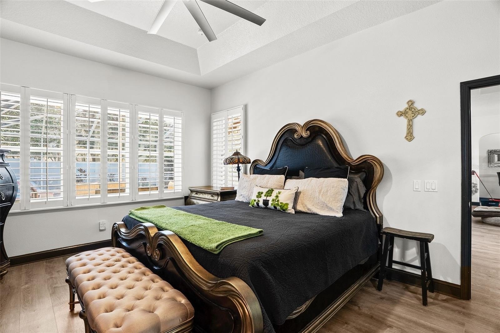 Step through the double entry doors into a light-filled interior where soaring tray and vaulted ceilings, crown molding, and brand-new luxury vinyl flooring create a seamless flow throughout the home. The formal living and dining spaces offer versatility, currently serving as both an entertaining area and a game room, while plantation shutters and arched windows frame views of the surrounding property.