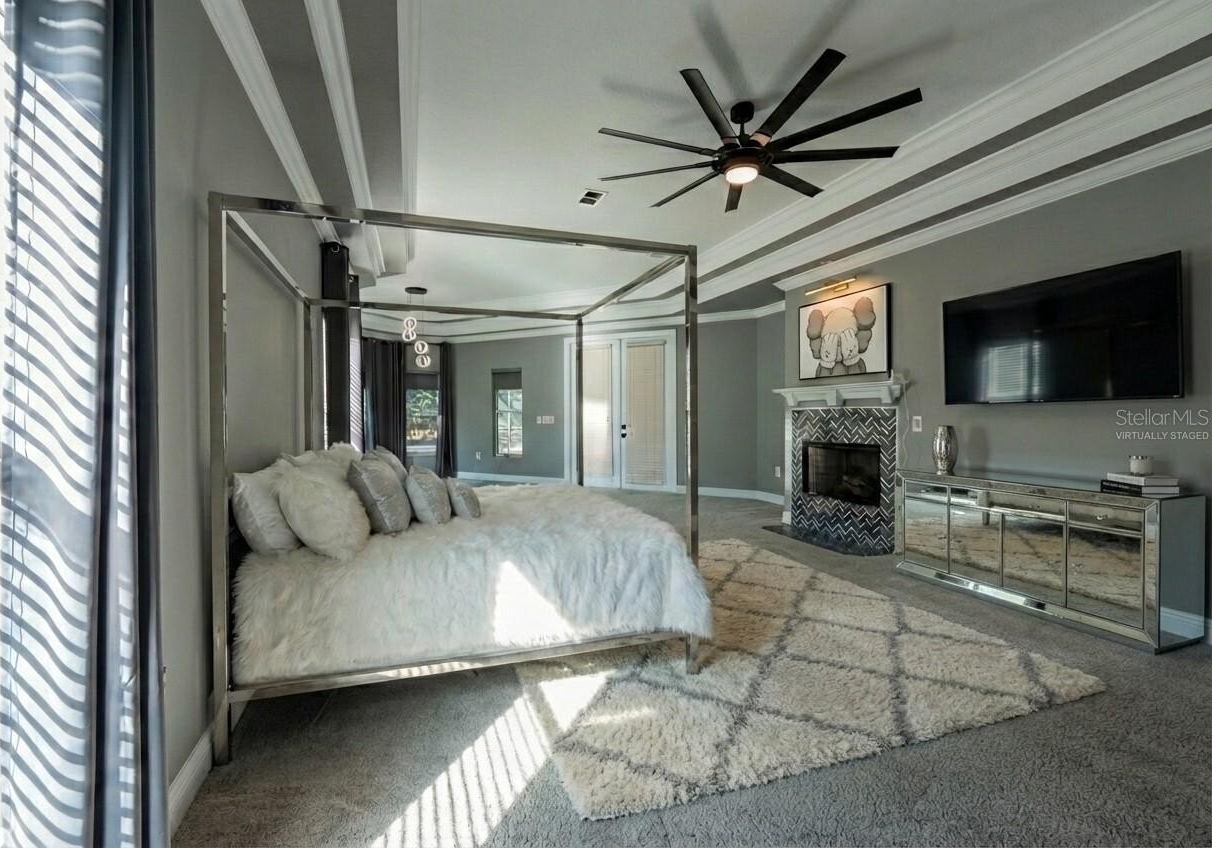 The gourmet kitchen opens seamlessly to the breakfast nook and family room and is beautifully appointed with granite countertops, stainless steel appliances, built-in double ovens, and a large center island. The luxurious primary suite offers tray ceilings, a private fireplace, sitting area, and abundant natural light, along with a spa-inspired ensuite featuring dual vanities, a jacuzzi tub and two spacious walk-in closets. Three additional bedrooms are generously sized with large closets and a convenient cabana bath provides direct access to the outdoor living area.