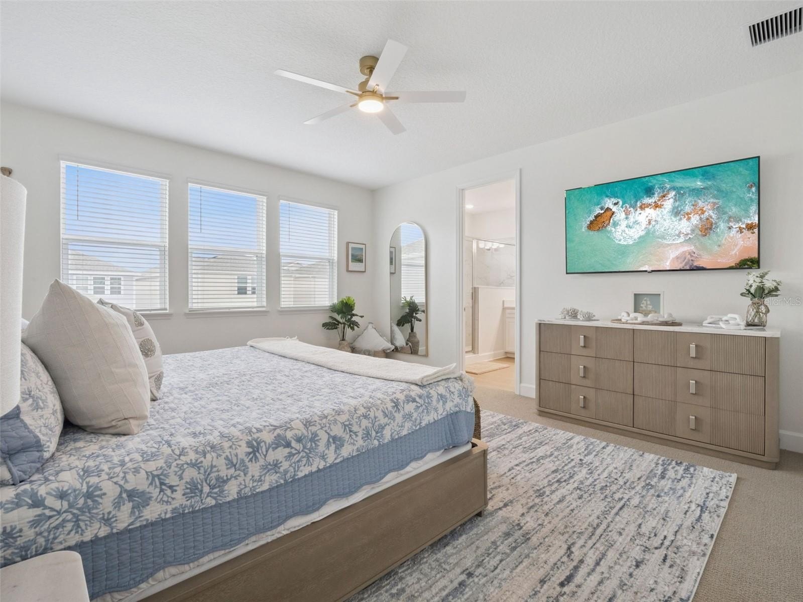 The spacious primary suite offers a serene retreat with a spa-inspired bath and generous closet space. Three additional bedrooms and well-appointed baths provide flexibility for guests, family, or a home office.