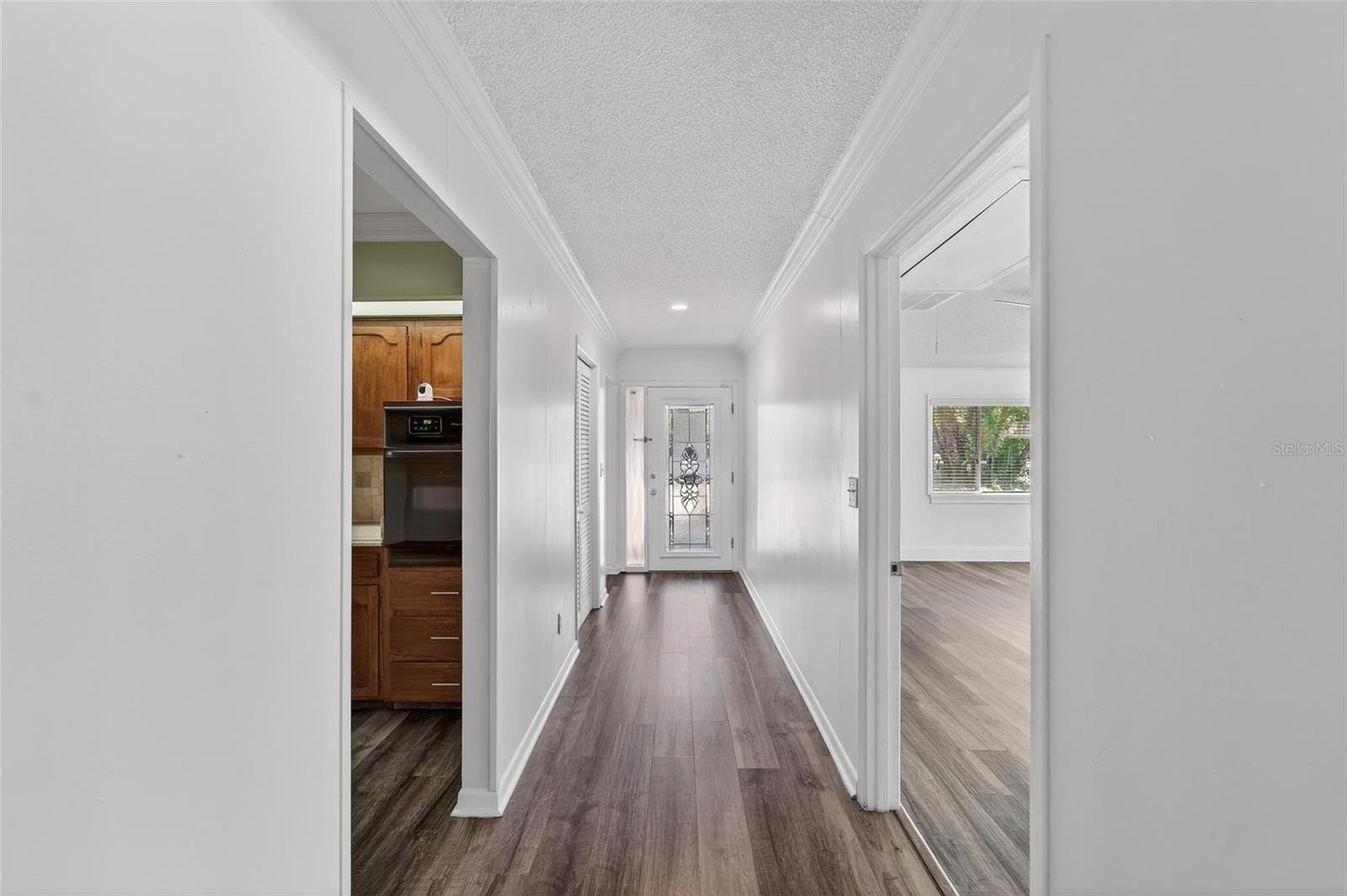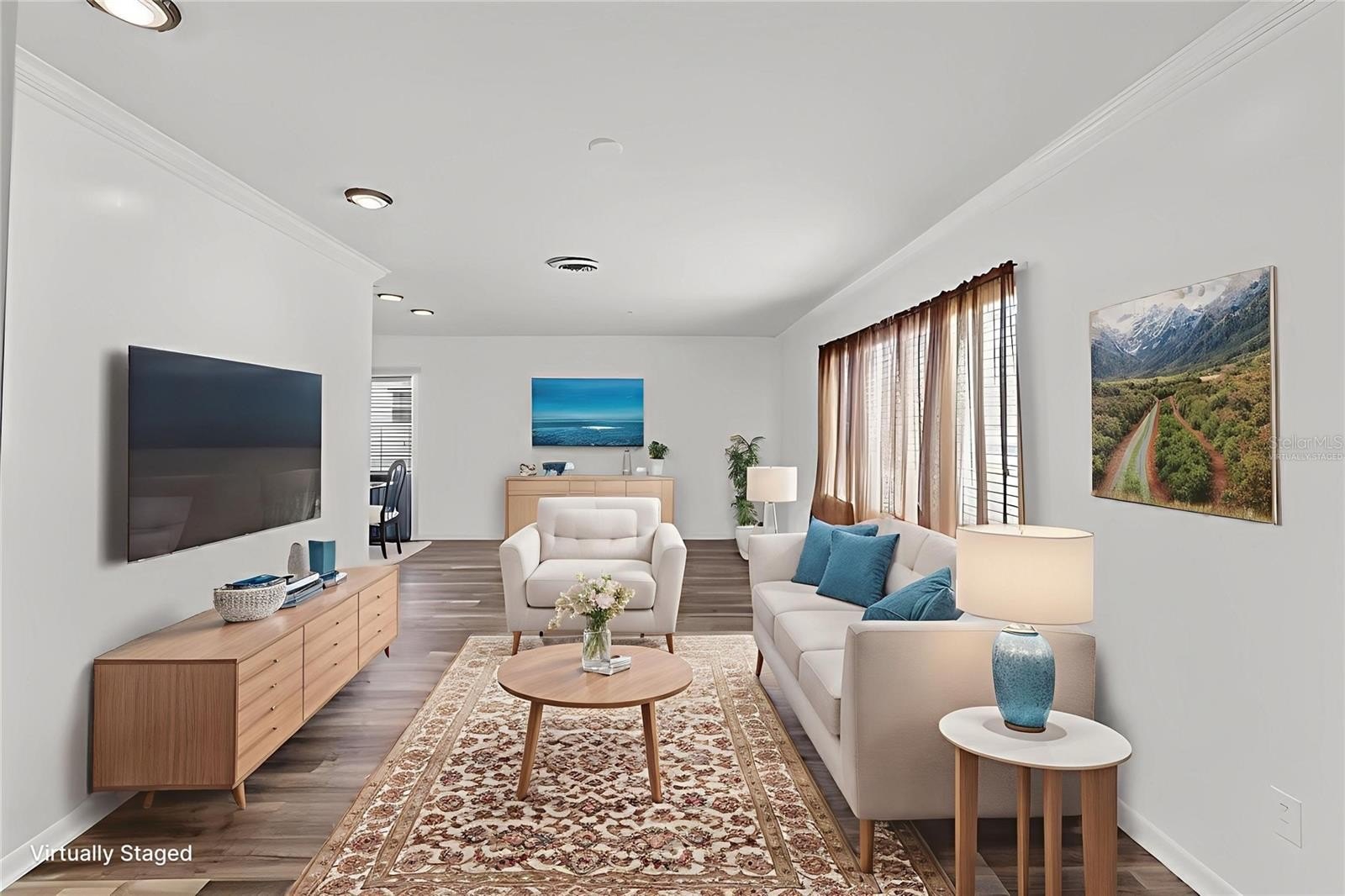 Inside, you’ll find a thoughtful layout featuring formal living and dining rooms, crown molding, kitchen with dinette, and an oversized family room perfect for gatherings. A separate den opens directly to the screened pool lanai, creating seamless indoor-outdoor Florida living.