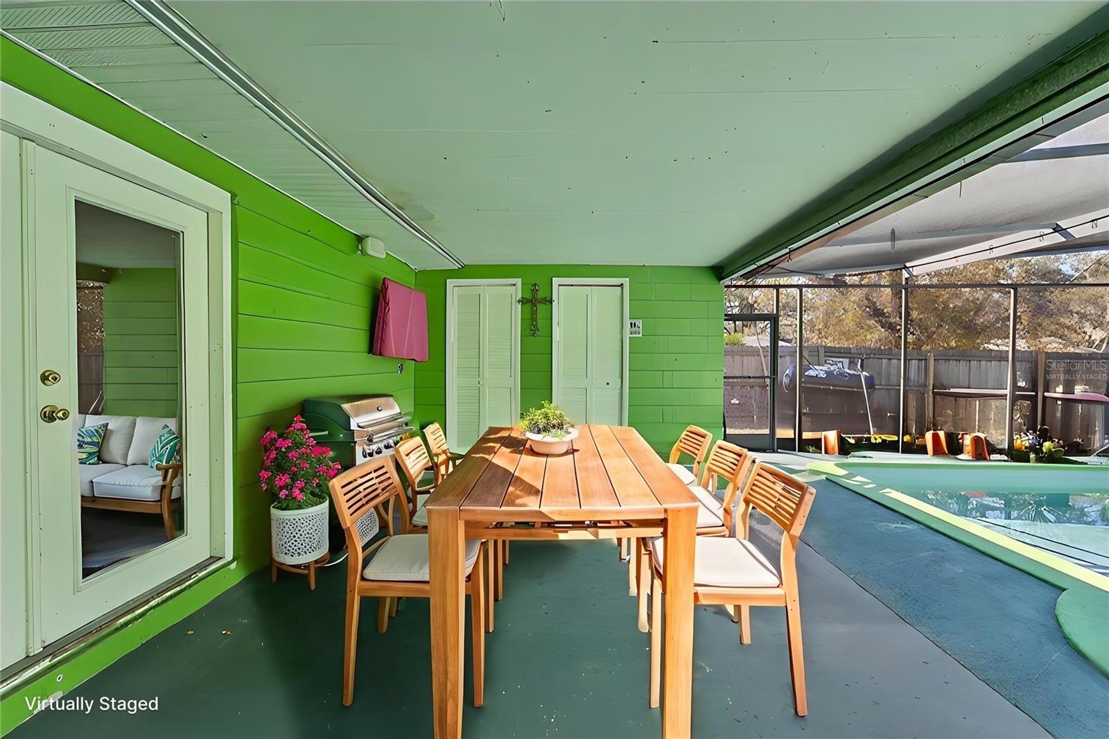 The private pool area includes a convenient poolside bath — ideal for entertaining and summer days spent outside.