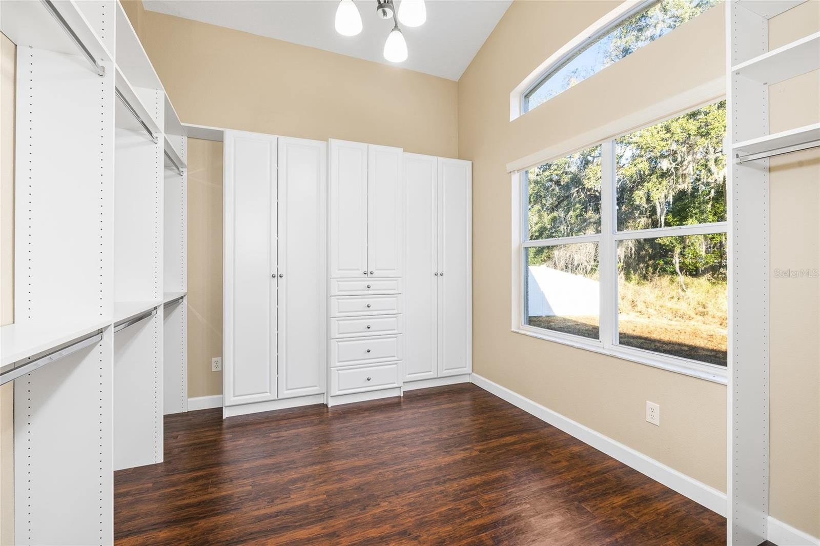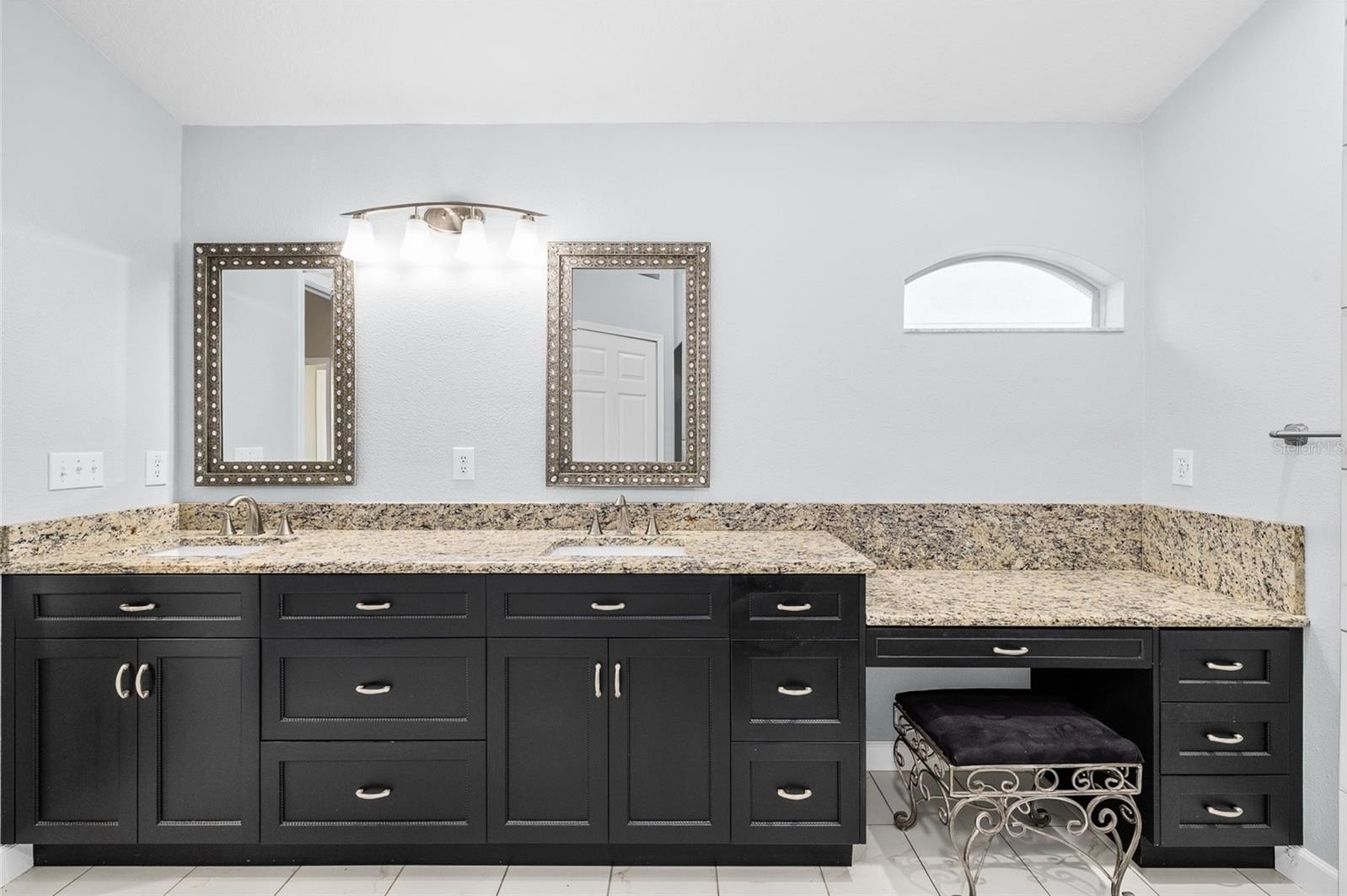 The primary suite includes a custom walk-in closet with chandelier and bay window. The en-suite bath offers dual granite vanities, marble-look tile, private water closet, and a walk-in shower with rain shower head, river rock flooring, bench seating, and decorative mosaic accents. Secondary bedrooms are positioned in a split floor plan and share a full bath with subway tile and oil-rubbed bronze fixtures.