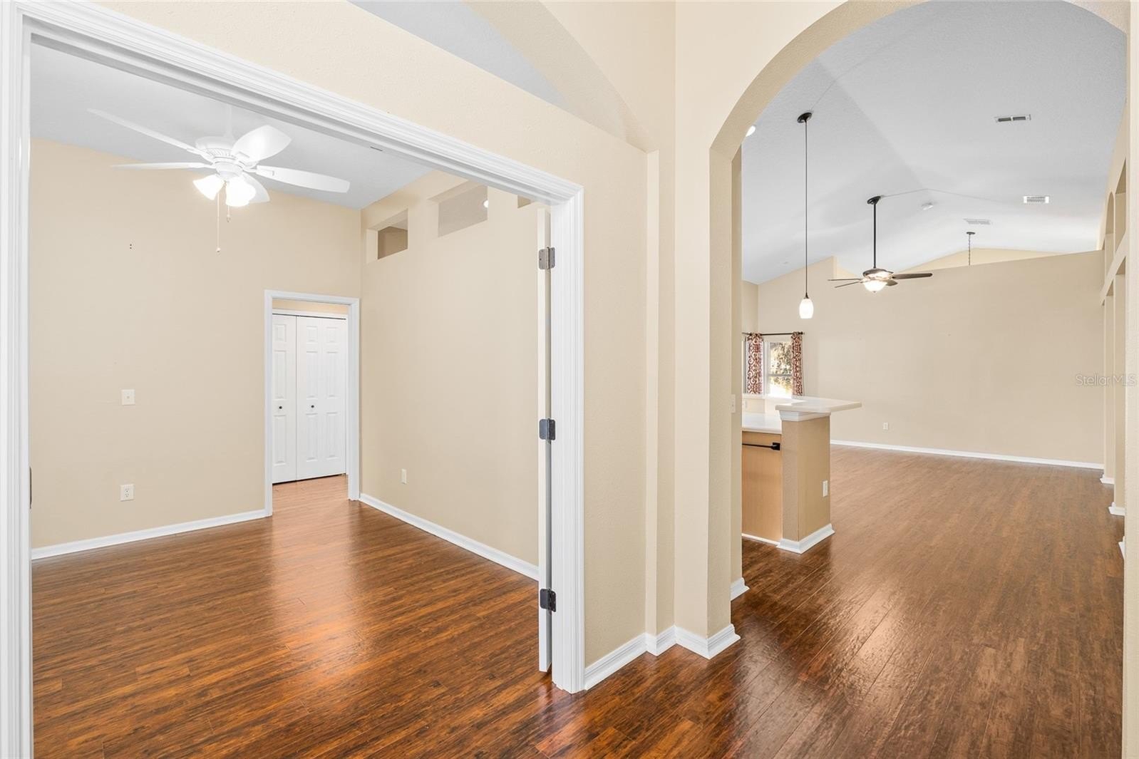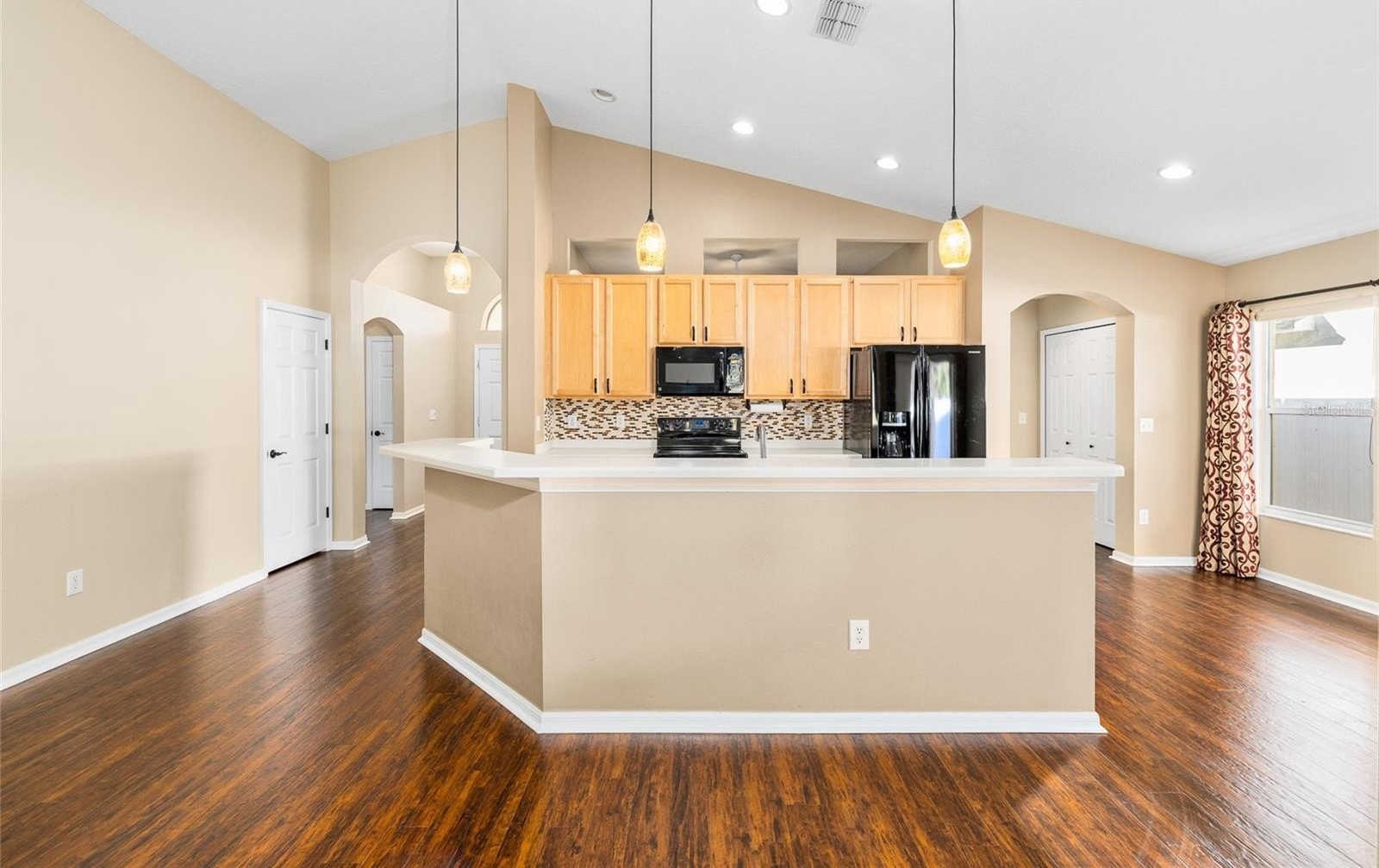Inside, the open-concept floor plan showcases laminate flooring throughout (no carpet) and neutral interior finishes. The kitchen includes Corian countertops, a center island with breakfast bar and pendant lighting, tall maple cabinetry, stainless steel appliances, farmhouse sink, and pantry. The living room features a built-in media wall, and the formal dining area provides access to the covered lanai overlooking the rear yard.