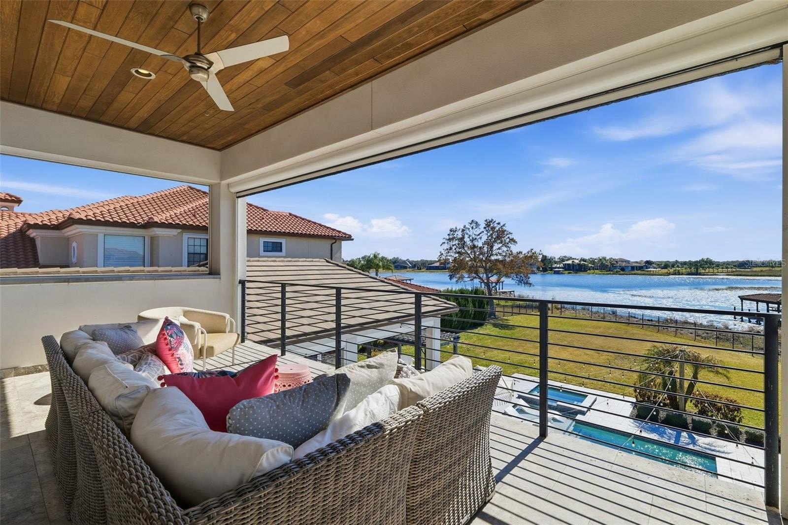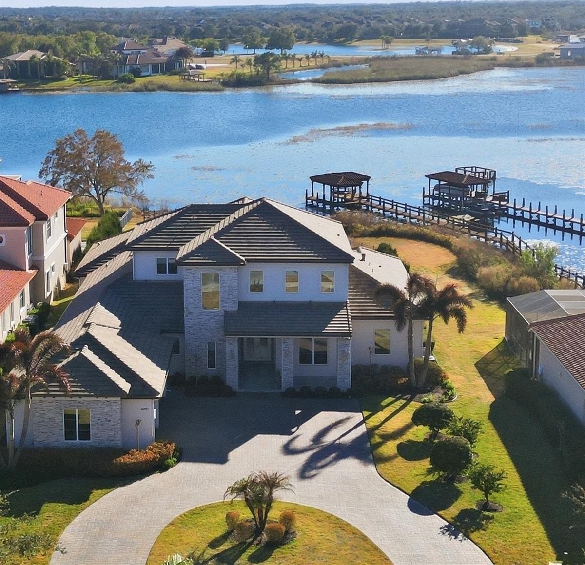 Luxury meets laid-back lake living on Lake Hancock in Winter Garden, inside the sought-after Independence community with parks, trails, and a true neighborhood feel. Custom built by Brierhill Homes, recognized as MCBC Builder of the Year, and professionally designed/furnished by Gilmore Design Co., this exceptional direct lakefront residence sits on one of the area’s largest lots—with an oversized, fully fenced backyard—perfect for entertaining—where you can enjoy stunning sunsets over the water and catch the Disney fireworks on select nights. Arrive via an impressive circular drive and step into a striking entry featuring a custom front door, polished natural stone flooring, and a dramatic stone accent wall—framed by a deep, covered front porch with a rich wood-plank ceiling that immediately sets the tone. It’s a welcoming space that’s perfect for a small seating area to enjoy morning coffee or greet guests in style. Inside, the home is bright, elevated, and designed for both entertaining and everyday comfort, highlighted by a timeless coastal-modern palette with white oak flooring, a beautiful white oak staircase with integrated LED lighting under each step, and custom ceiling details throughout (including soffit/tray accents and integrated lighting). The layout offers 5 bedrooms, each with a private en-suite bathroom and walk-in closet, and each bedroom includes blackout honeycomb shades for comfort and privacy—including a stunning first-floor primary suite with serene lake and backyard views, plus a dedicated first-floor guest suite. You’ll also love the private office and a media room that easily works as a flex space (playroom, gym, second lounge, or homework room). At the heart of the home, the chef’s kitchen showcases Thermador appliances and a show-stopping double island topped with Cambria quartz with subtle gold veining, plus a custom chevron-designed backsplash with under-cabinet LED lighting that highlights the detail beautifully. The kitchen flows seamlessly into the main living space for true indoor-outdoor living. A wall of living room sliding glass doors opens wide, creating one expansive space that connects the interior to the lanai, pool, and lake beyond. Enjoy built-in Sonos sound in the living room and kitchen, with audio extended to the outdoor kitchen as well—plus the flex/media space is pre-wired if additional speakers are desired. The living room also features a sleek gas fireplace framed in natural stone, flanked by custom built-ins for a clean, designer finish. Out back, unwind in your private retreat with a heated pool and spa, generous covered areas, and a summer kitchen made for sunset dinners. The first-floor lanai (including the summer kitchen) and the second-floor balcony are both fully encapsulated with motorized screens controlled by remote—perfect for effortless, bug-free evenings and both outdoor living areas feature a warm wood-plank ceiling accent that brings a high-end, resort feel. Additional highlights include a whole-home water softener/filtration system (low/zero maintenance), a built-in security system with exterior cameras, built-in Sonos audio, and whole-home smart lighting with keypad controls and scene presets—plus an oversized 3-car garage. Select furniture may be purchased separately upon request.
