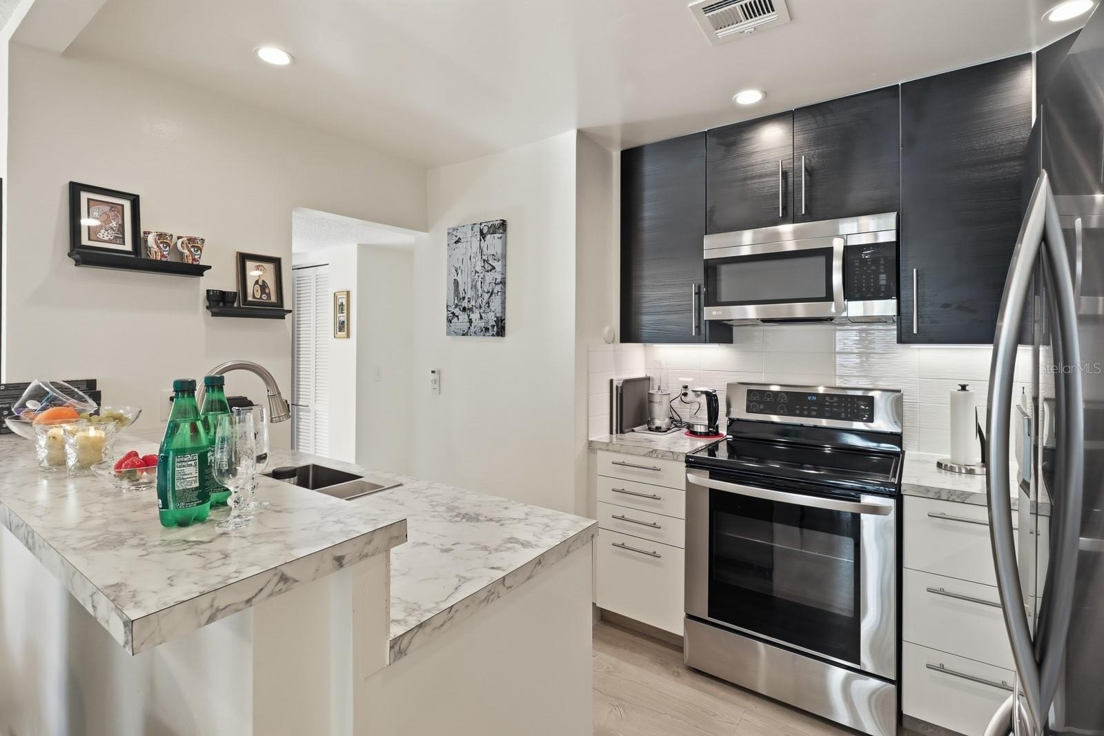 Step inside to discover laminate and tile flooring throughout — NO CARPET ANYWHERE— creating a clean, cohesive look that’s both stylish and easy to maintain. The fully remodeled kitchen features updated cabinetry, contemporary fixtures, and upgraded finishes that make cooking and entertaining a pleasure. Both bathrooms were tastefully renovated with modern vanities, updated tile work, and sleek fixtures.