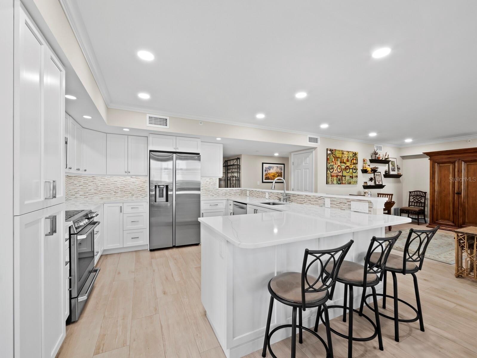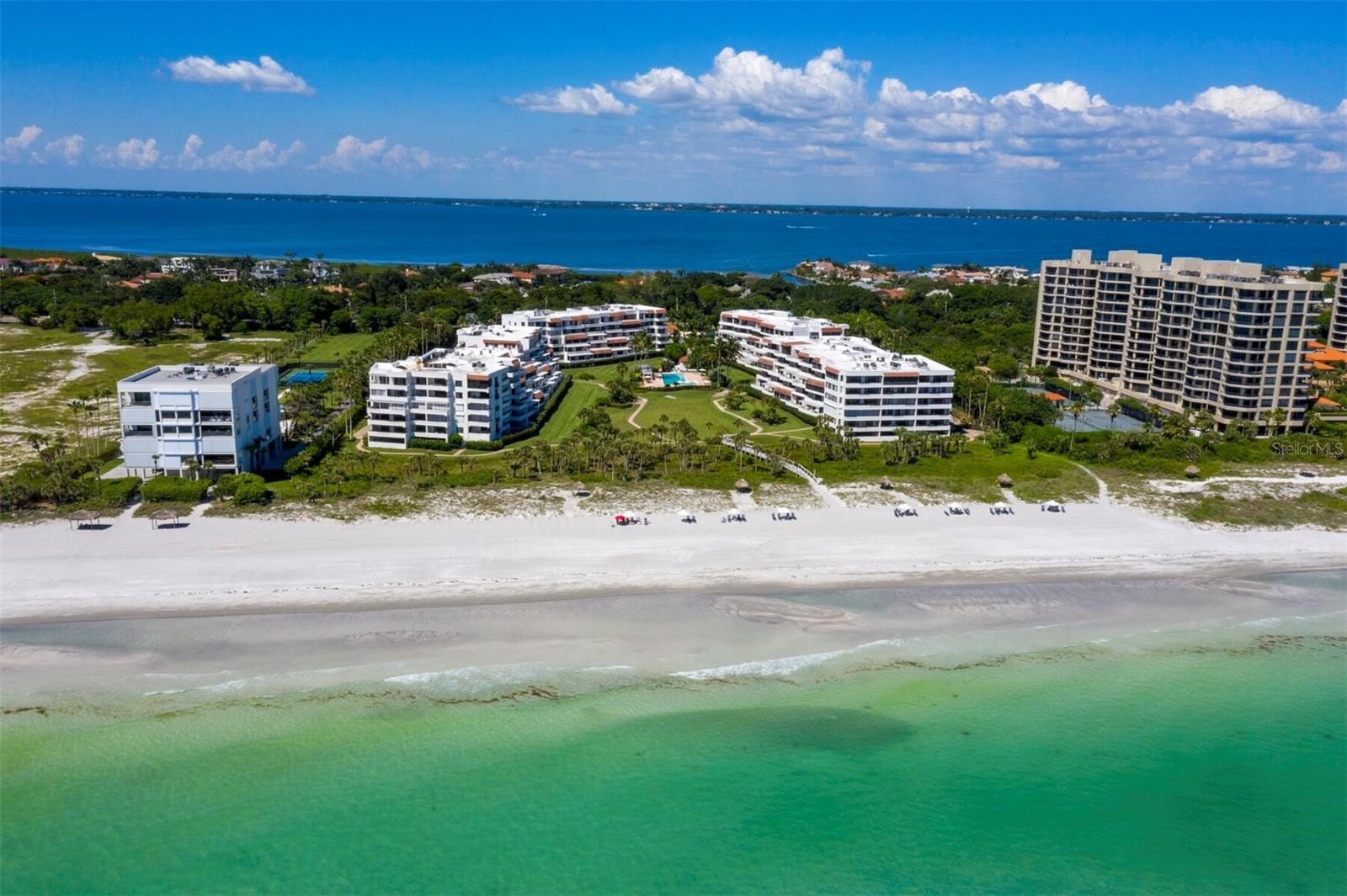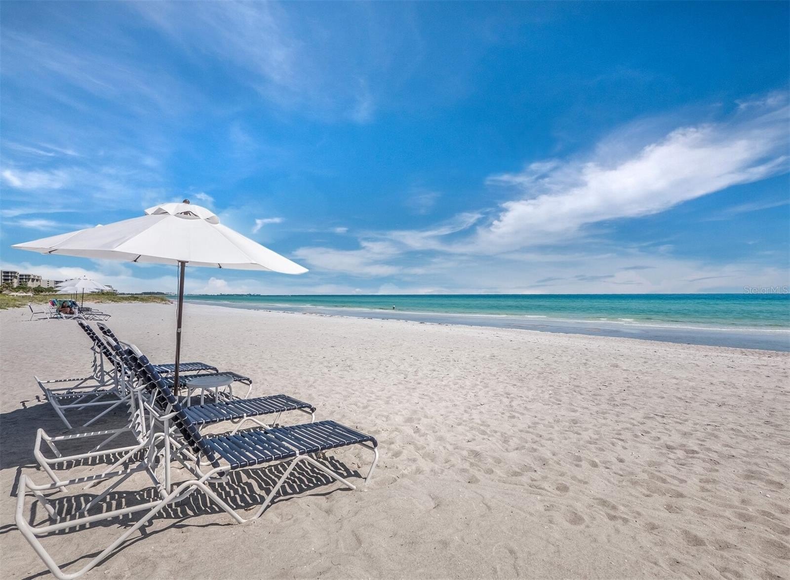 With the Gulf just beyond the terrace, this first-floor two-bedroom, three-bath residence at The Players Club offers direct beachfront living, where uninterrupted water views and the steady rhythm of the shoreline shape daily life. Updated in 2021–2022 and move-in ready, the residence spans approximately 1,971 square feet and has been redesigned to emphasize its coastal setting. High-impact glass, recessed lighting, and a neutral interior palette create a bright, understated backdrop throughout. The open kitchen connects to the main living areas and features white quartz countertops, coordinating cabinetry, stainless steel appliances, and a tile backsplash. A solarium just off the kitchen provides flexible space for an office or den and is finished with plantation shutters. Adjacent to the solarium is the third full bathroom and closet. The living room opens to the terrace through a wall of sliding glass doors, extending the living space outdoors. The private terrace spans approximately 30 feet and overlooks the beach and Gulf, offering a comfortable setting for dining, relaxing, or entertaining. The split-bedroom floor plan provides privacy, with a guest suite that includes an updated en-suite bath. The primary suite opens directly to the terrace and features a walk-in closet and an updated bath with dual vanities and a glass-enclosed shower with built-in bench. Additional features include in-residence laundry, extra storage, and under-building parking. Located on the southern end of Longboat Key, The Players Club offers 560 feet of private beach frontage, a 24-hour guarded gate, on-site management, Har-Tru tennis courts, pickleball courts, a heated saltwater pool and spa, and a recently refreshed clubhouse.
