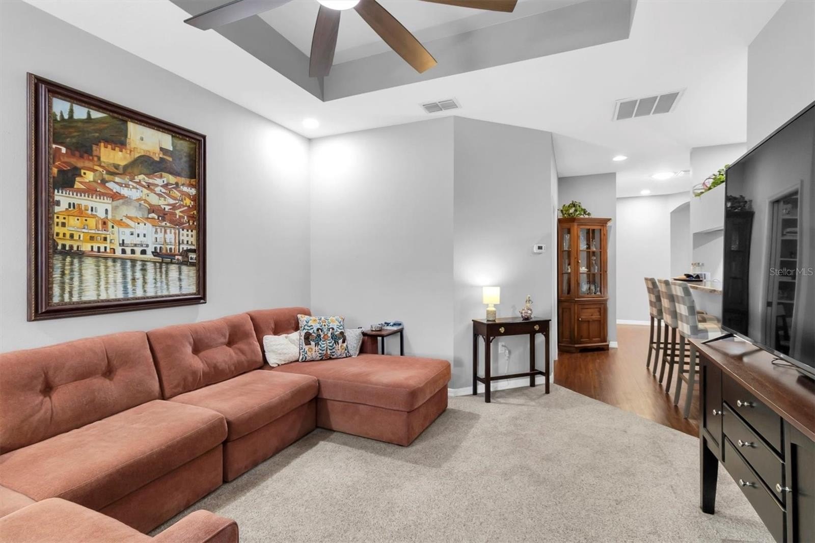 This thoughtfully designed residence features 2 bedrooms, 2 bathrooms, and a versatile bonus room ideal for a home office or flex space. As a former model home, it showcases numerous upgrades, including elegant tray ceilings in both the living room and the primary suite. Another added upgrade is Impact windows . No having to put up cumbersome shutters here !