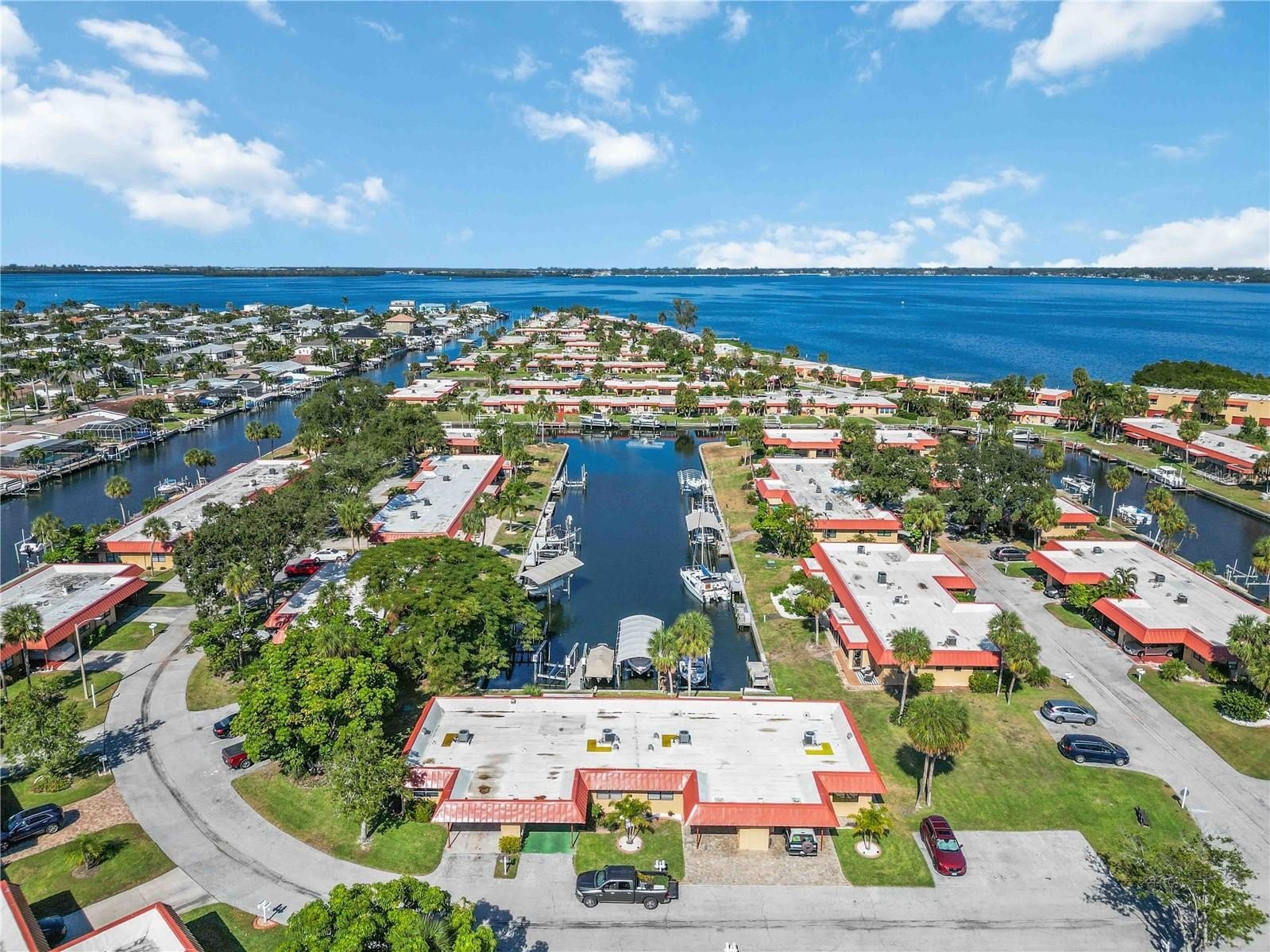 This home features a split floor plan—one bedroom with an en-suite bath, and the other perfect for guests. A covered carport with additional storage room is included, with guest parking conveniently close. Unique to this offering, this villa can be purchased alongside the adjacent fully remodeled unit. Imagine owning both side-by-side with two interchangeable boat slips—whether you prefer the larger or smaller lift, you have options to tailor your waterfront lifestyle or an offer depending on your needs.